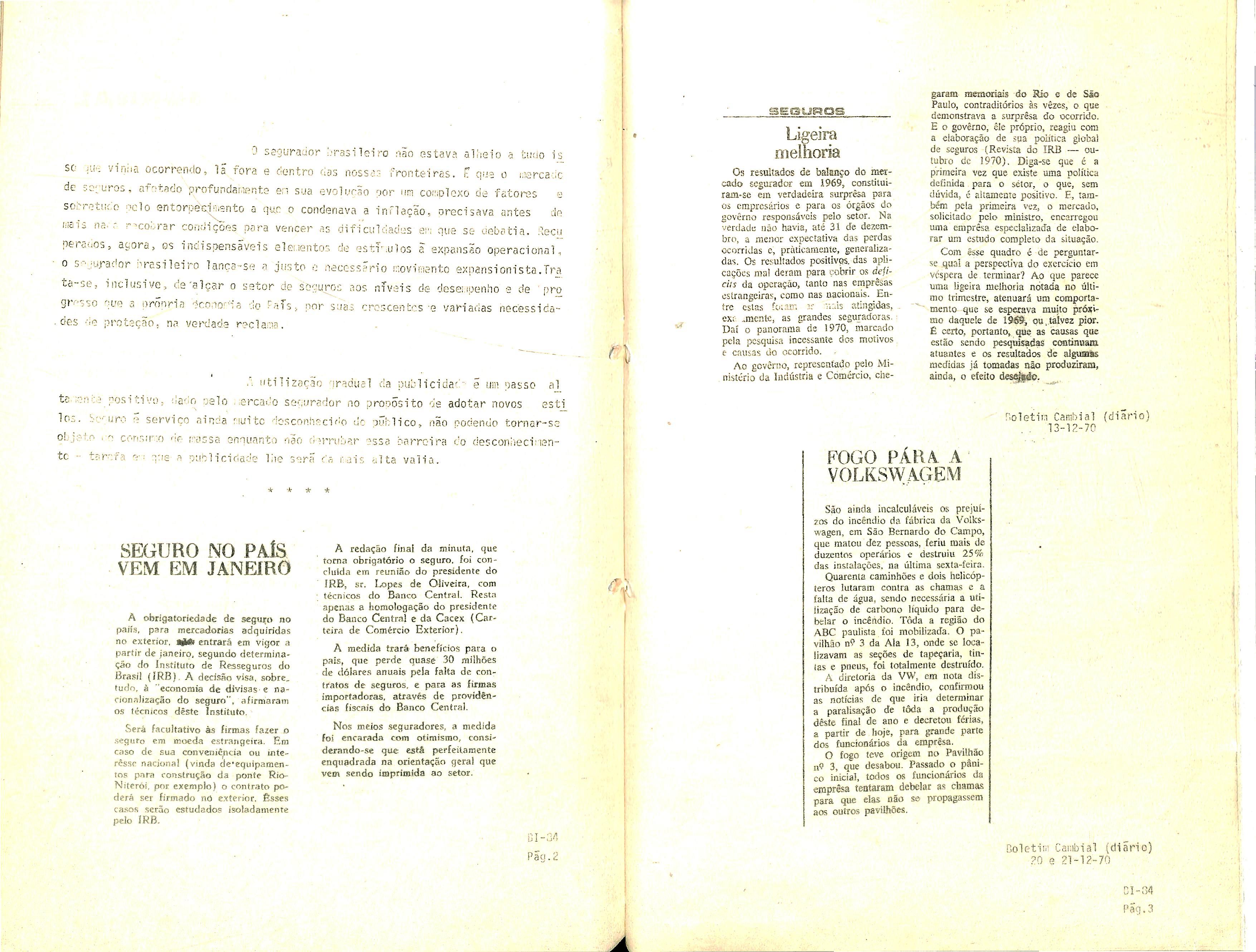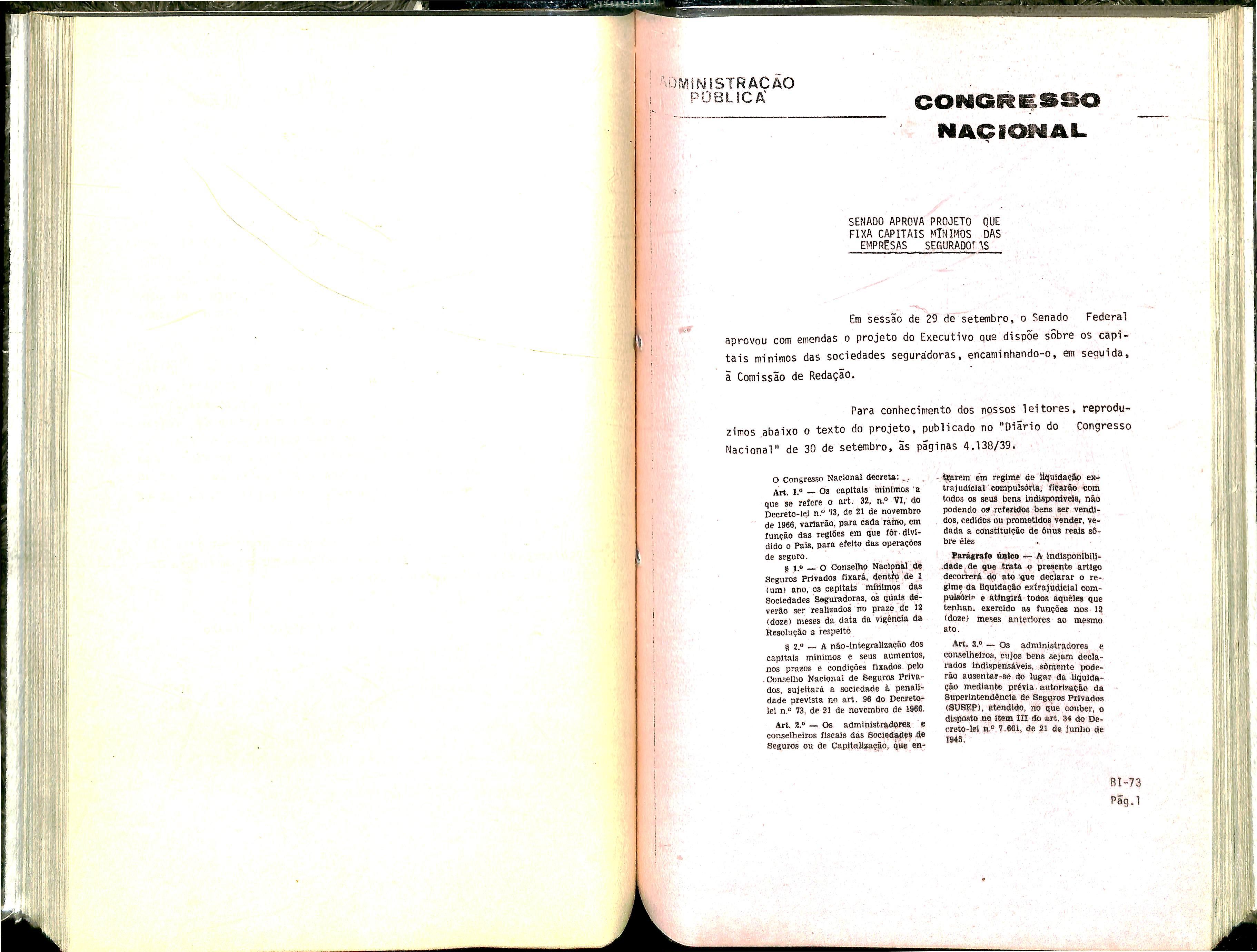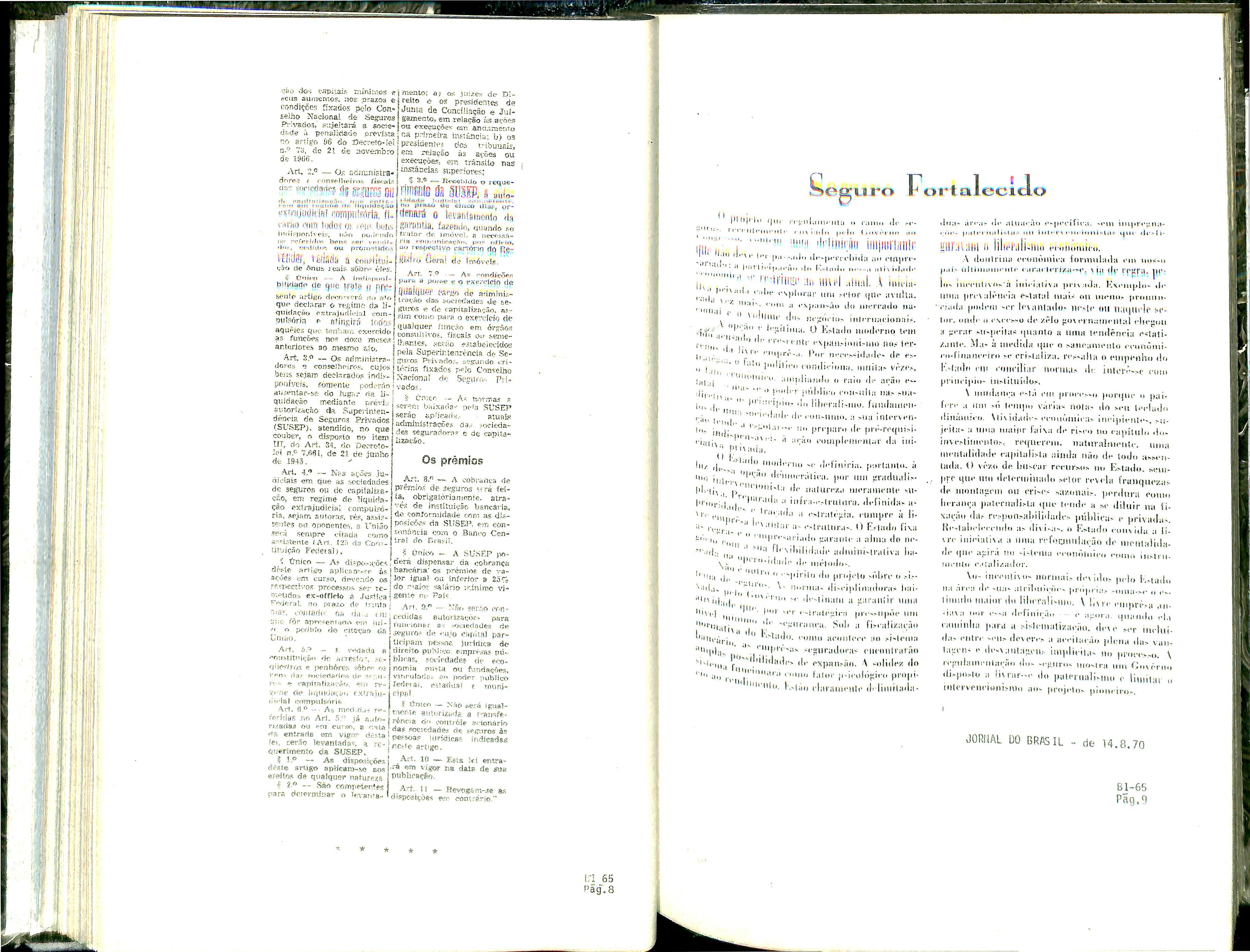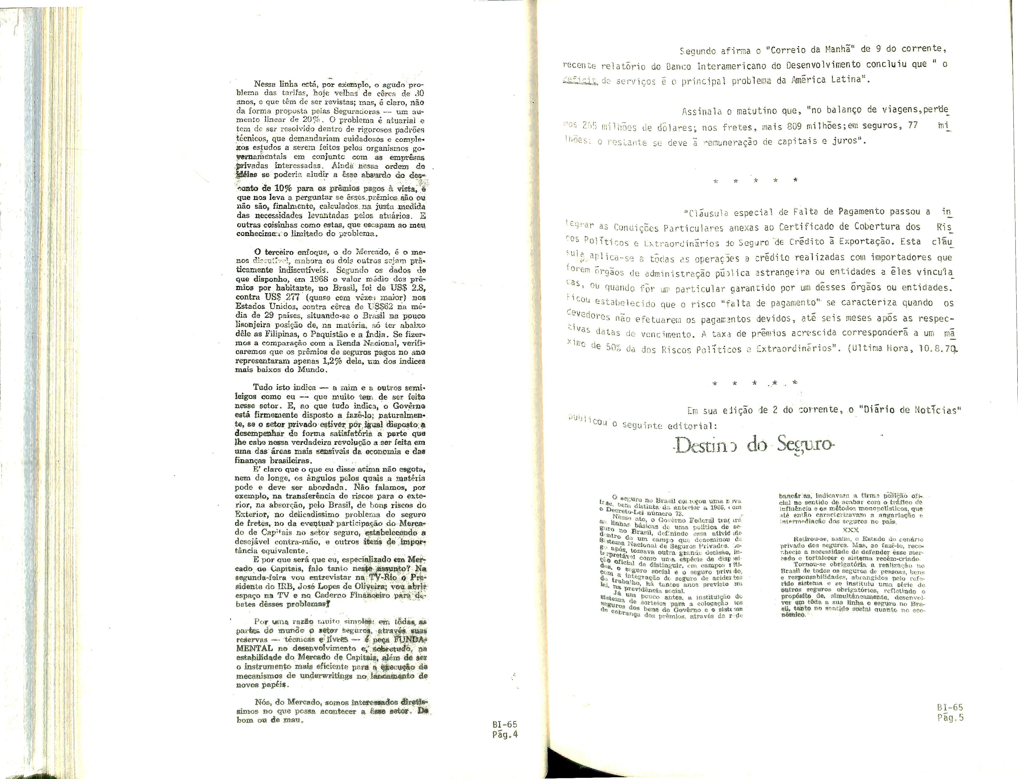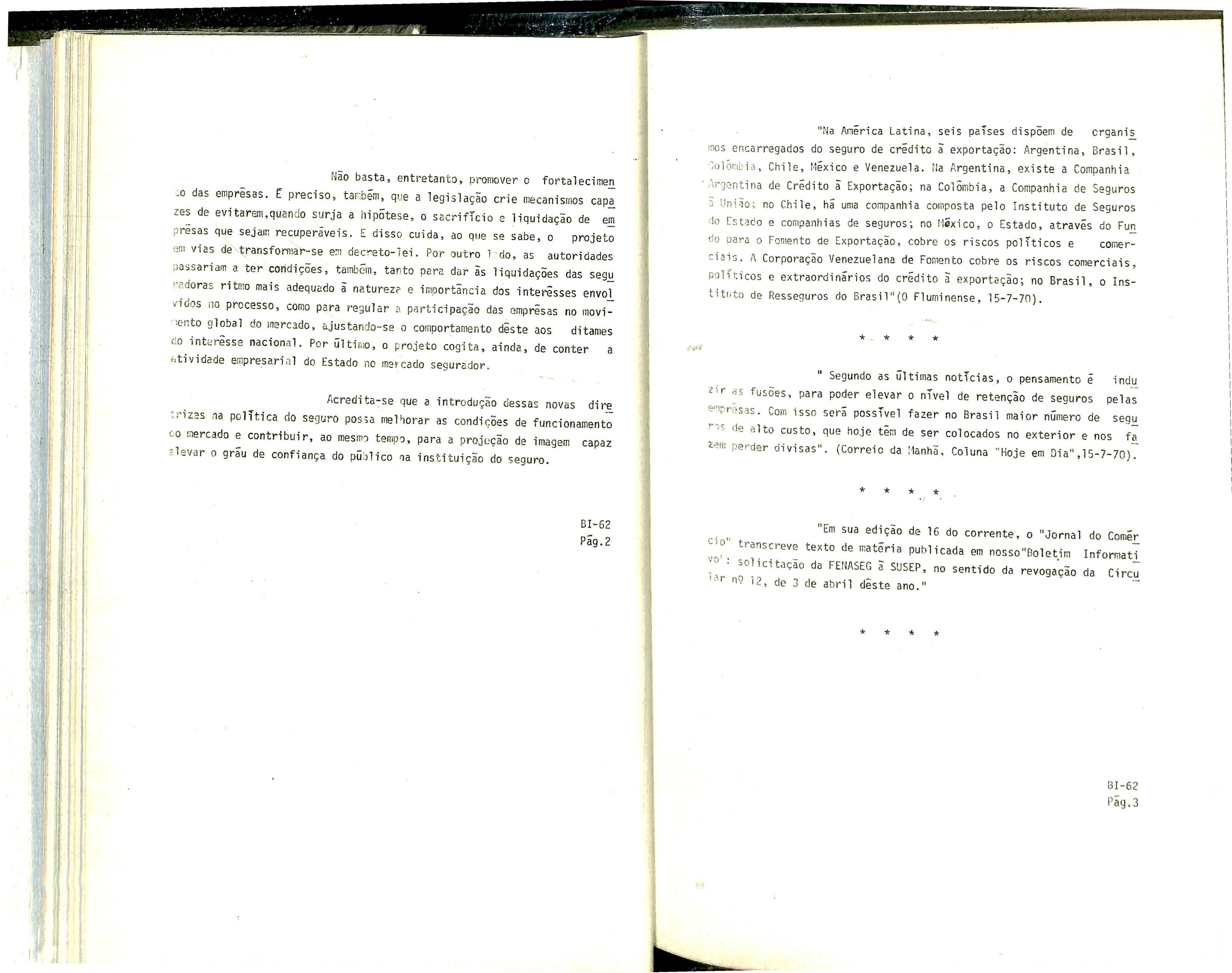 Os r esultados à e balanc o do mercado segurad or em J. 9 69, co nst it uiram-se em verd ad eira s urprêsa para us emp r esários e p a ra os ó rgãos do govê rno resp o ns á veis pelo setor Na ve rdacl i.: n ão h a via , a t é 31 óe d ezembw, <1 men or expec ta tiv a da s per_d as ocorr ida s e , pr üúc a mc.nie, general izad as Os re ultad o s p ositiv9S. d as aplicaç;<:ies mal deram pa ra çobrir os d.efcit s da operação, ta n to nas e m presas .: stra n gc irn s , como na s na~io na~S - Ent re es tas ~,, :::n~ }:· ~.:.is o.tmgidas, ex.-- Ámcn tc, a s grandes se gufaáoras. · D aí o pan o ra m a de 1970 , m arcado pe a pesq ui sa incess an te dos m otivos e ca usa s do ocorr ido.