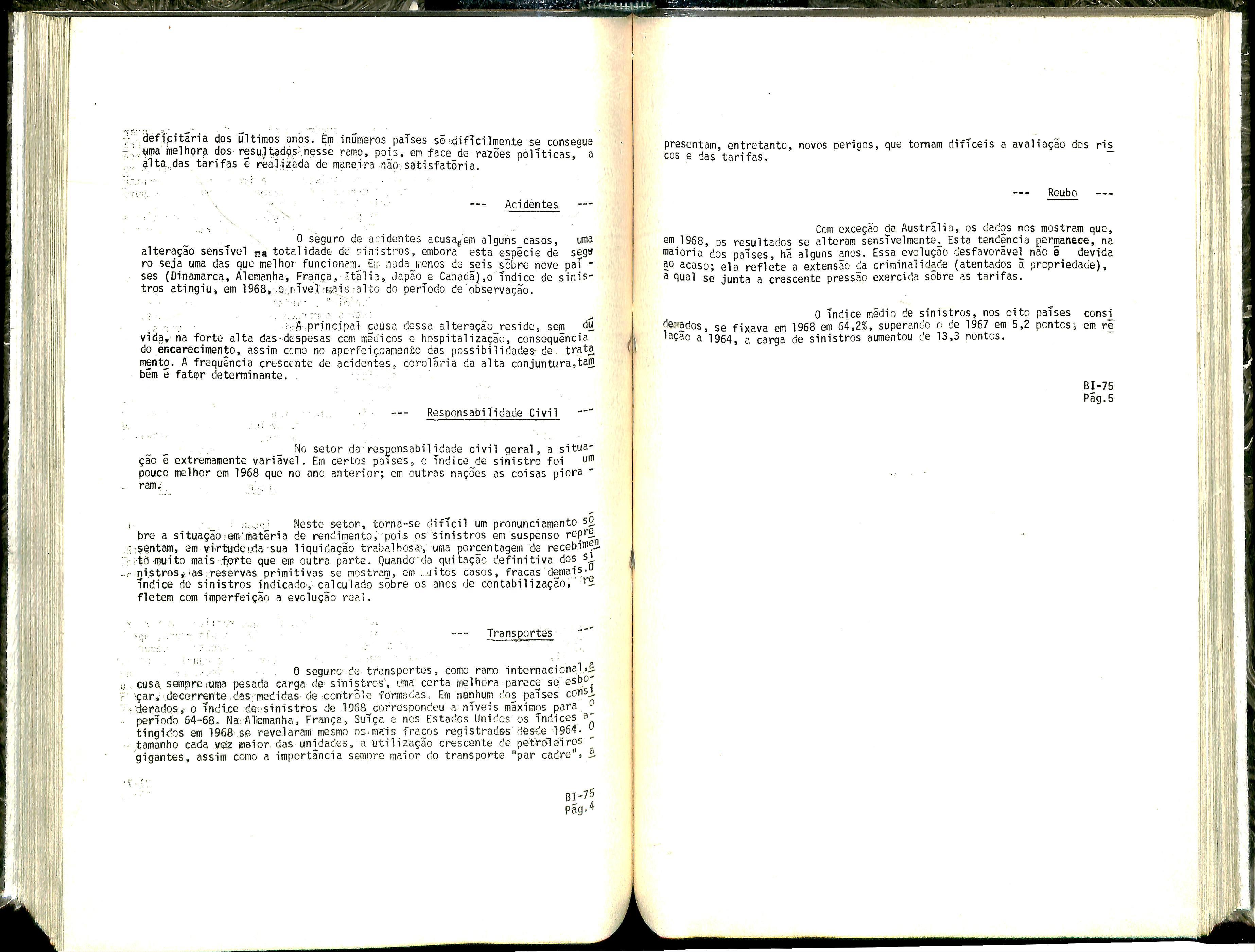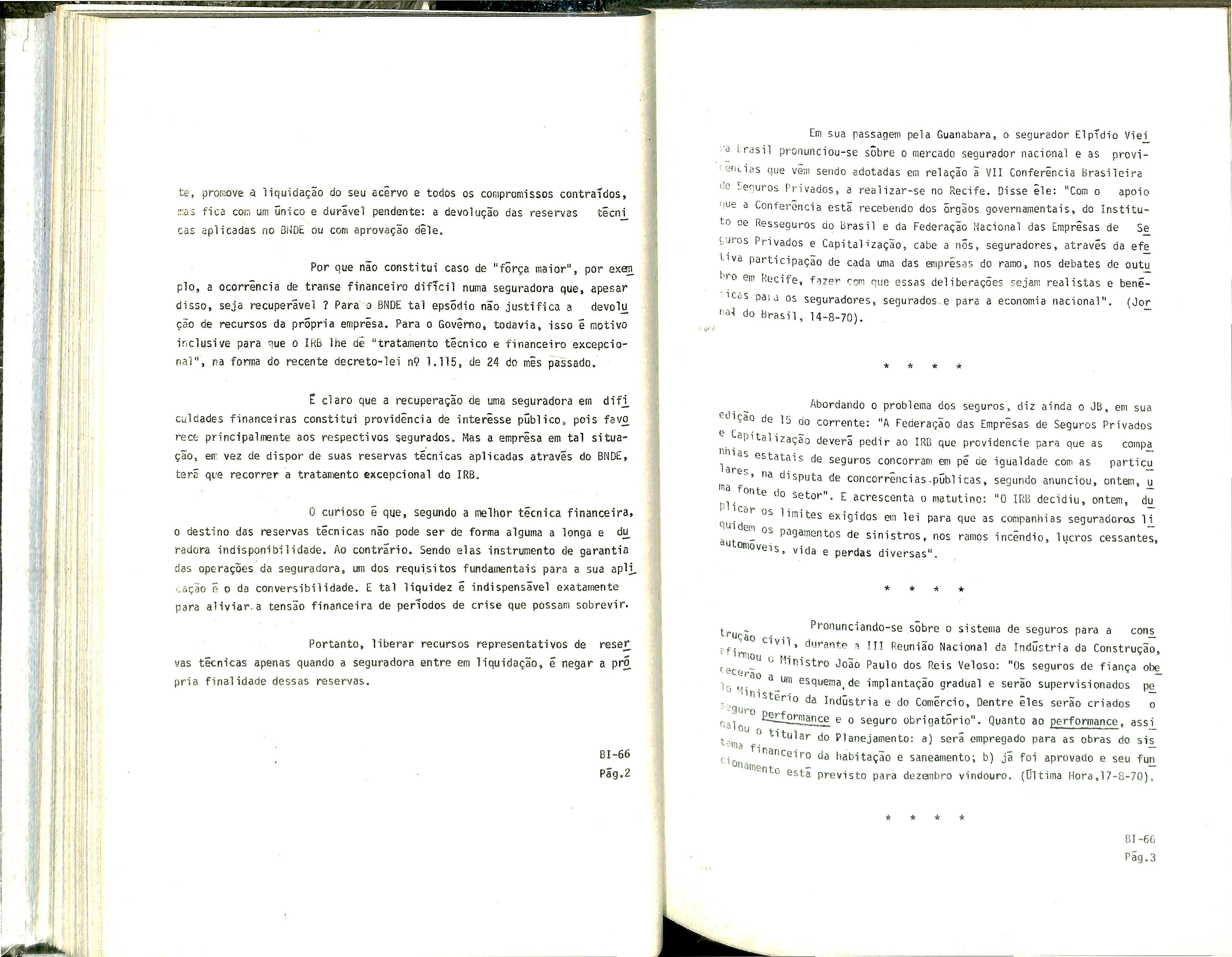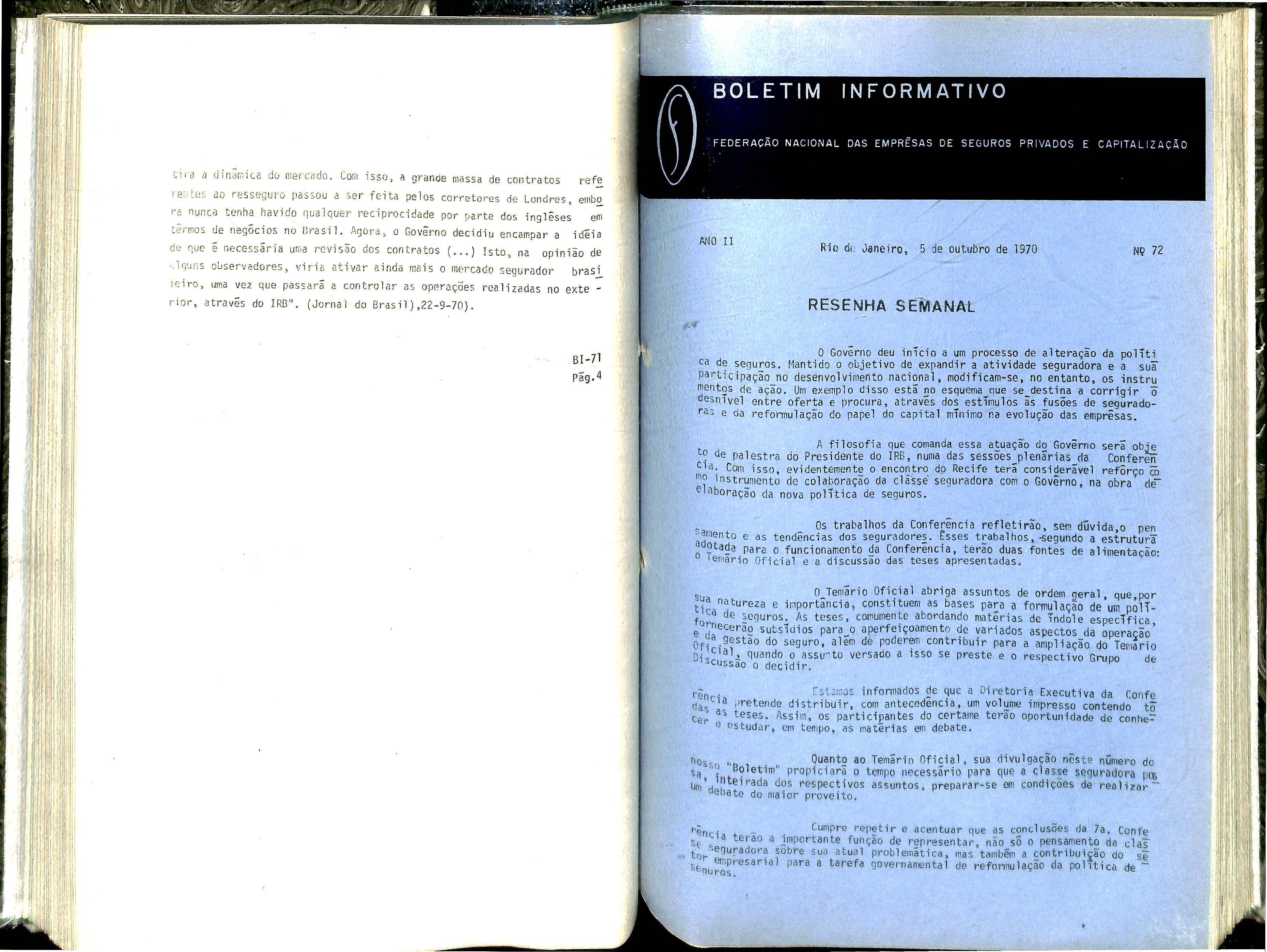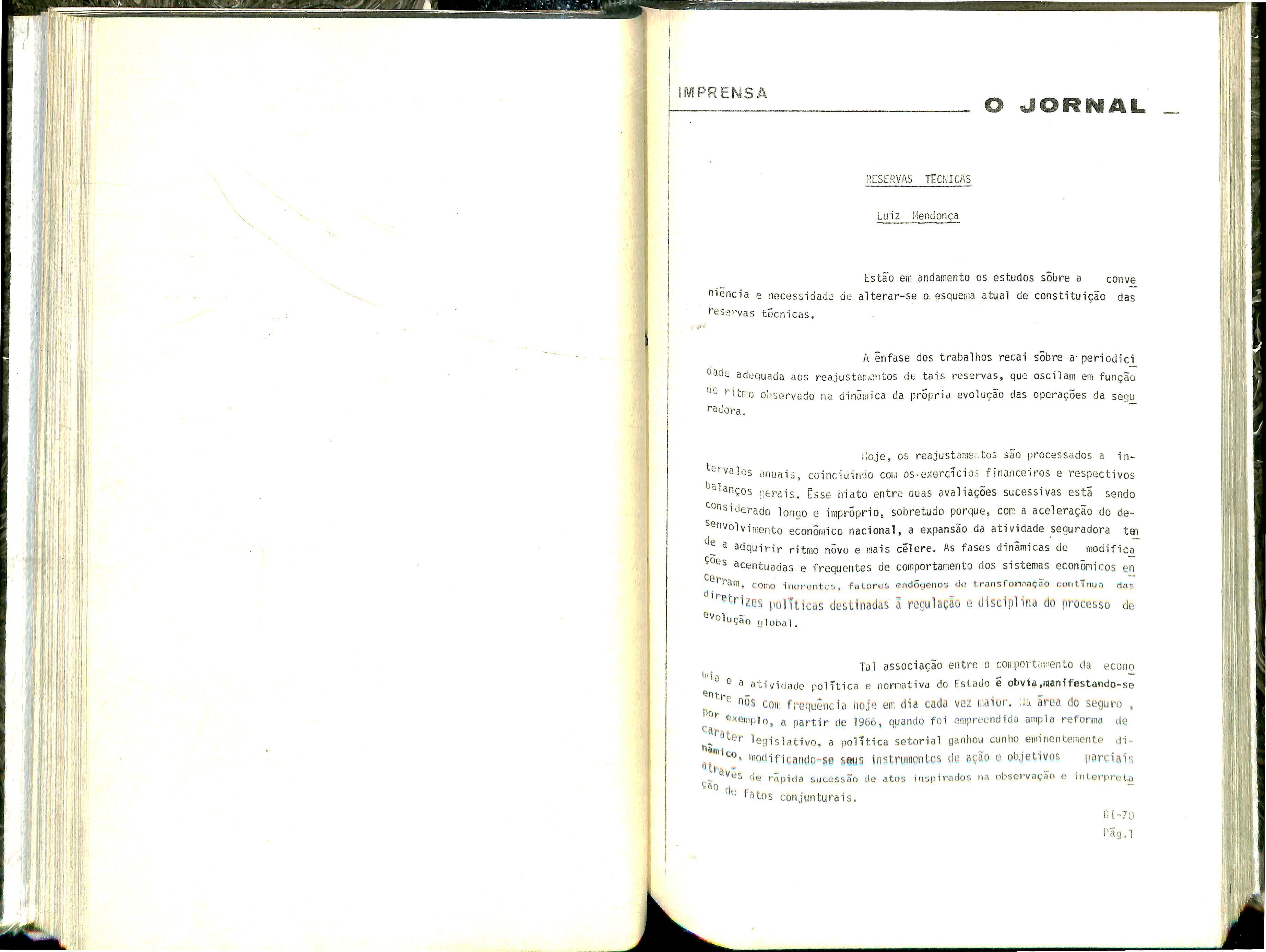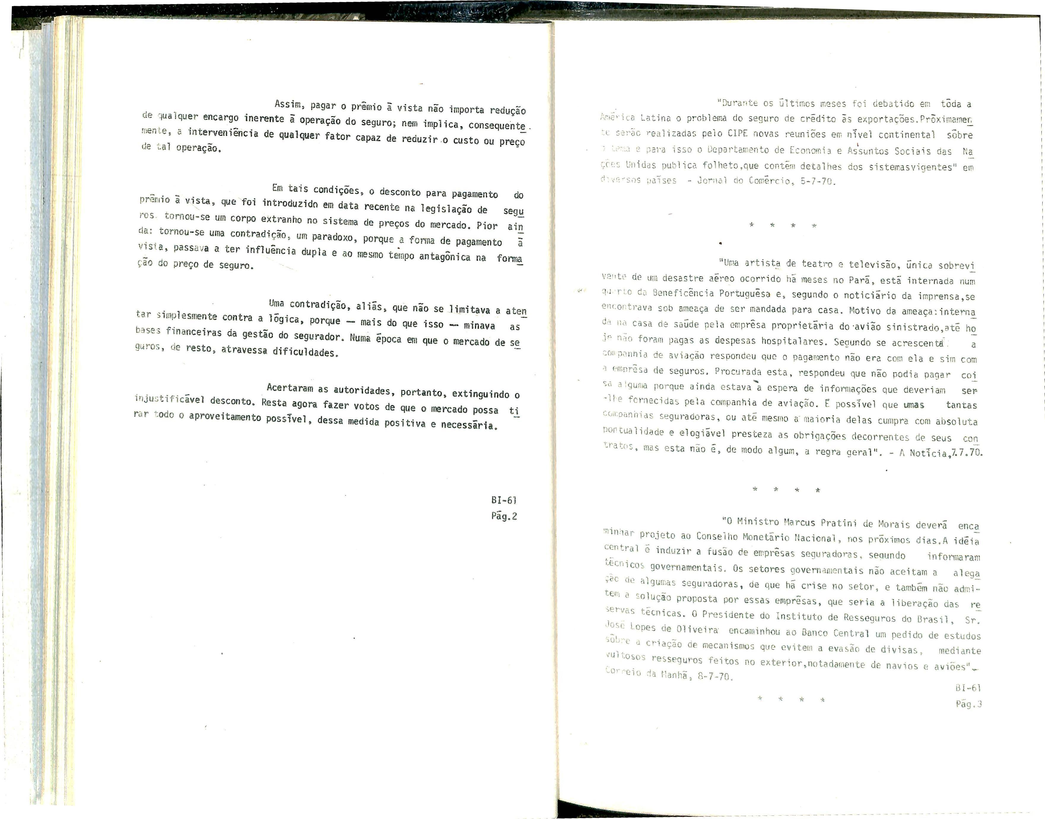 Os r esultados à e balanc o do mercado segurad or em J. 9 69, co nst it uiram-se em verd ad eira s urprêsa para us emp r esários e p a ra os ó rgãos do govê rno resp o ns á veis pelo setor Na ve rdacl i.: n ão h a via , a t é 31 óe d ezembw, <1 men or expec ta tiv a da s per_d as ocorr ida s e , pr üúc a mc.nie, general izad as Os re ultad o s p ositiv9S. d as aplicaç;<:ies mal deram pa ra çobrir os d.efcit s da operação, ta n to nas e m presas .: stra n gc irn s , como na s na~io na~S - Ent re es tas ~,, :::n~ }:· ~.:.is o.tmgidas, ex.-- Ámcn tc, a s grandes se gufaáoras. · D aí o pan o ra m a de 1970 , m arcado pe a pesq ui sa incess an te dos m otivos e ca usa s do ocorr ido.