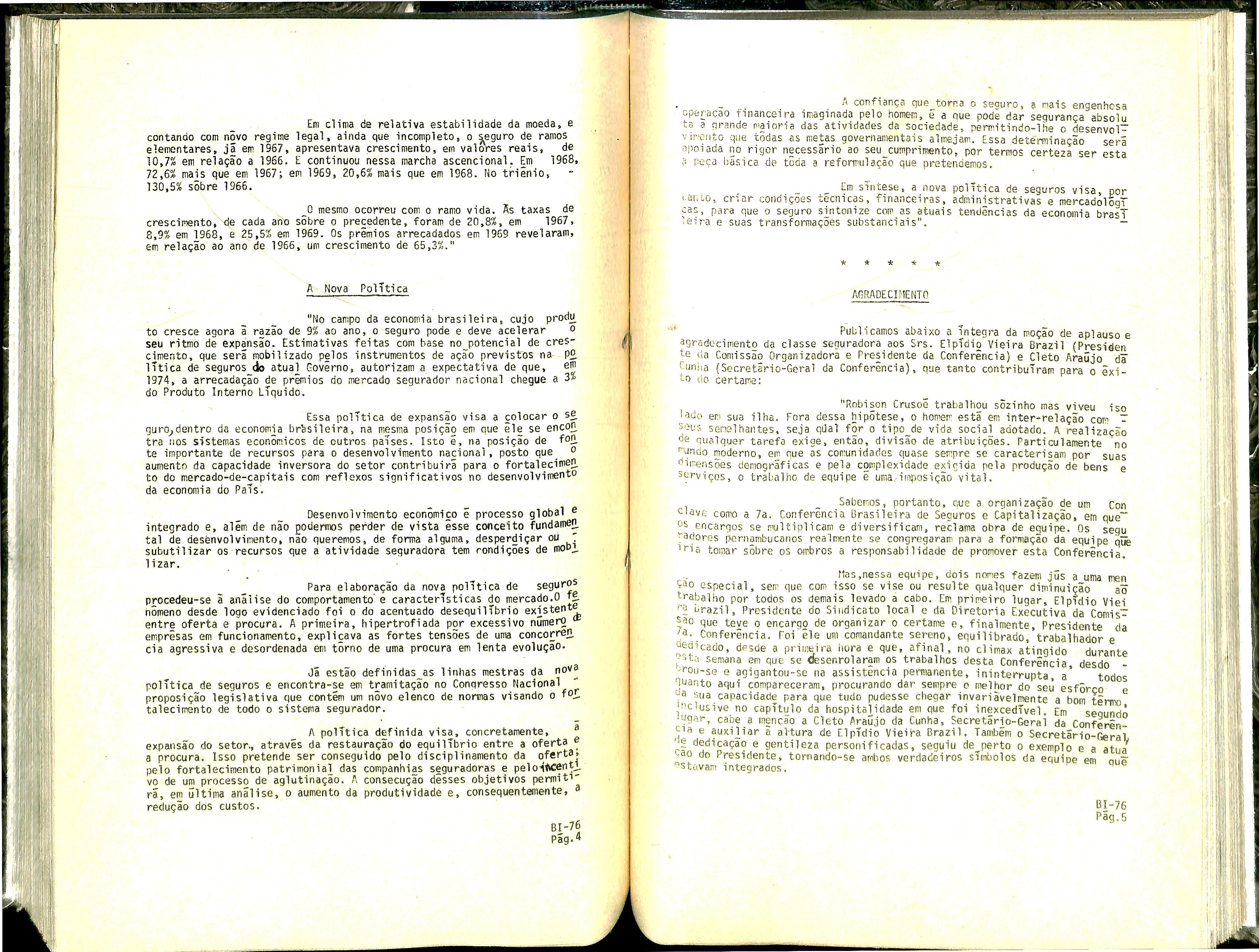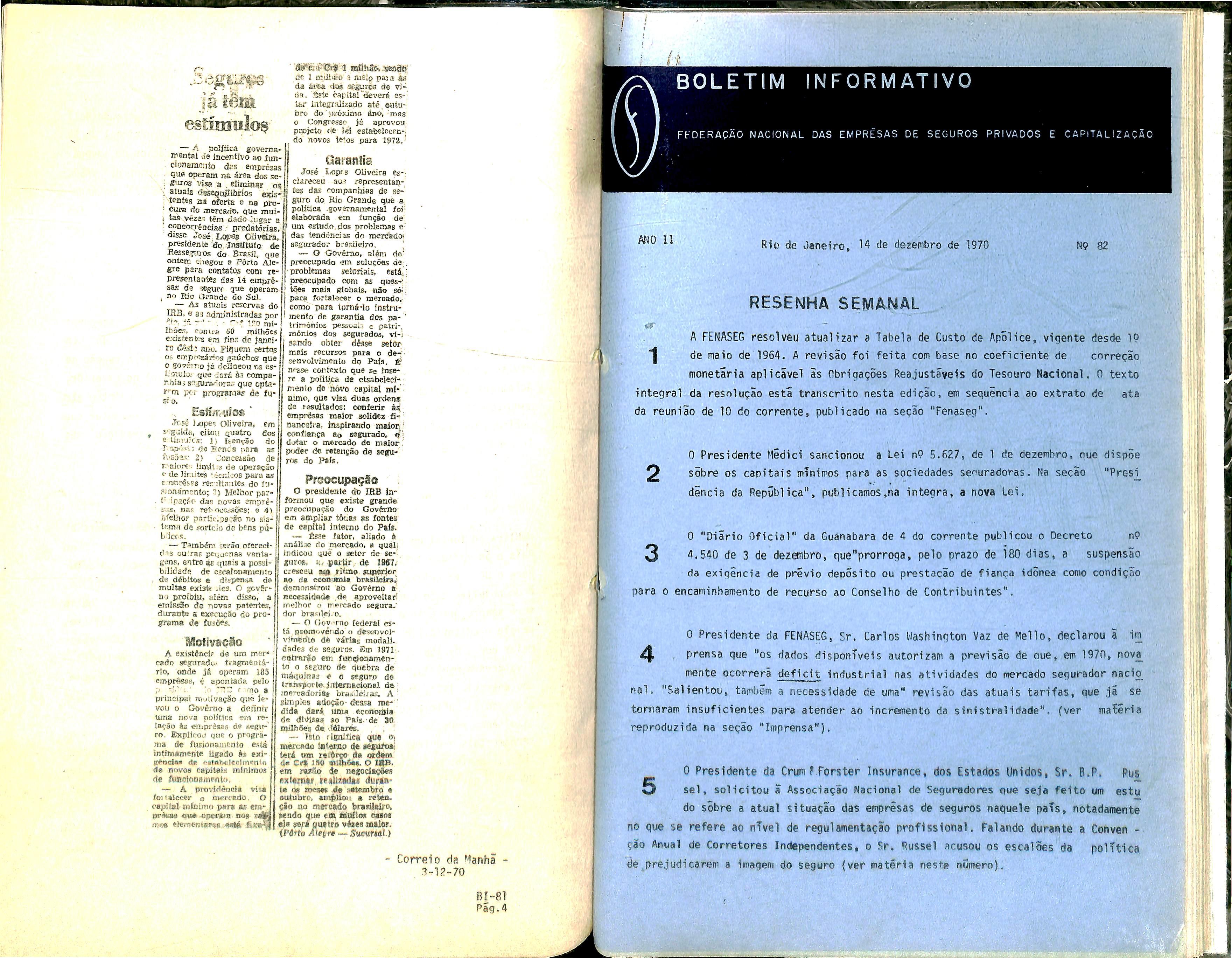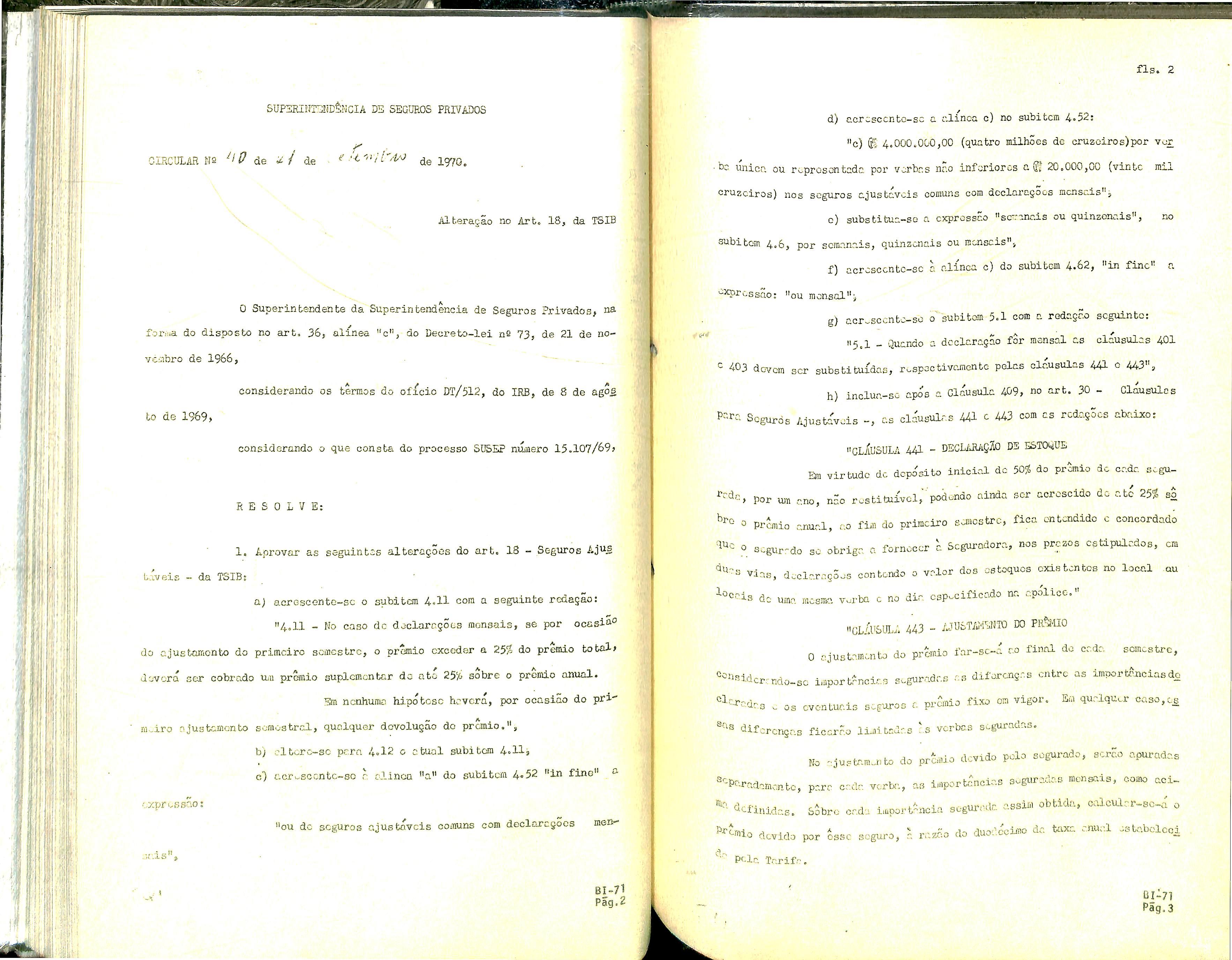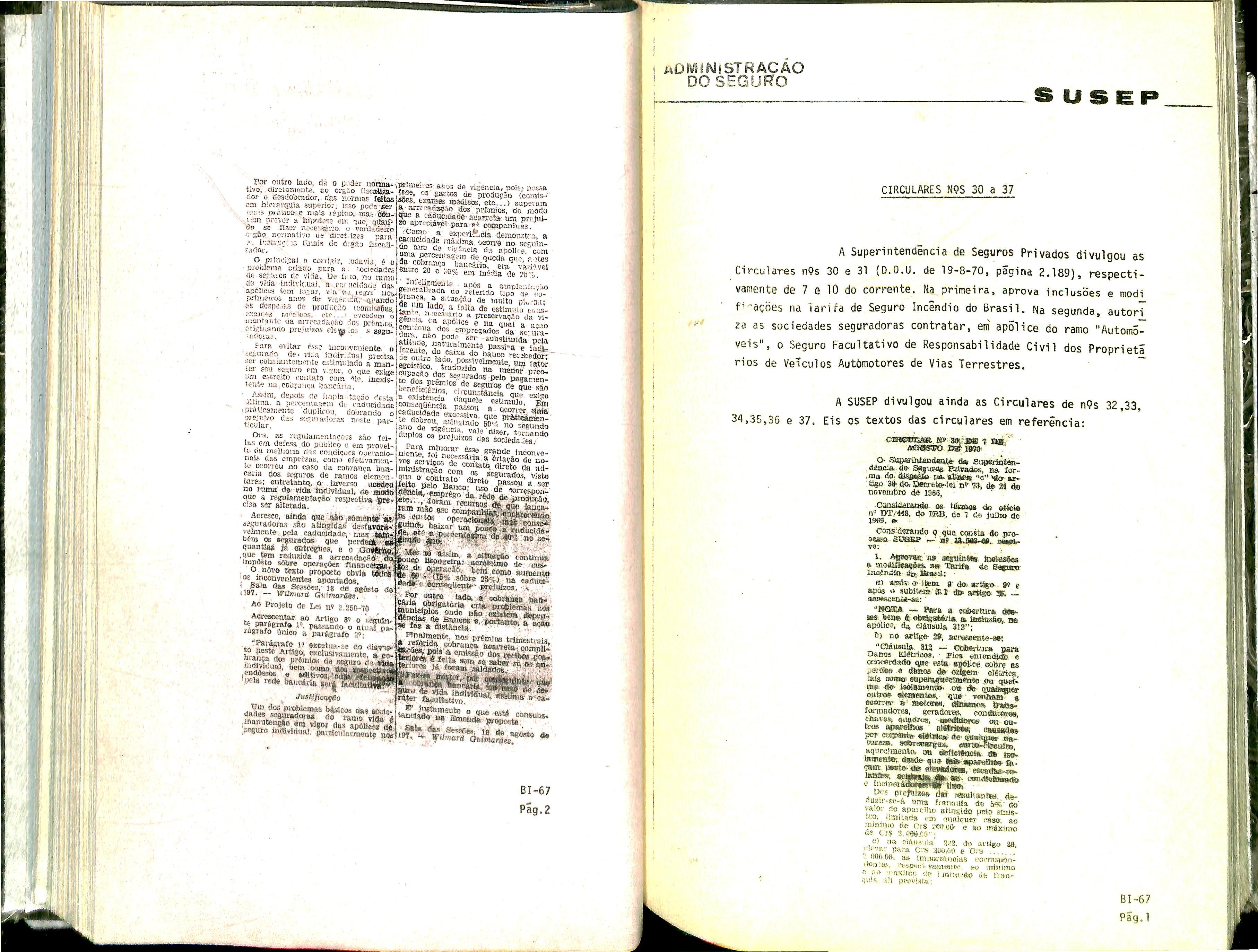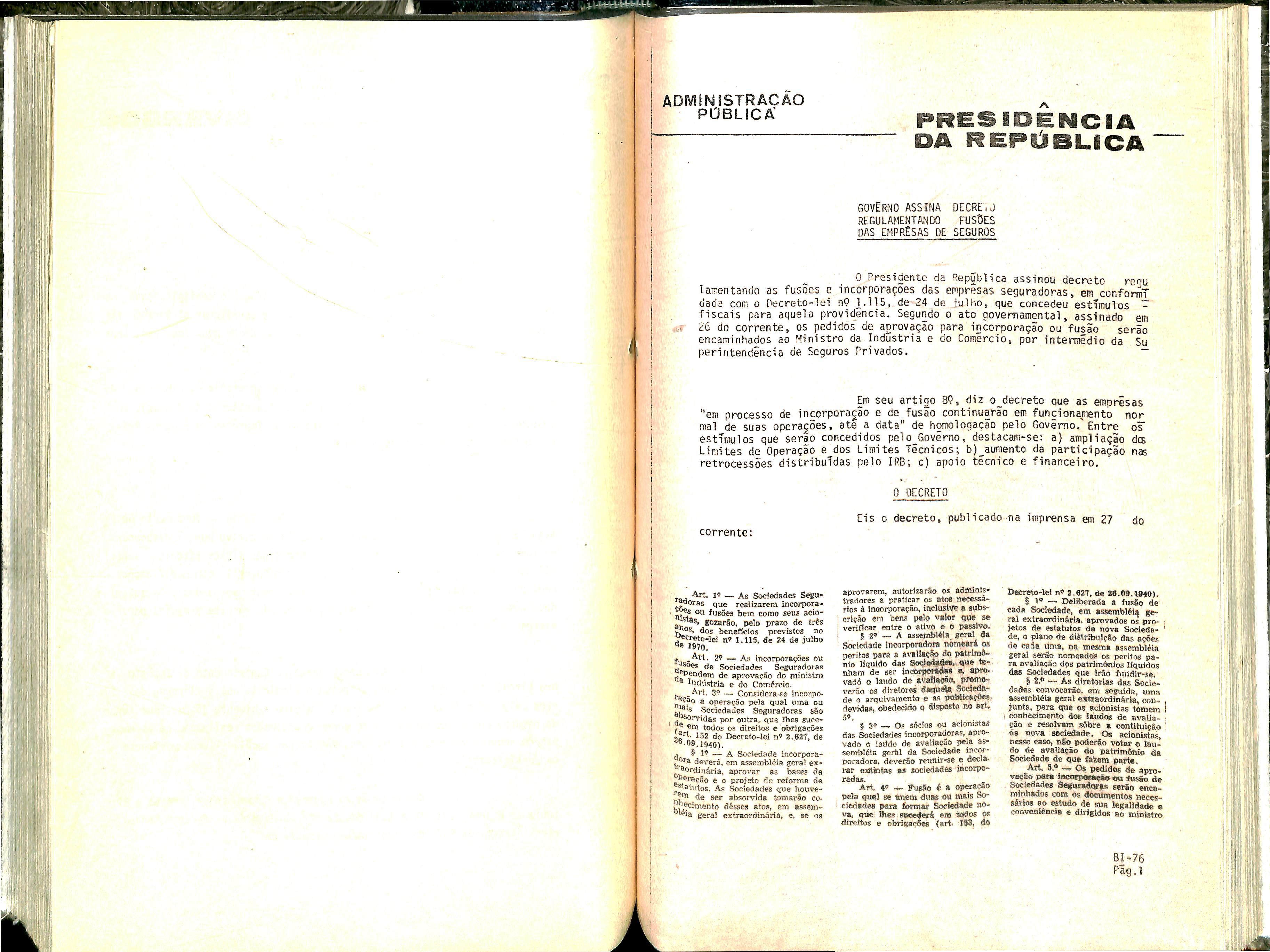 Os r esultados à e balanc o do mercado segurad or em J. 9 69, co nst it uiram-se em verd ad eira s urprêsa para us emp r esários e p a ra os ó rgãos do govê rno resp o ns á veis pelo setor Na ve rdacl i.: n ão h a via , a t é 31 óe d ezembw, <1 men or expec ta tiv a da s per_d as ocorr ida s e , pr üúc a mc.nie, general izad as Os re ultad o s p ositiv9S. d as aplicaç;<:ies mal deram pa ra çobrir os d.efcit s da operação, ta n to nas e m presas .: stra n gc irn s , como na s na~io na~S - Ent re es tas ~,, :::n~ }:· ~.:.is o.tmgidas, ex.-- Ámcn tc, a s grandes se gufaáoras. · D aí o pan o ra m a de 1970 , m arcado pe a pesq ui sa incess an te dos m otivos e ca usa s do ocorr ido.