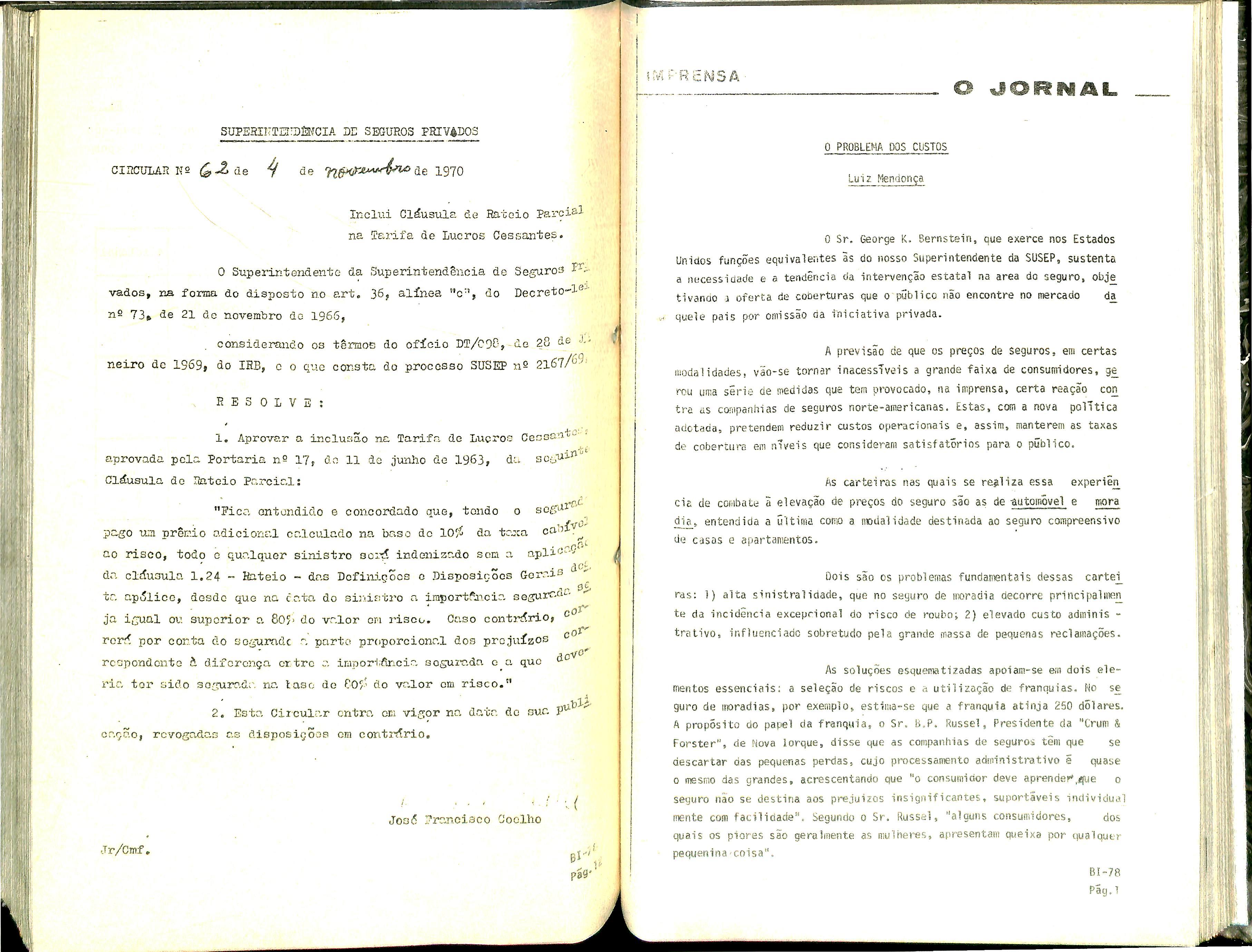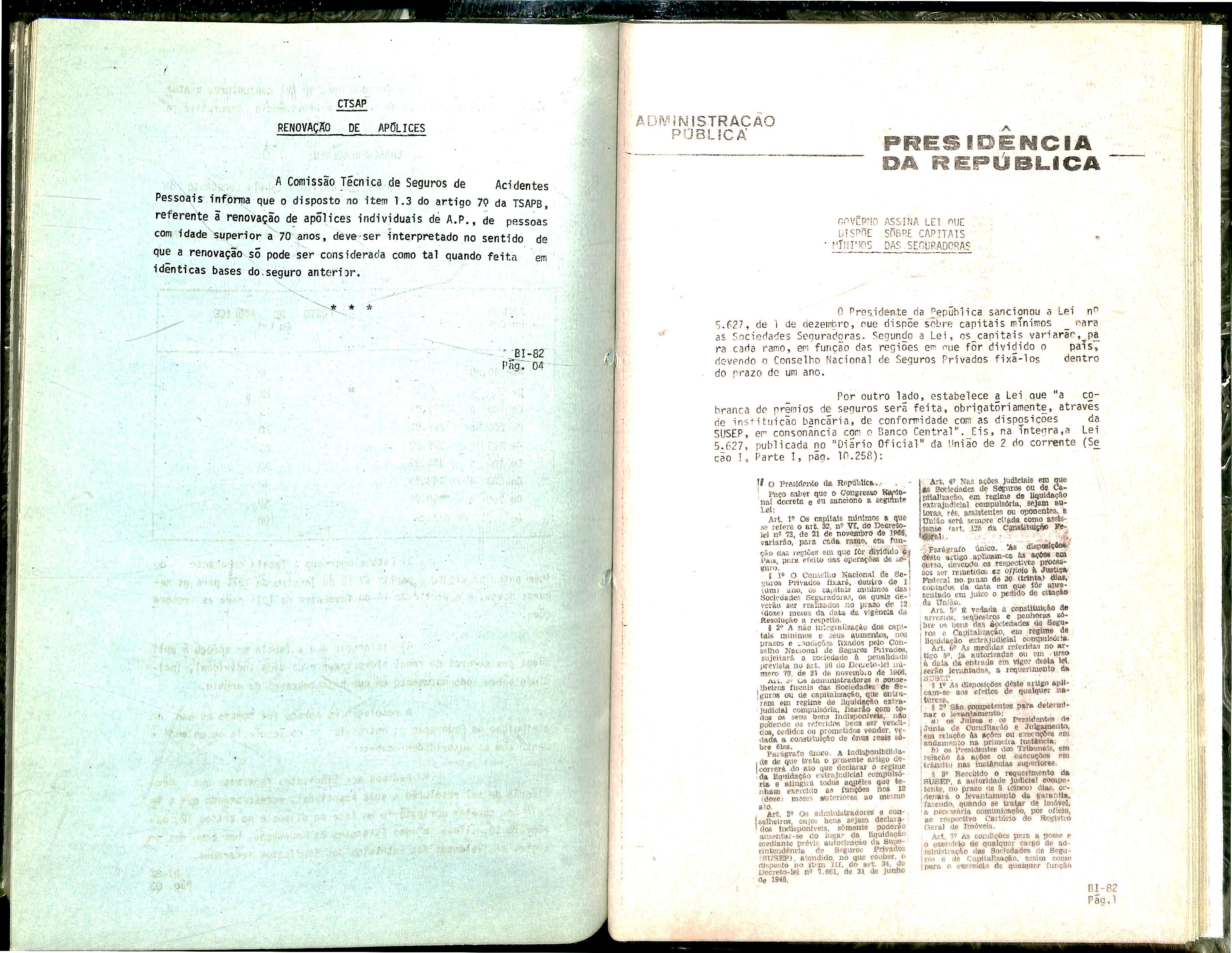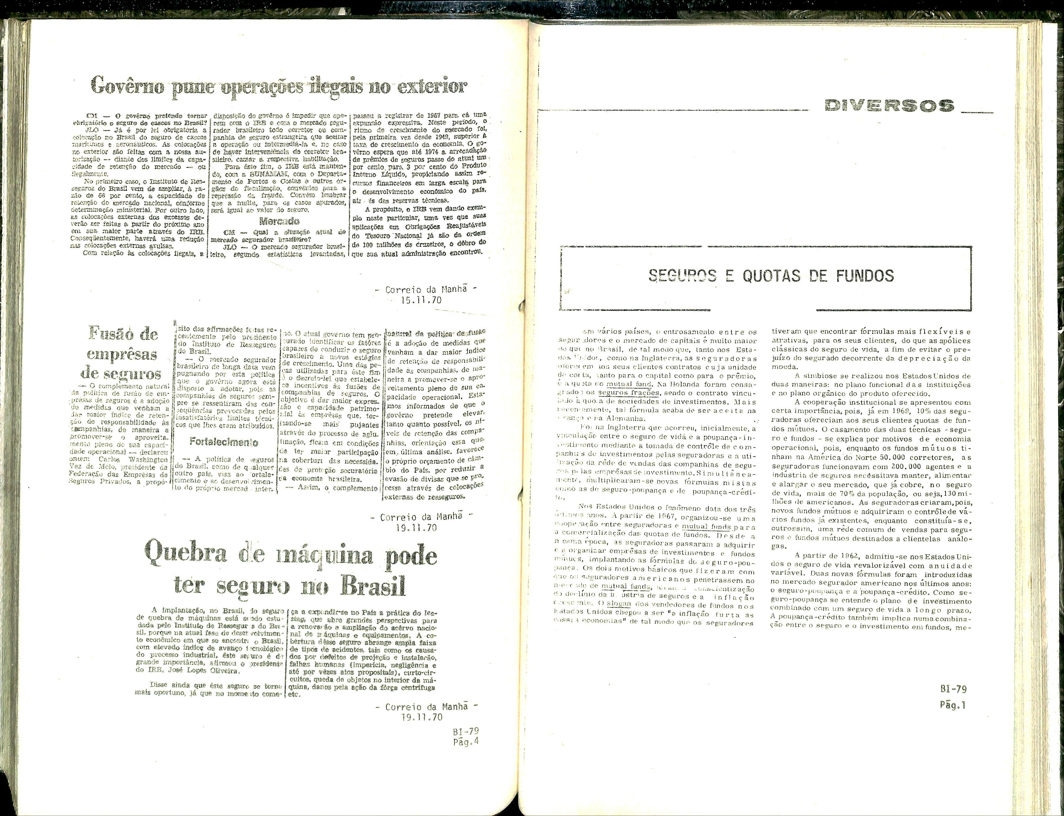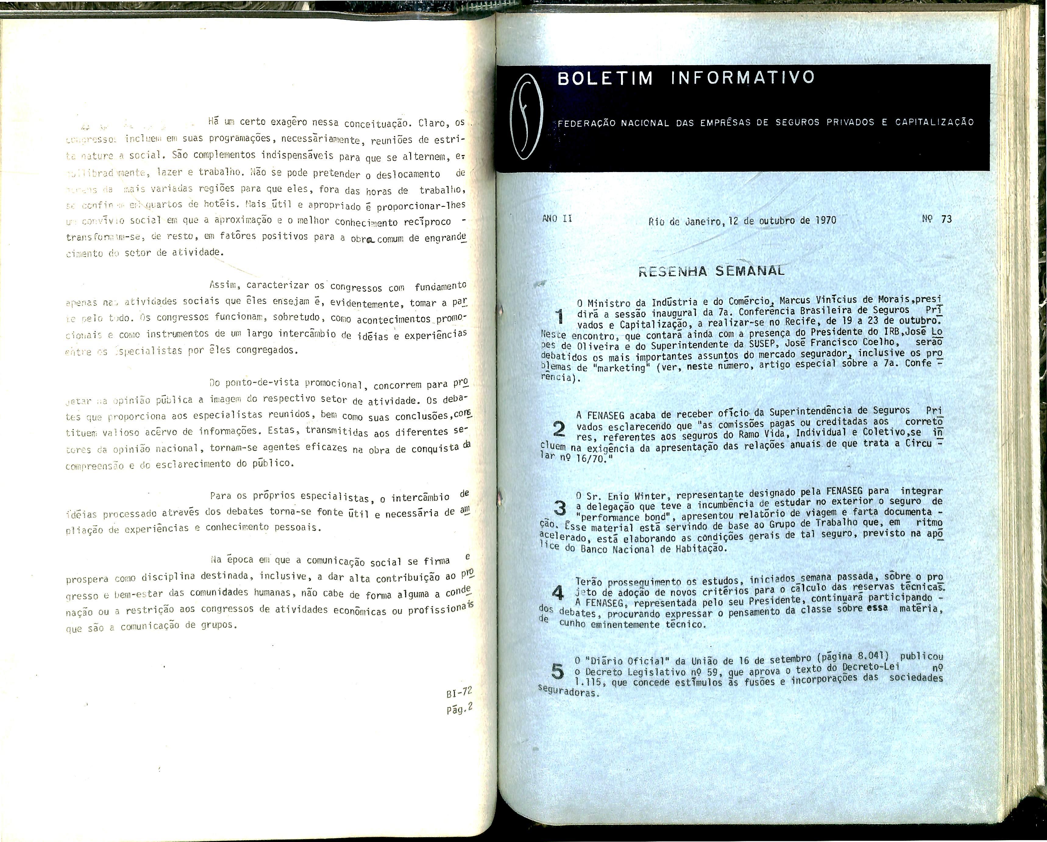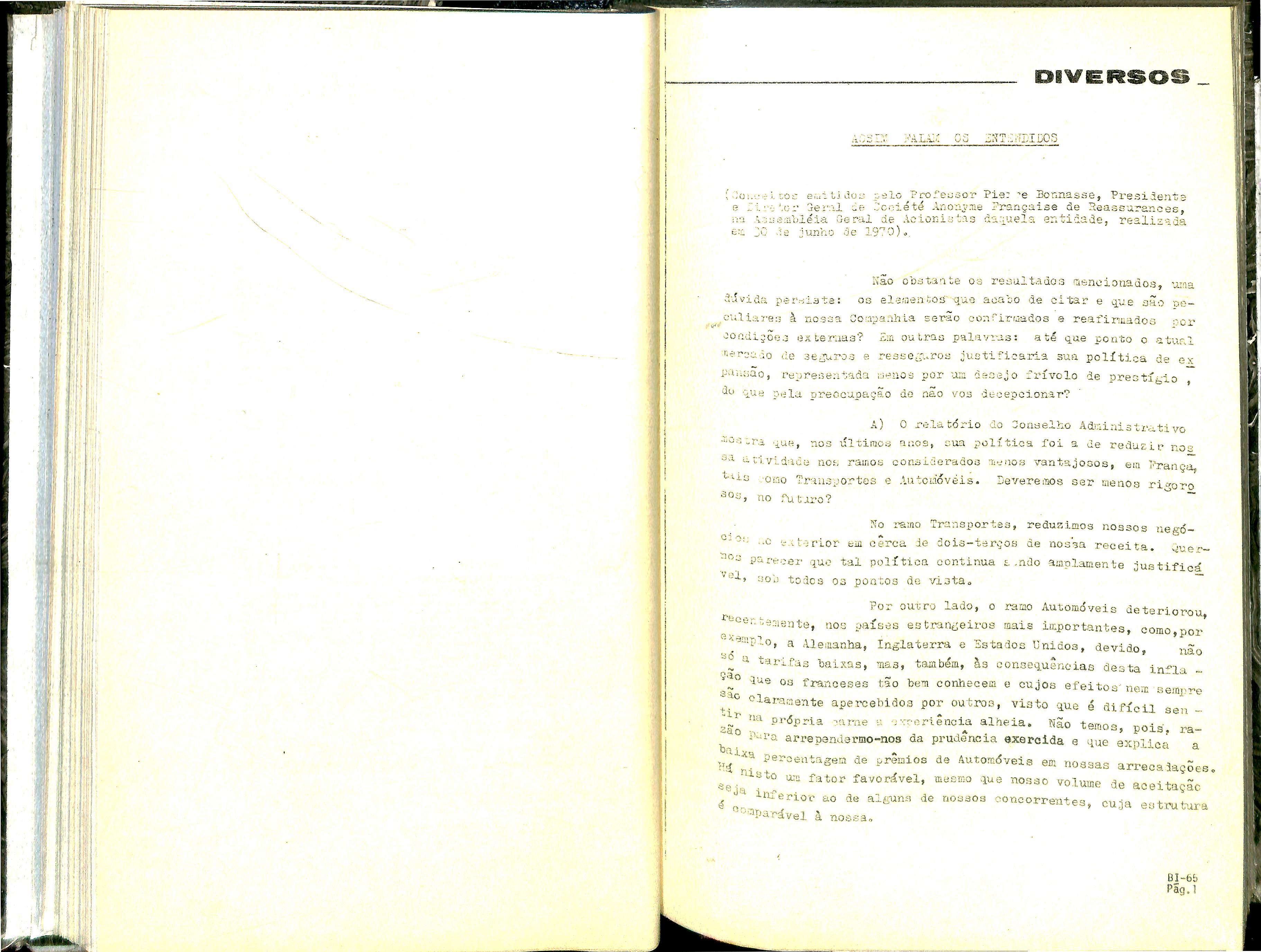 Os r esultados à e balanc o do mercado segurad or em J. 9 69, co nst it uiram-se em verd ad eira s urprêsa para us emp r esários e p a ra os ó rgãos do govê rno resp o ns á veis pelo setor Na ve rdacl i.: n ão h a via , a t é 31 óe d ezembw, <1 men or expec ta tiv a da s per_d as ocorr ida s e , pr üúc a mc.nie, general izad as Os re ultad o s p ositiv9S. d as aplicaç;<:ies mal deram pa ra çobrir os d.efcit s da operação, ta n to nas e m presas .: stra n gc irn s , como na s na~io na~S - Ent re es tas ~,, :::n~ }:· ~.:.is o.tmgidas, ex.-- Ámcn tc, a s grandes se gufaáoras. · D aí o pan o ra m a de 1970 , m arcado pe a pesq ui sa incess an te dos m otivos e ca usa s do ocorr ido.