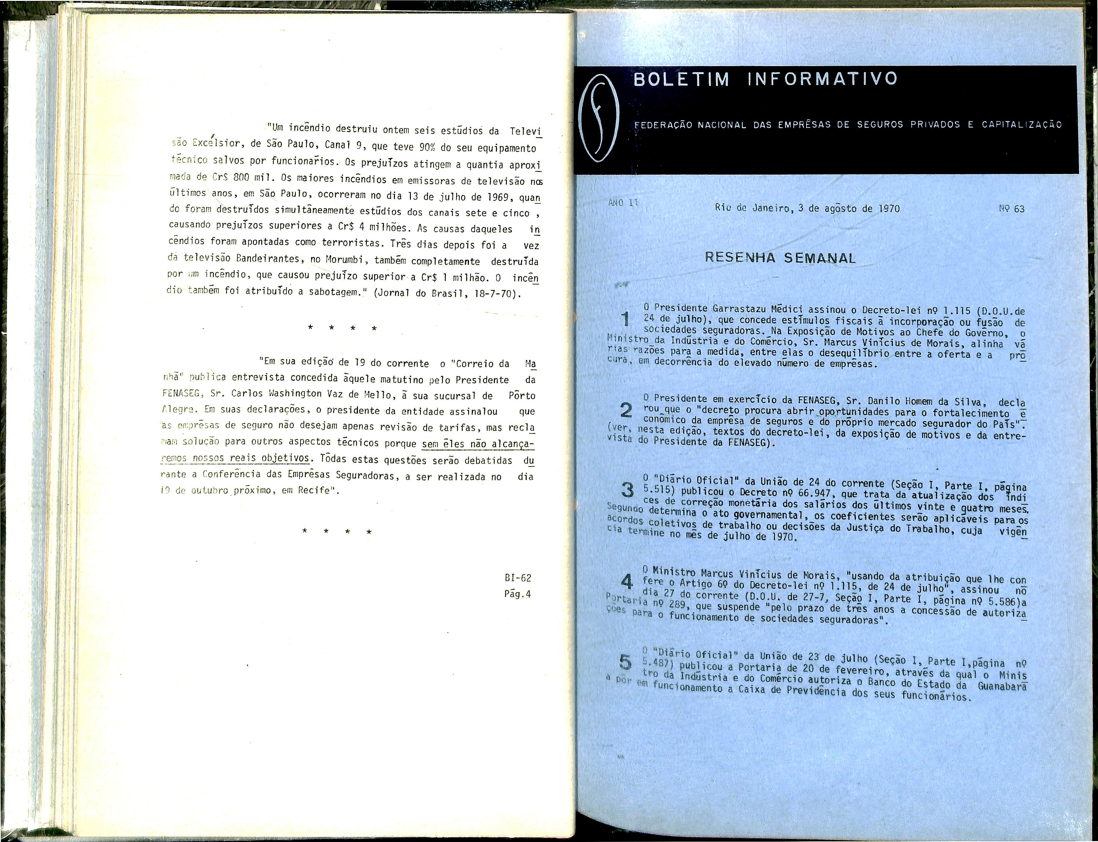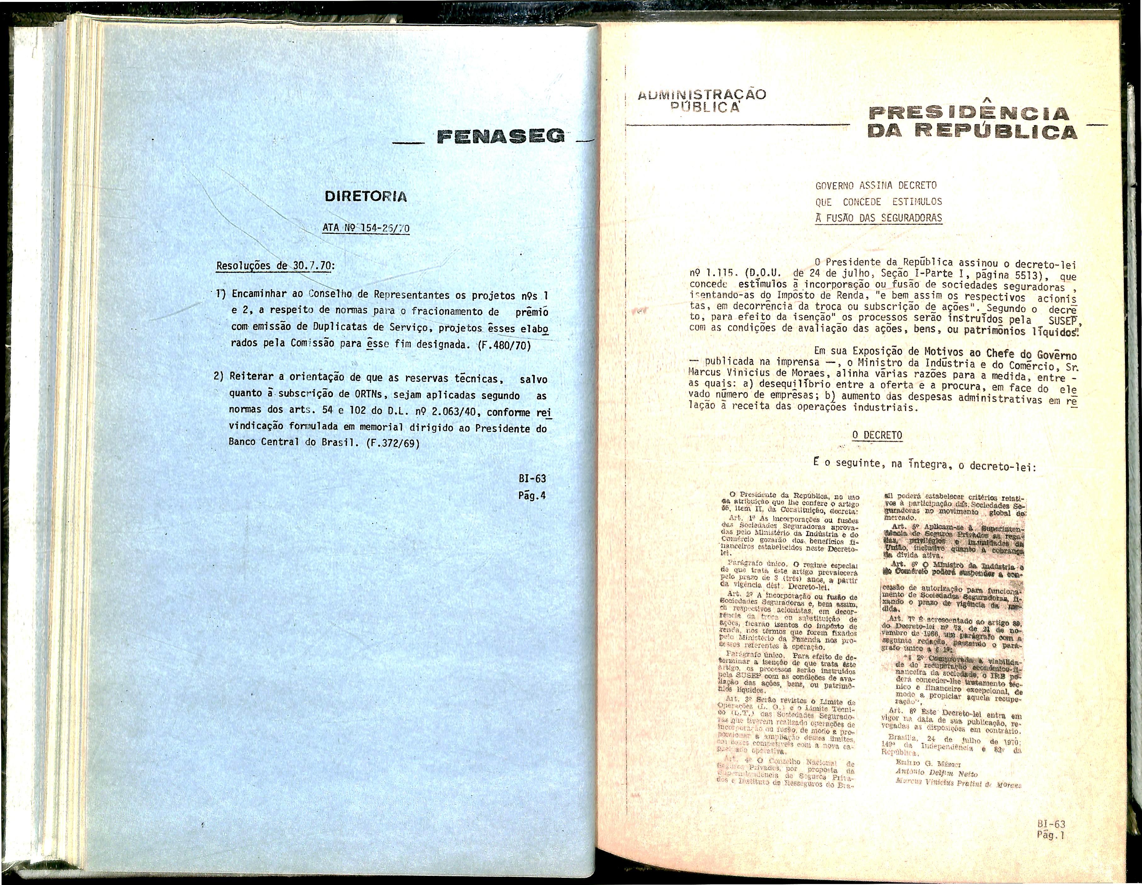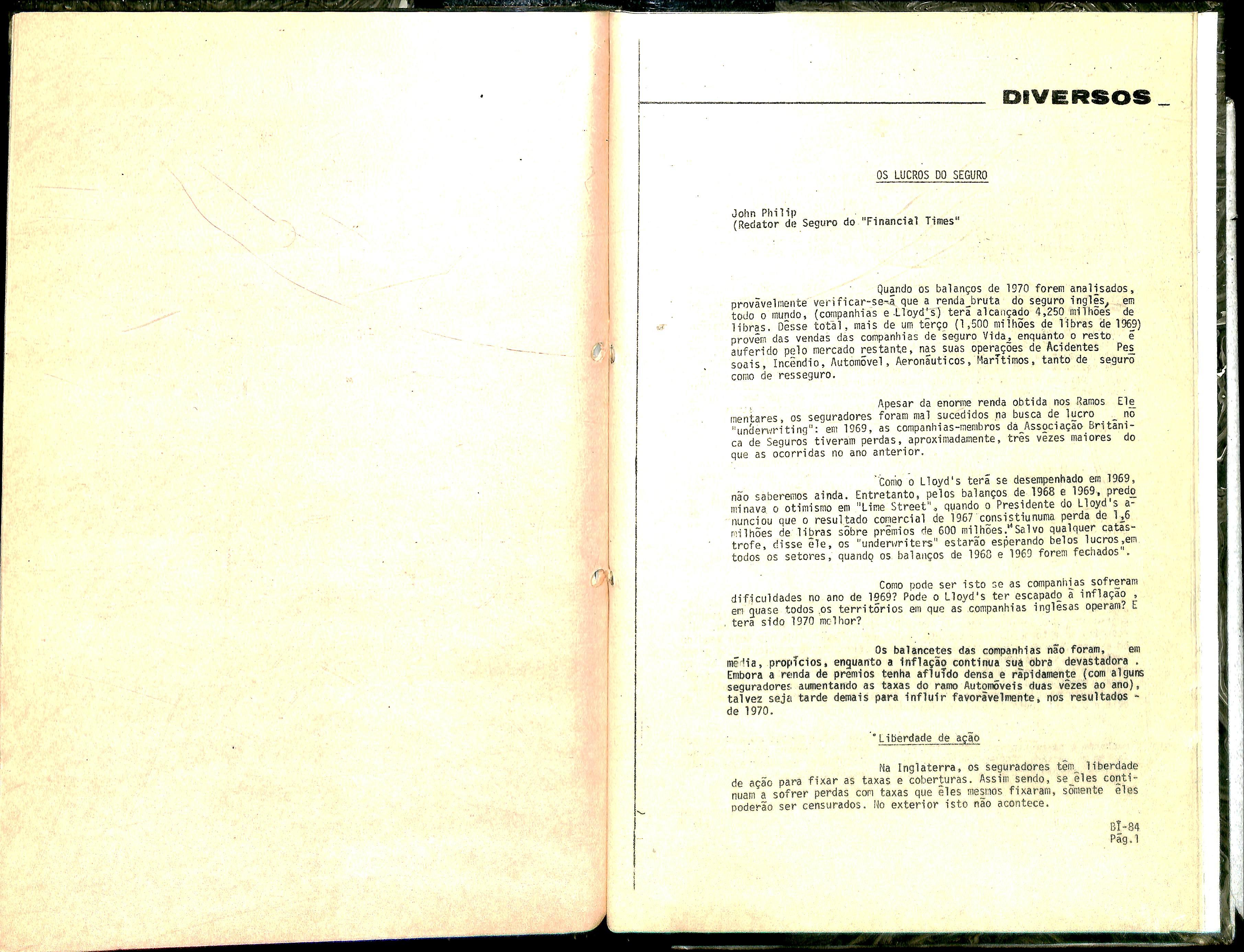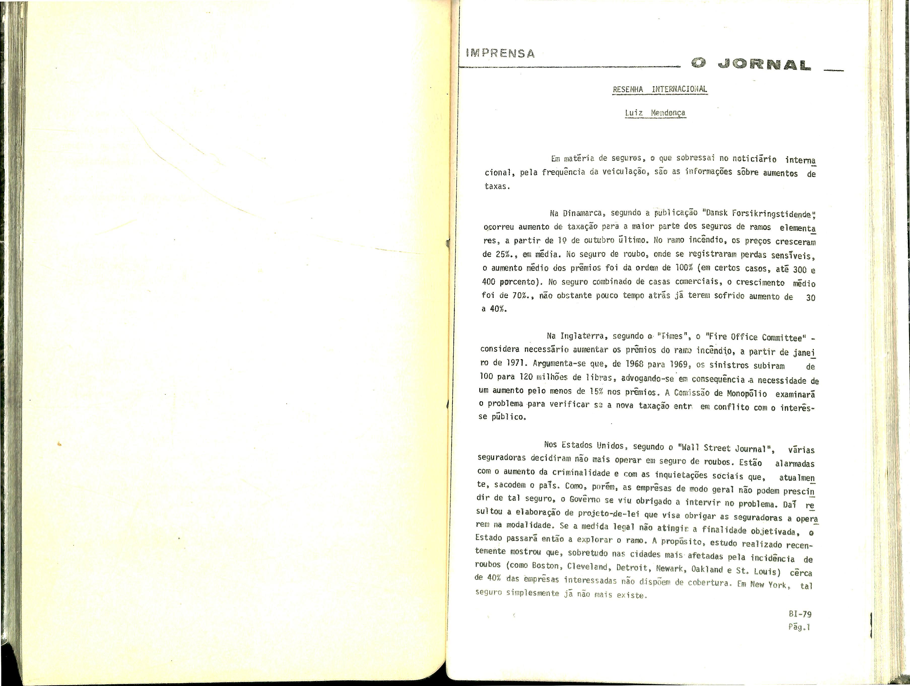 Os r esultados à e balanc o do mercado segurad or em J. 9 69, co nst it uiram-se em verd ad eira s urprêsa para us emp r esários e p a ra os ó rgãos do govê rno resp o ns á veis pelo setor Na ve rdacl i.: n ão h a via , a t é 31 óe d ezembw, <1 men or expec ta tiv a da s per_d as ocorr ida s e , pr üúc a mc.nie, general izad as Os re ultad o s p ositiv9S. d as aplicaç;<:ies mal deram pa ra çobrir os d.efcit s da operação, ta n to nas e m presas .: stra n gc irn s , como na s na~io na~S - Ent re es tas ~,, :::n~ }:· ~.:.is o.tmgidas, ex.-- Ámcn tc, a s grandes se gufaáoras. · D aí o pan o ra m a de 1970 , m arcado pe a pesq ui sa incess an te dos m otivos e ca usa s do ocorr ido.