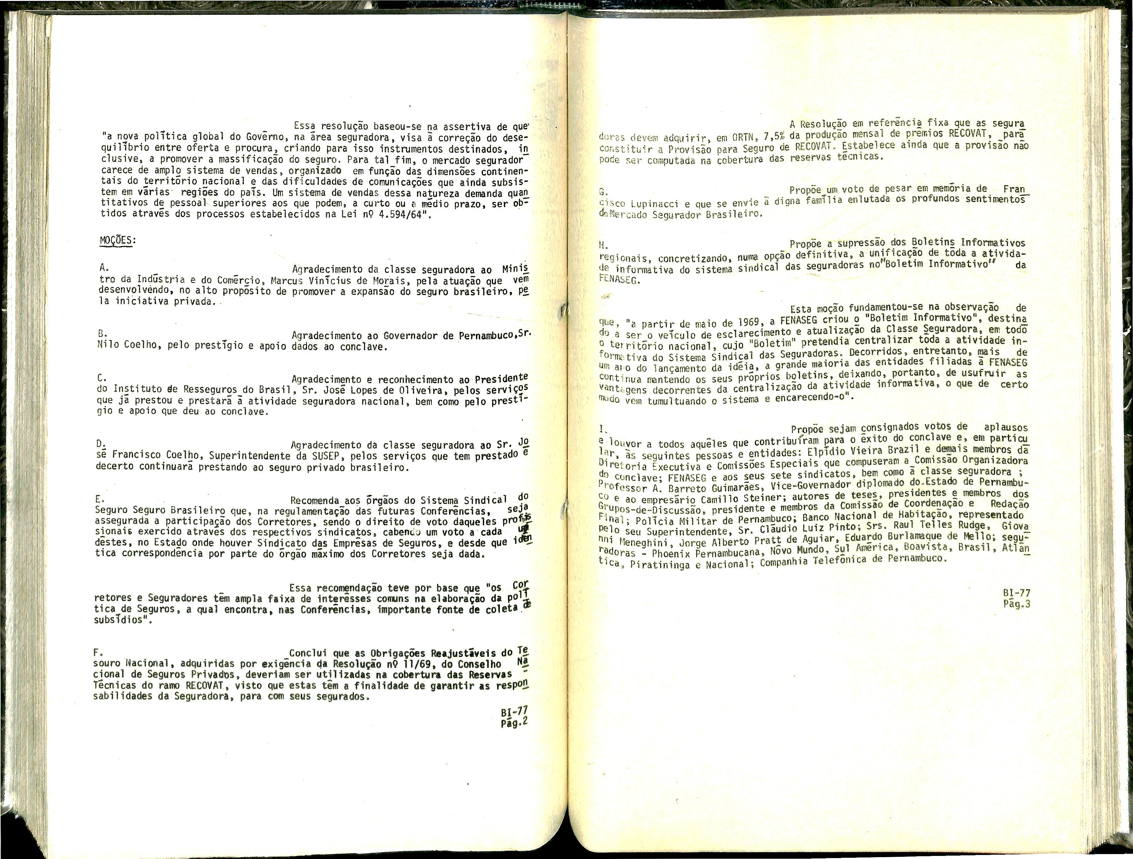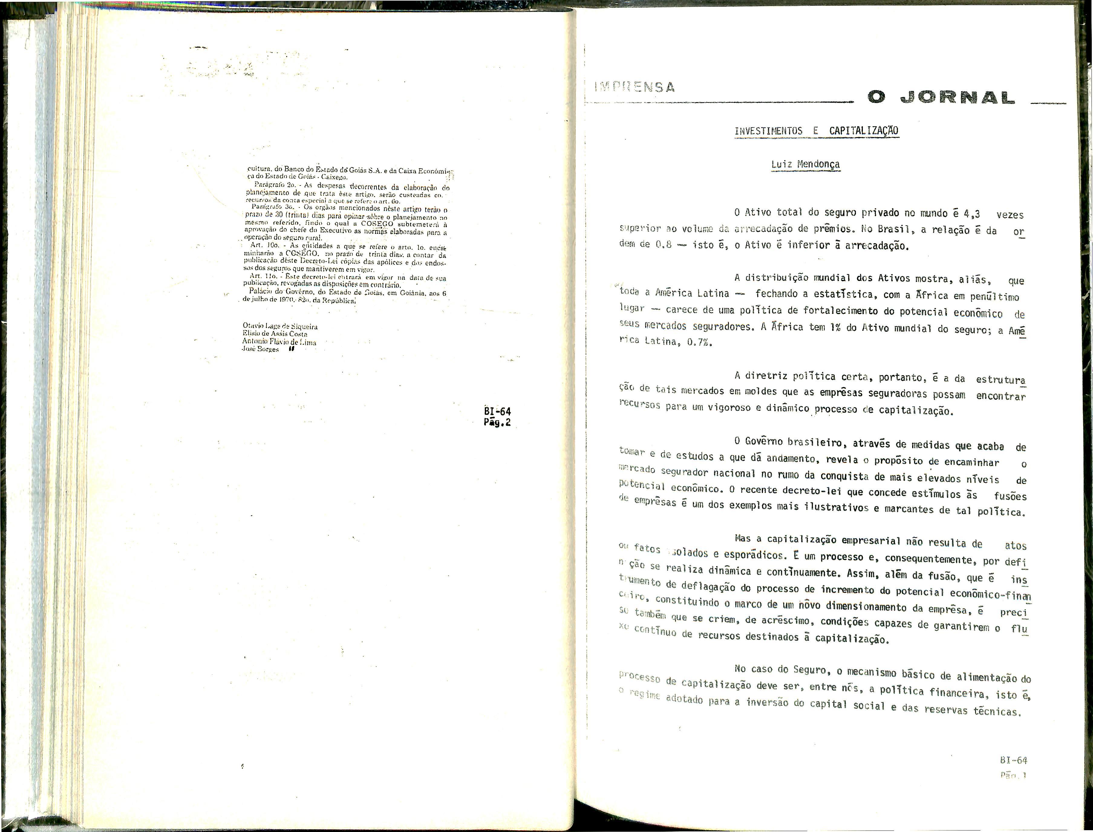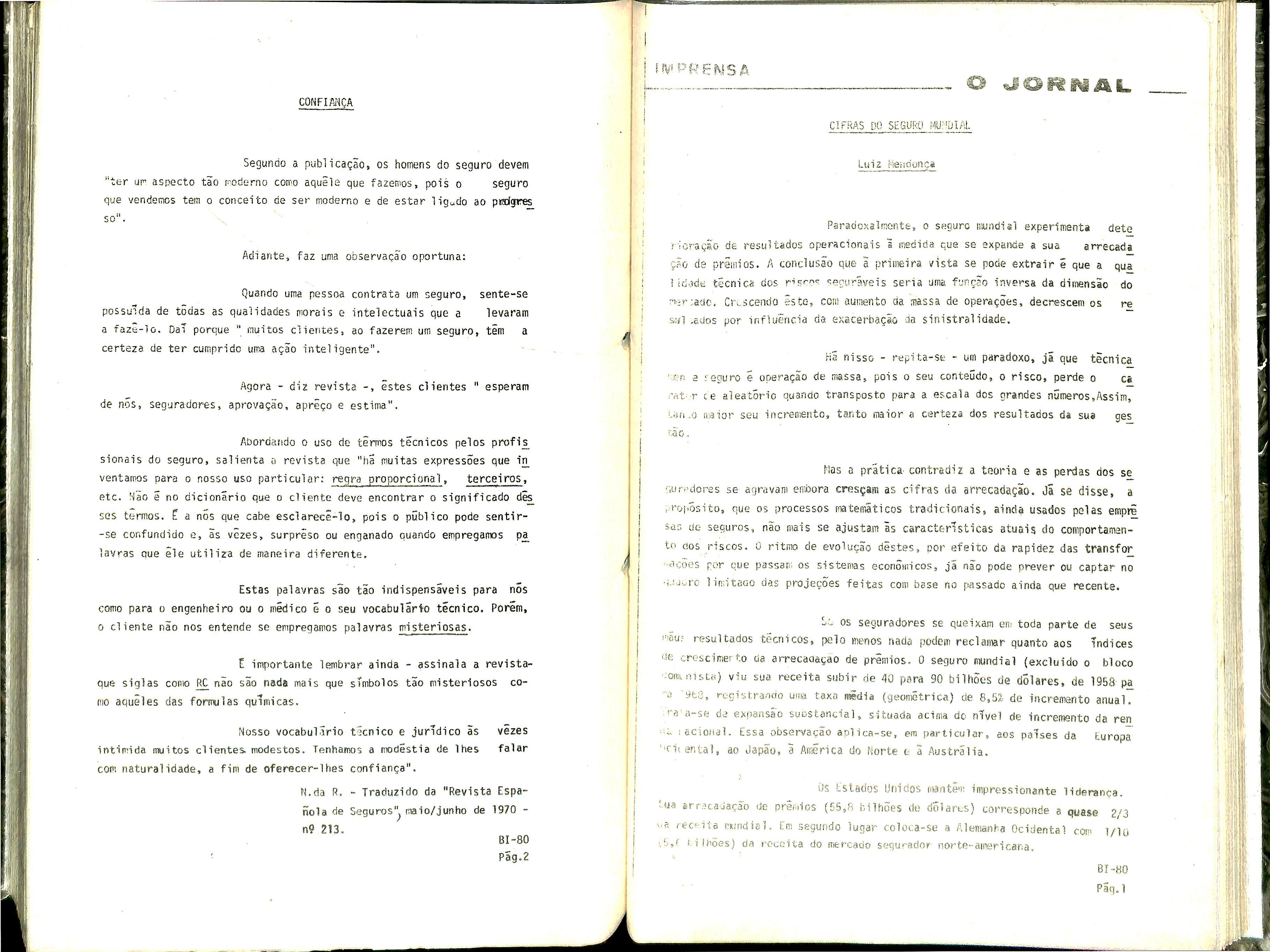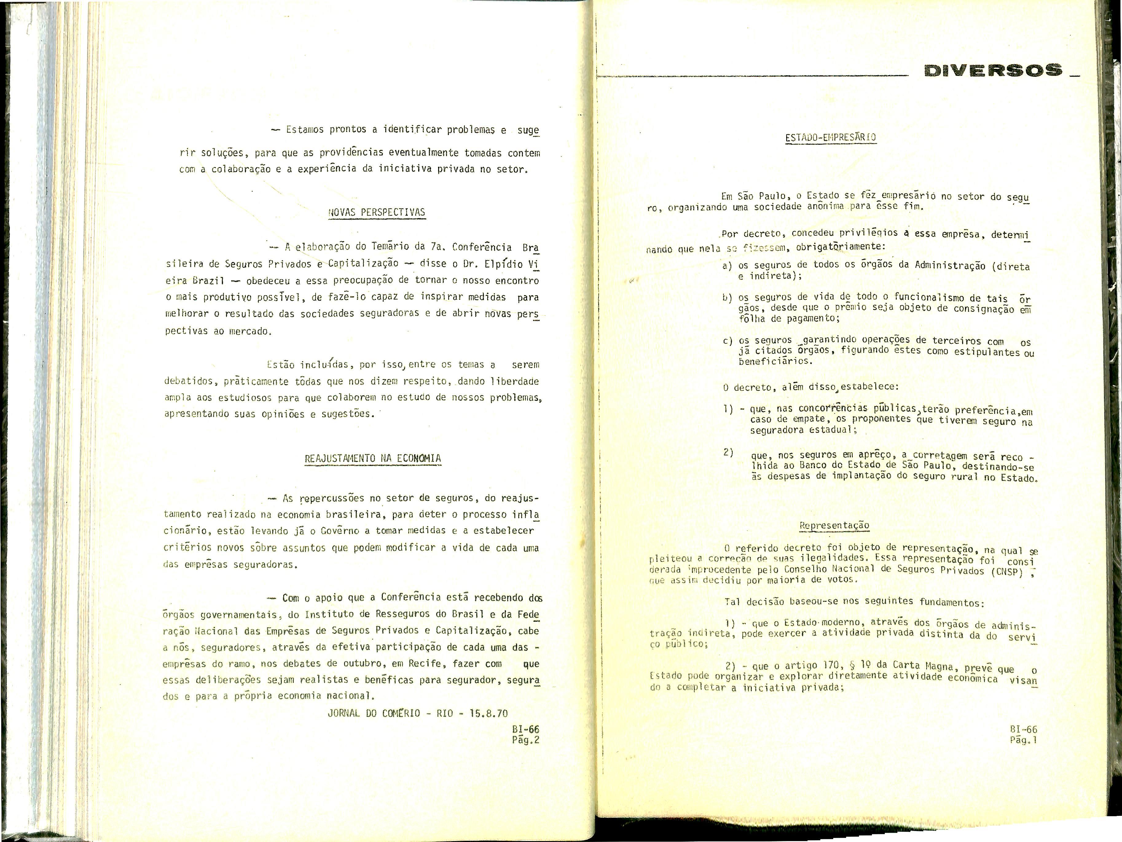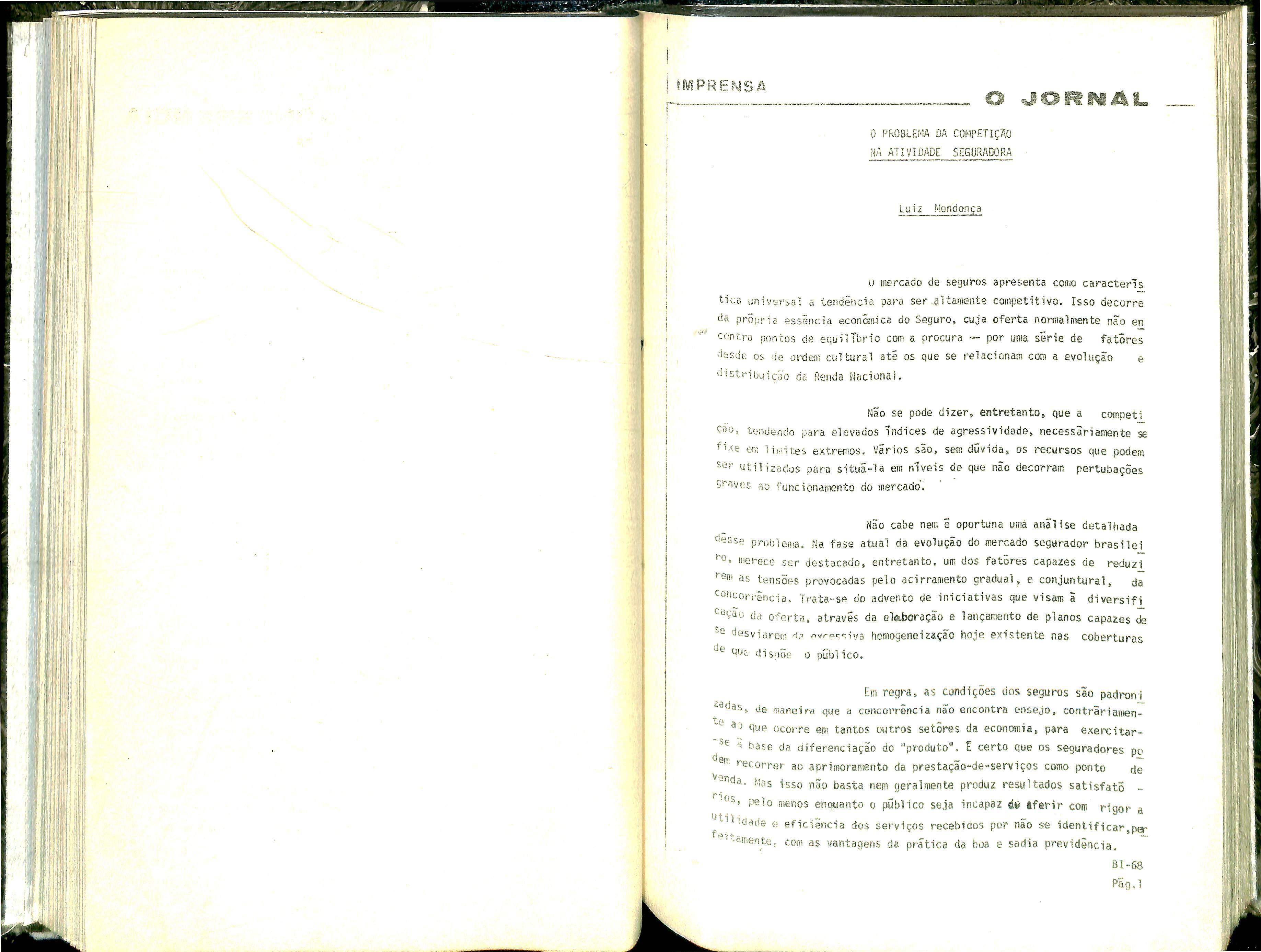 Os r esultados à e balanc o do mercado segurad or em J. 9 69, co nst it uiram-se em verd ad eira s urprêsa para us emp r esários e p a ra os ó rgãos do govê rno resp o ns á veis pelo setor Na ve rdacl i.: n ão h a via , a t é 31 óe d ezembw, <1 men or expec ta tiv a da s per_d as ocorr ida s e , pr üúc a mc.nie, general izad as Os re ultad o s p ositiv9S. d as aplicaç;<:ies mal deram pa ra çobrir os d.efcit s da operação, ta n to nas e m presas .: stra n gc irn s , como na s na~io na~S - Ent re es tas ~,, :::n~ }:· ~.:.is o.tmgidas, ex.-- Ámcn tc, a s grandes se gufaáoras. · D aí o pan o ra m a de 1970 , m arcado pe a pesq ui sa incess an te dos m otivos e ca usa s do ocorr ido.