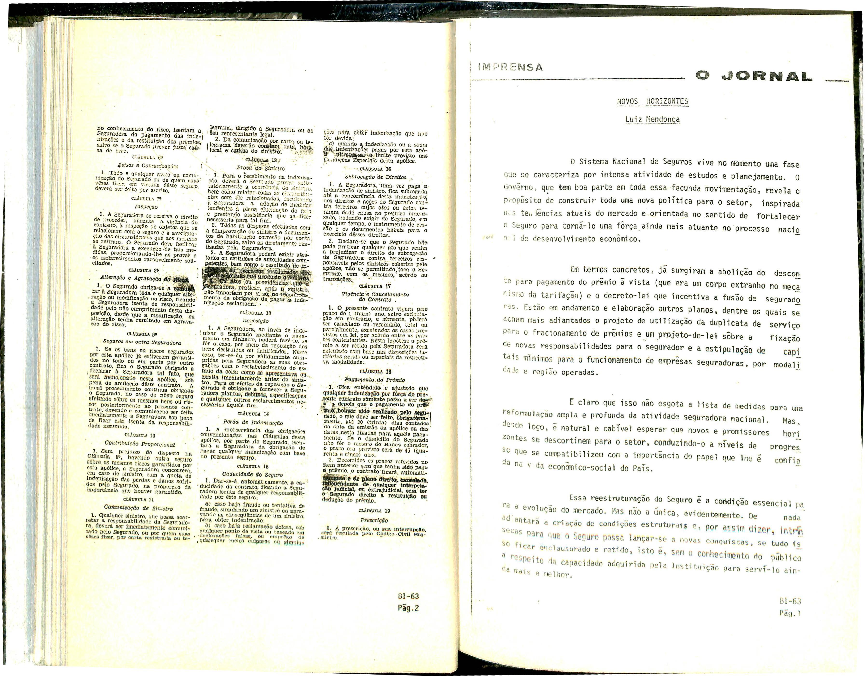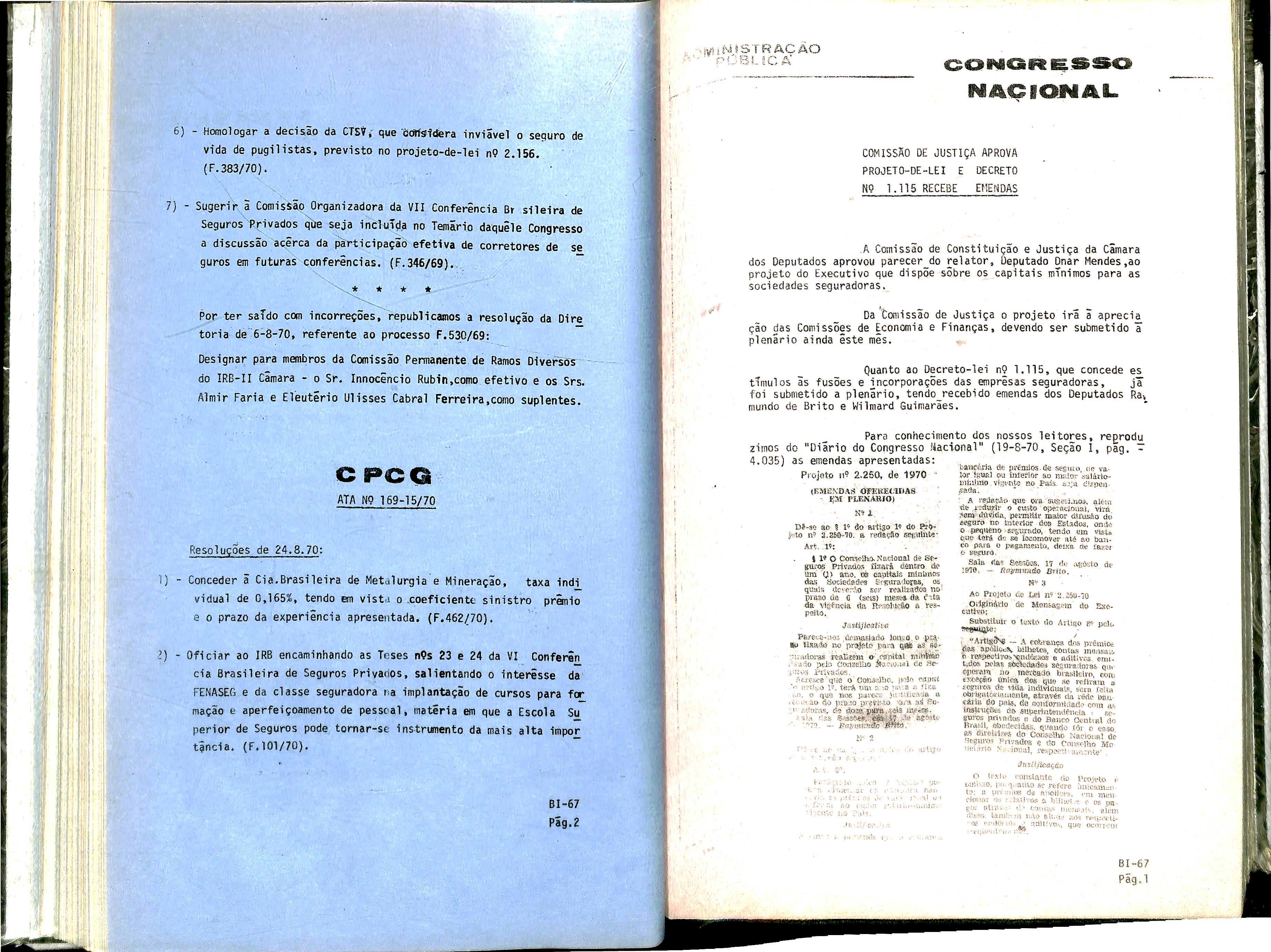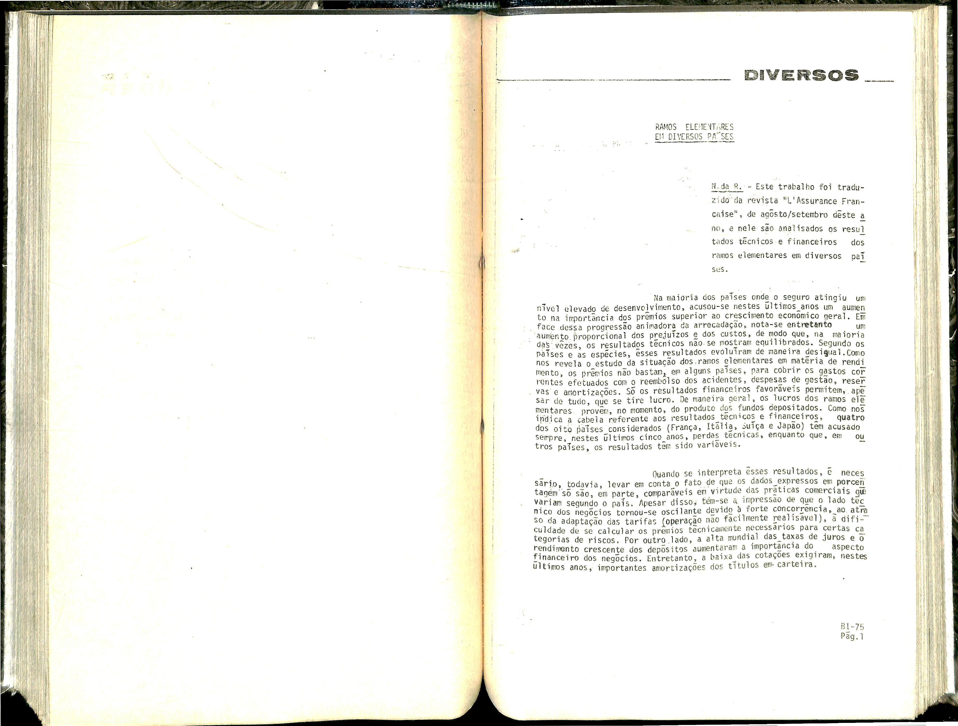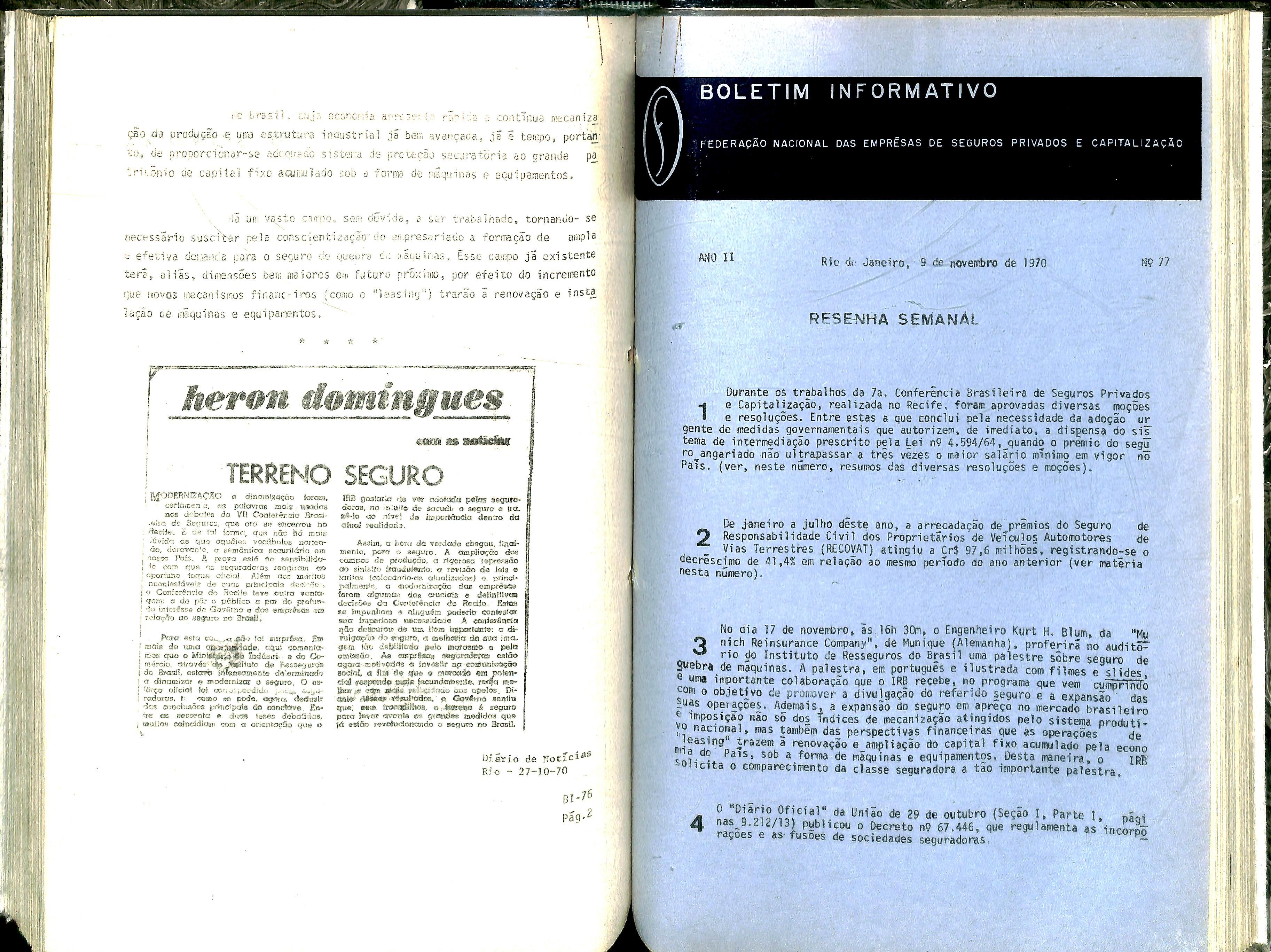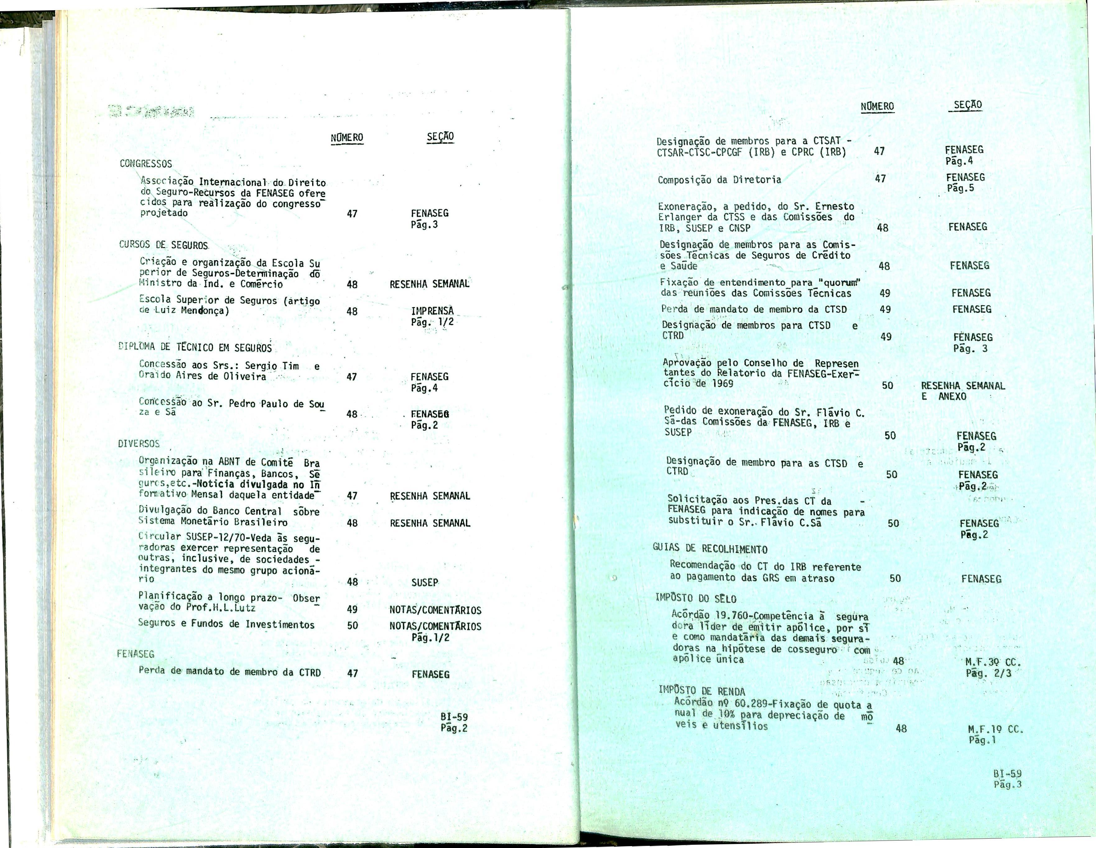 Os r esultados à e balanc o do mercado segurad or em J. 9 69, co nst it uiram-se em verd ad eira s urprêsa para us emp r esários e p a ra os ó rgãos do govê rno resp o ns á veis pelo setor Na ve rdacl i.: n ão h a via , a t é 31 óe d ezembw, <1 men or expec ta tiv a da s per_d as ocorr ida s e , pr üúc a mc.nie, general izad as Os re ultad o s p ositiv9S. d as aplicaç;<:ies mal deram pa ra çobrir os d.efcit s da operação, ta n to nas e m presas .: stra n gc irn s , como na s na~io na~S - Ent re es tas ~,, :::n~ }:· ~.:.is o.tmgidas, ex.-- Ámcn tc, a s grandes se gufaáoras. · D aí o pan o ra m a de 1970 , m arcado pe a pesq ui sa incess an te dos m otivos e ca usa s do ocorr ido.