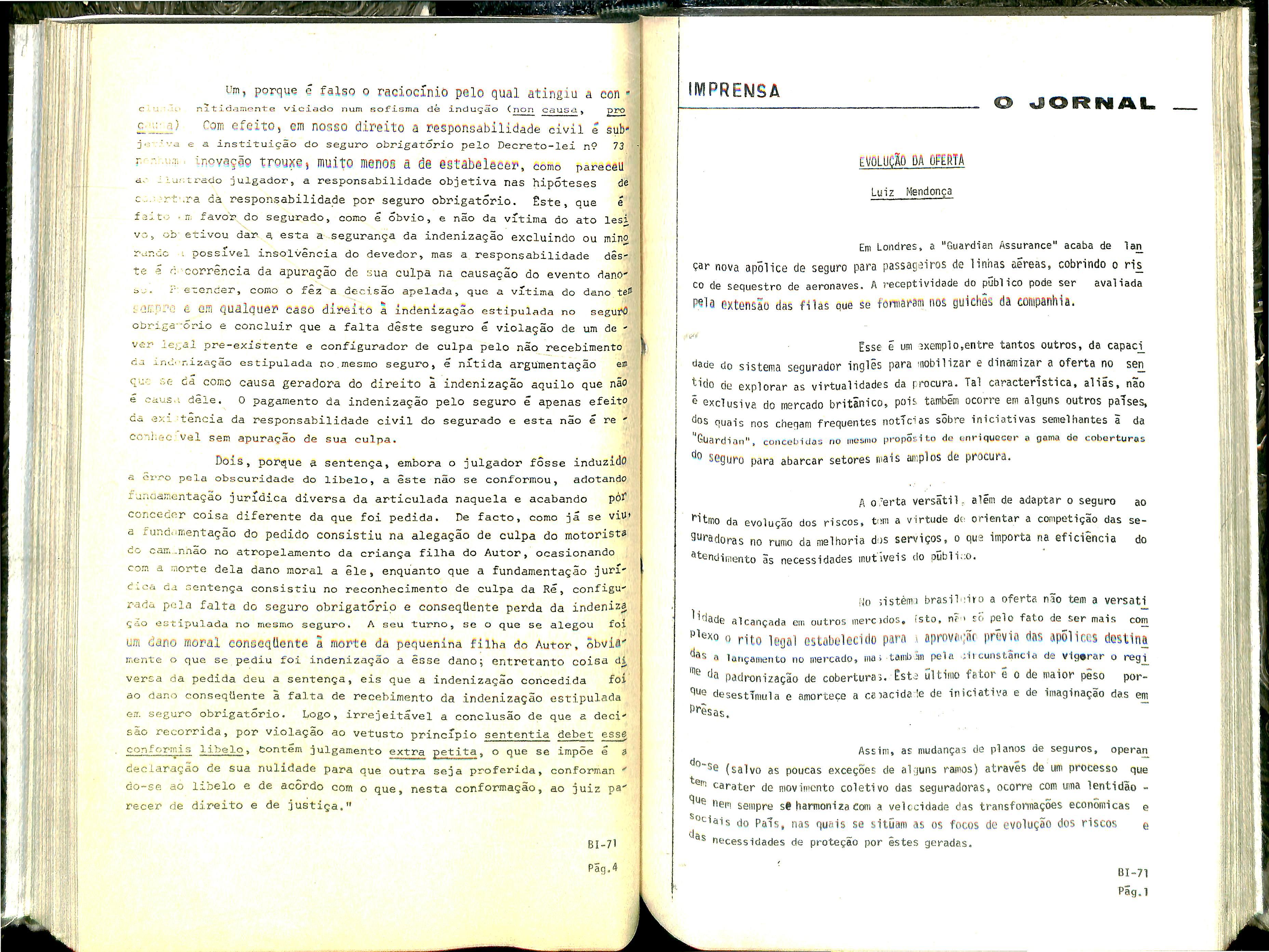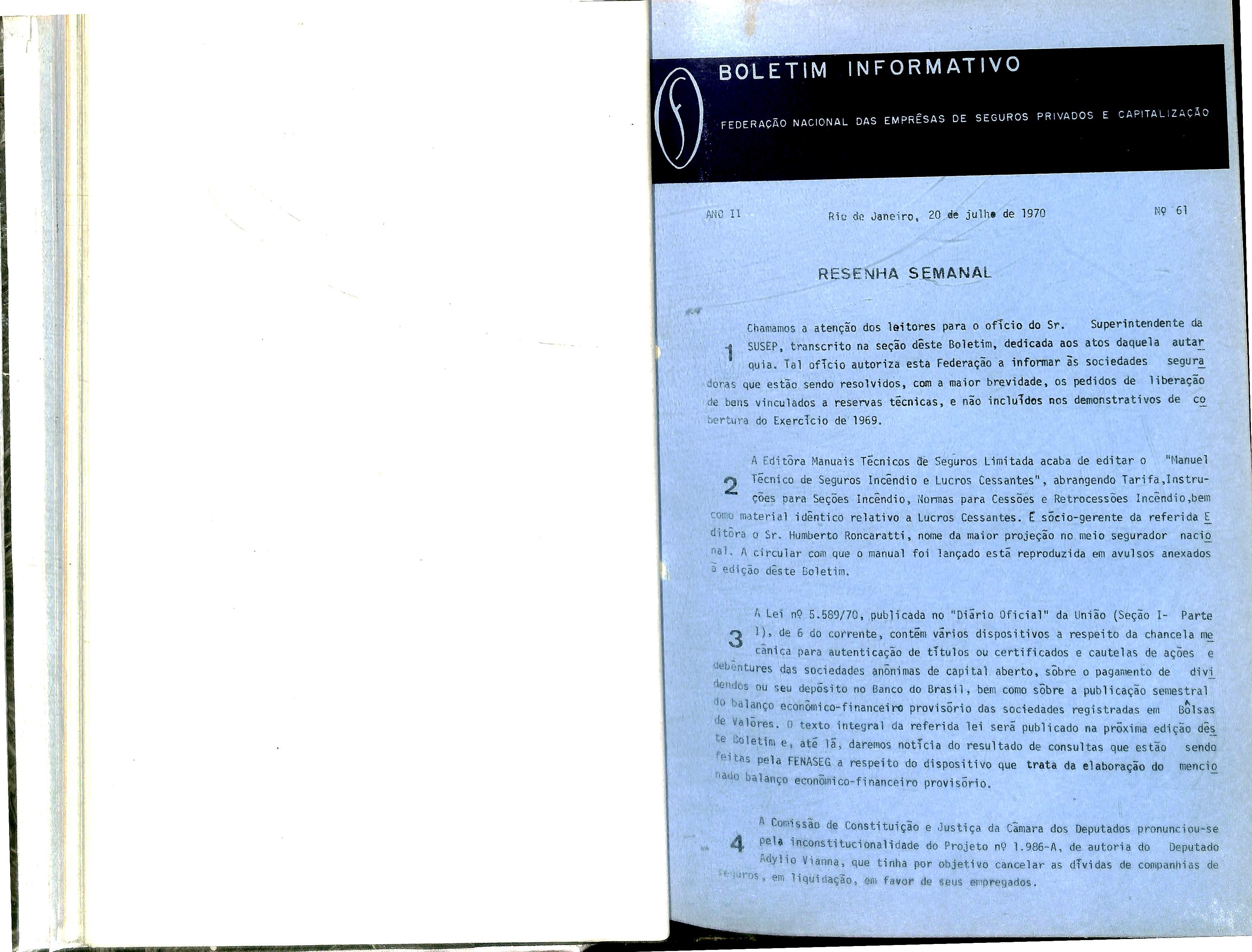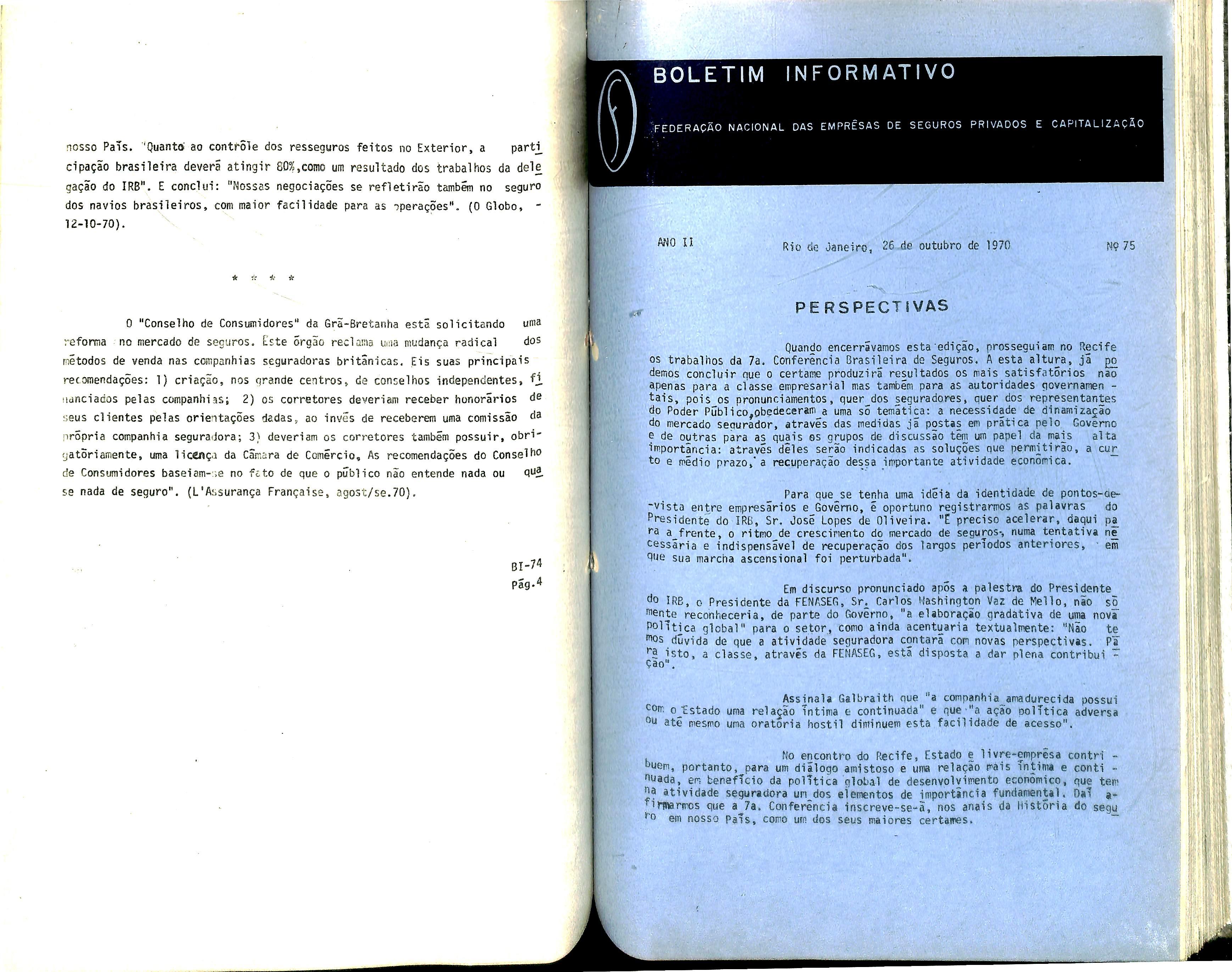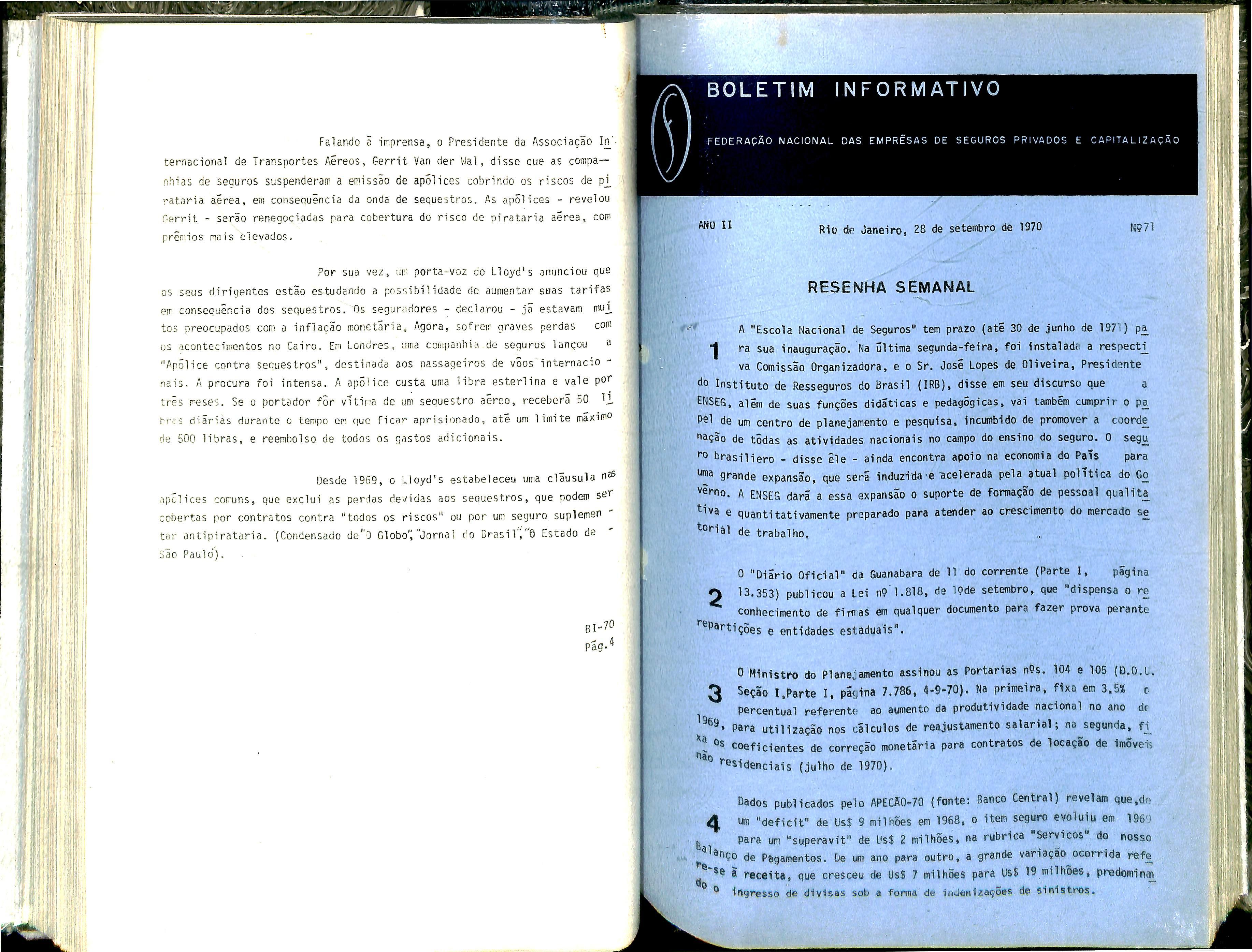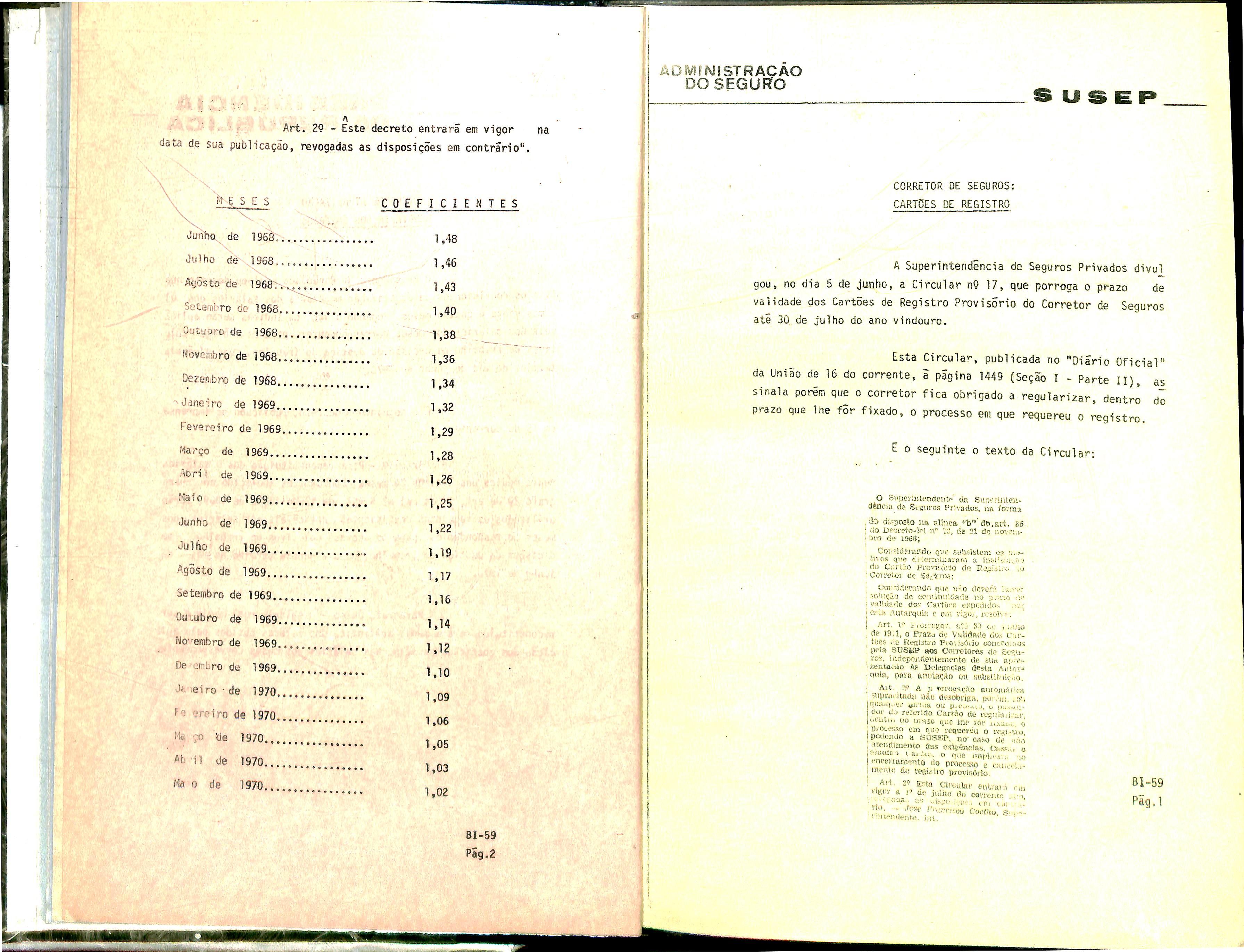 Os r esultados à e balanc o do mercado segurad or em J. 9 69, co nst it uiram-se em verd ad eira s urprêsa para us emp r esários e p a ra os ó rgãos do govê rno resp o ns á veis pelo setor Na ve rdacl i.: n ão h a via , a t é 31 óe d ezembw, <1 men or expec ta tiv a da s per_d as ocorr ida s e , pr üúc a mc.nie, general izad as Os re ultad o s p ositiv9S. d as aplicaç;<:ies mal deram pa ra çobrir os d.efcit s da operação, ta n to nas e m presas .: stra n gc irn s , como na s na~io na~S - Ent re es tas ~,, :::n~ }:· ~.:.is o.tmgidas, ex.-- Ámcn tc, a s grandes se gufaáoras. · D aí o pan o ra m a de 1970 , m arcado pe a pesq ui sa incess an te dos m otivos e ca usa s do ocorr ido.