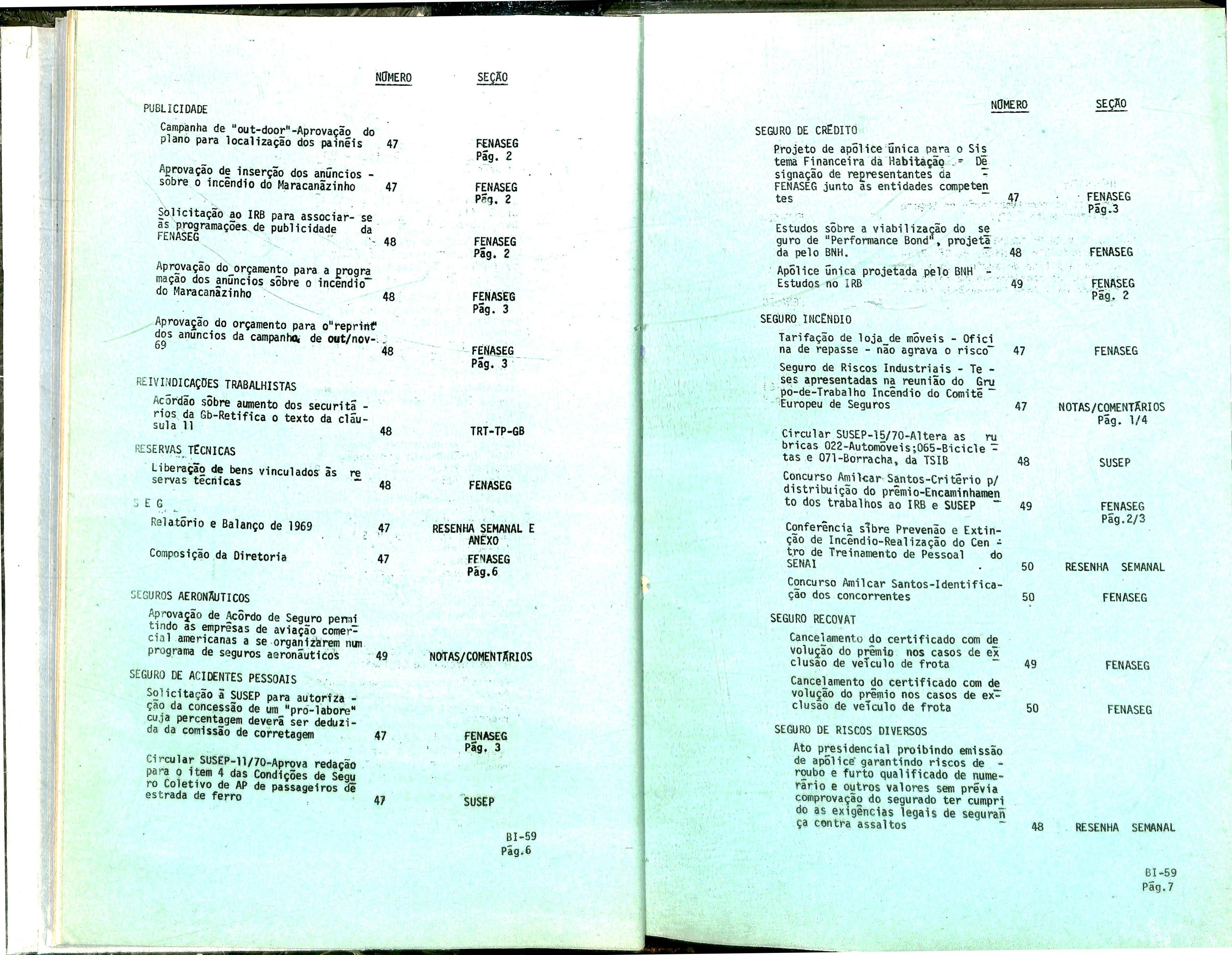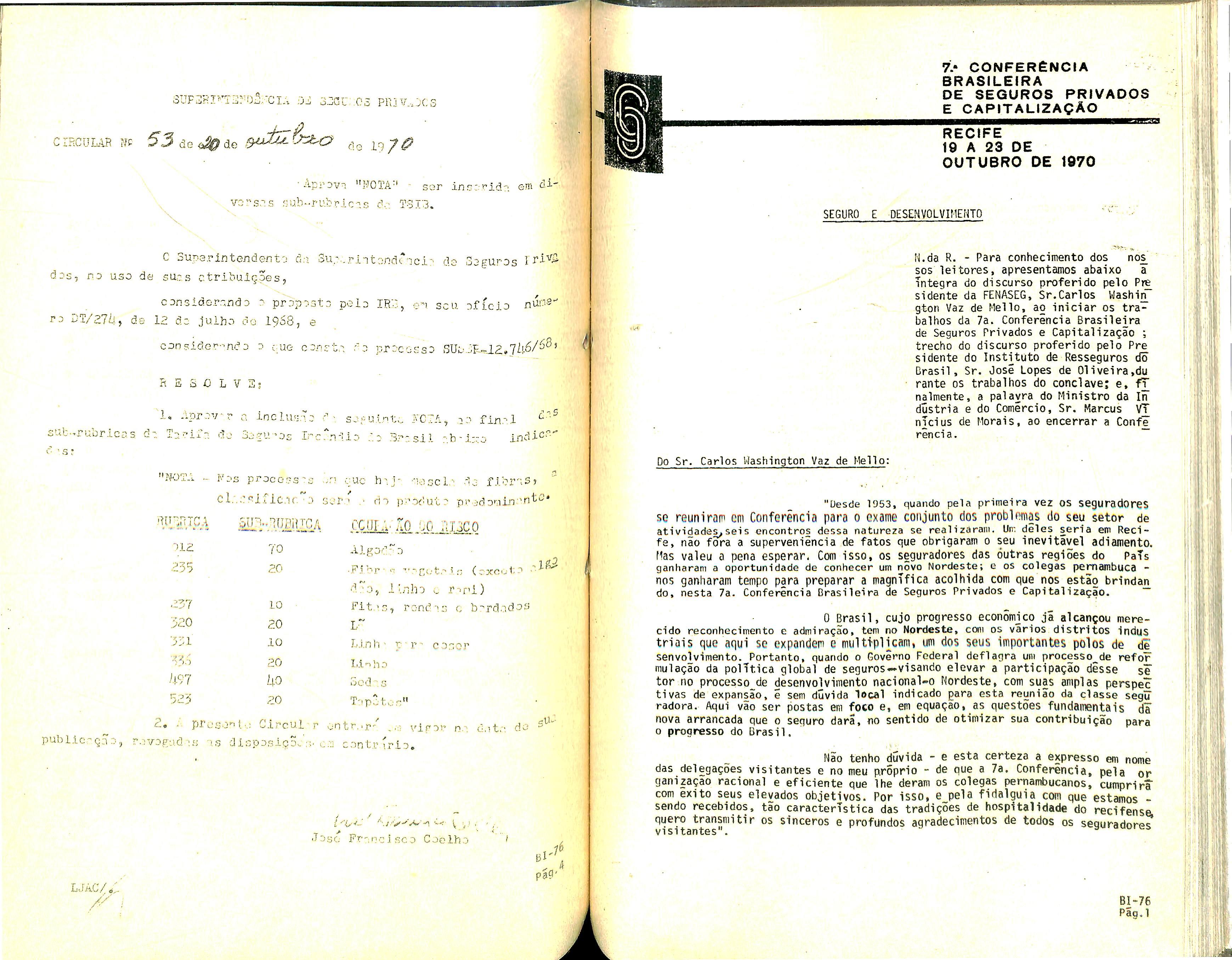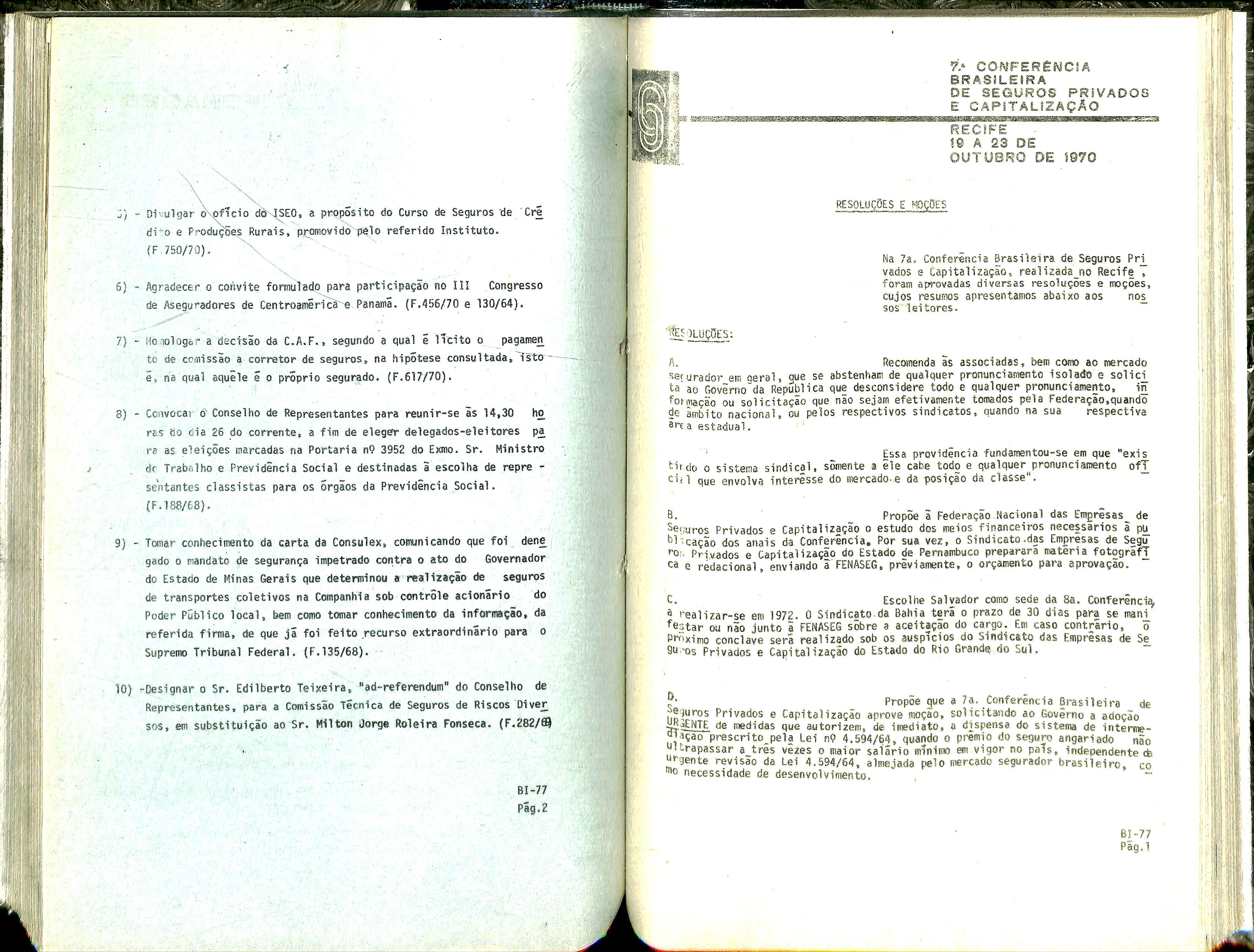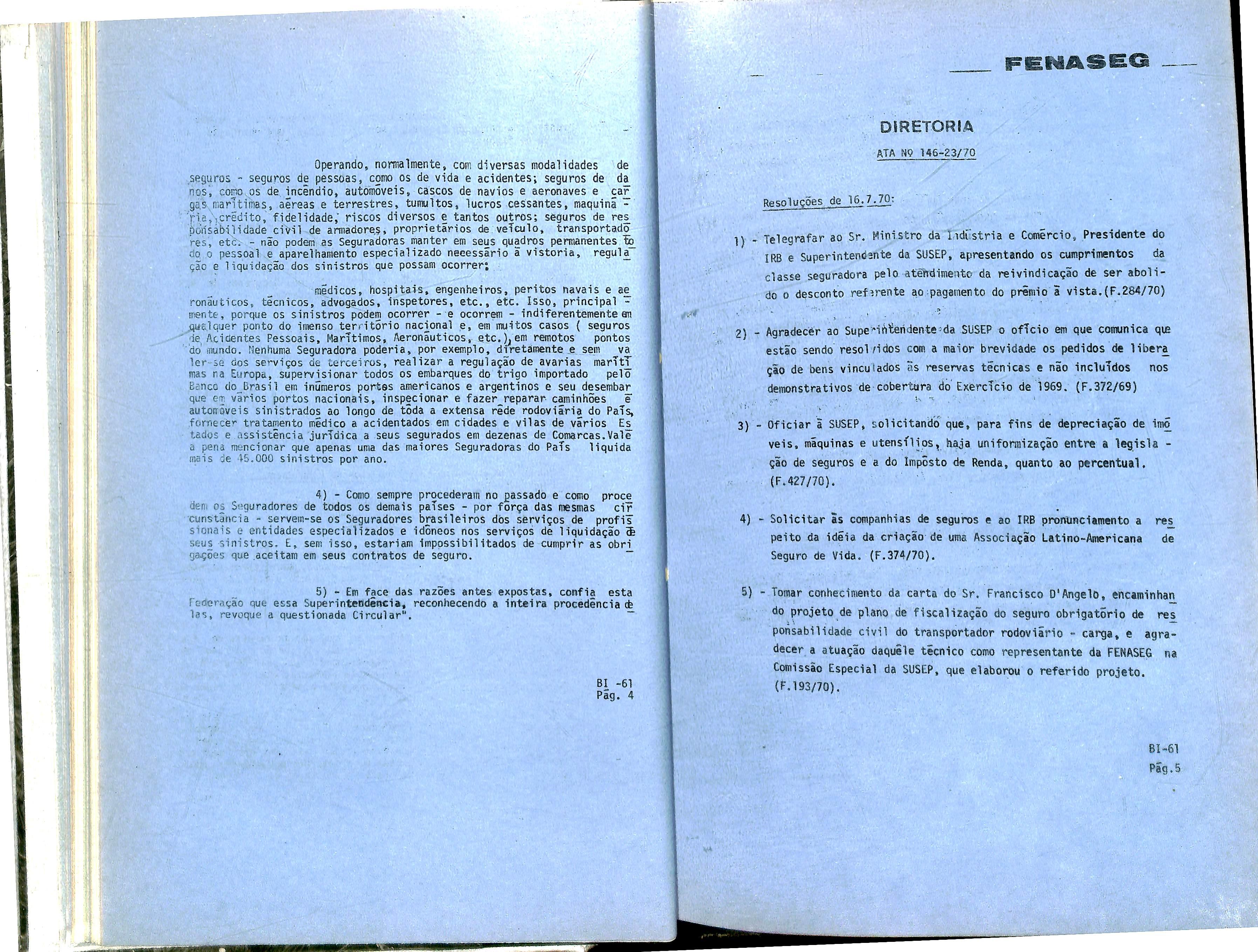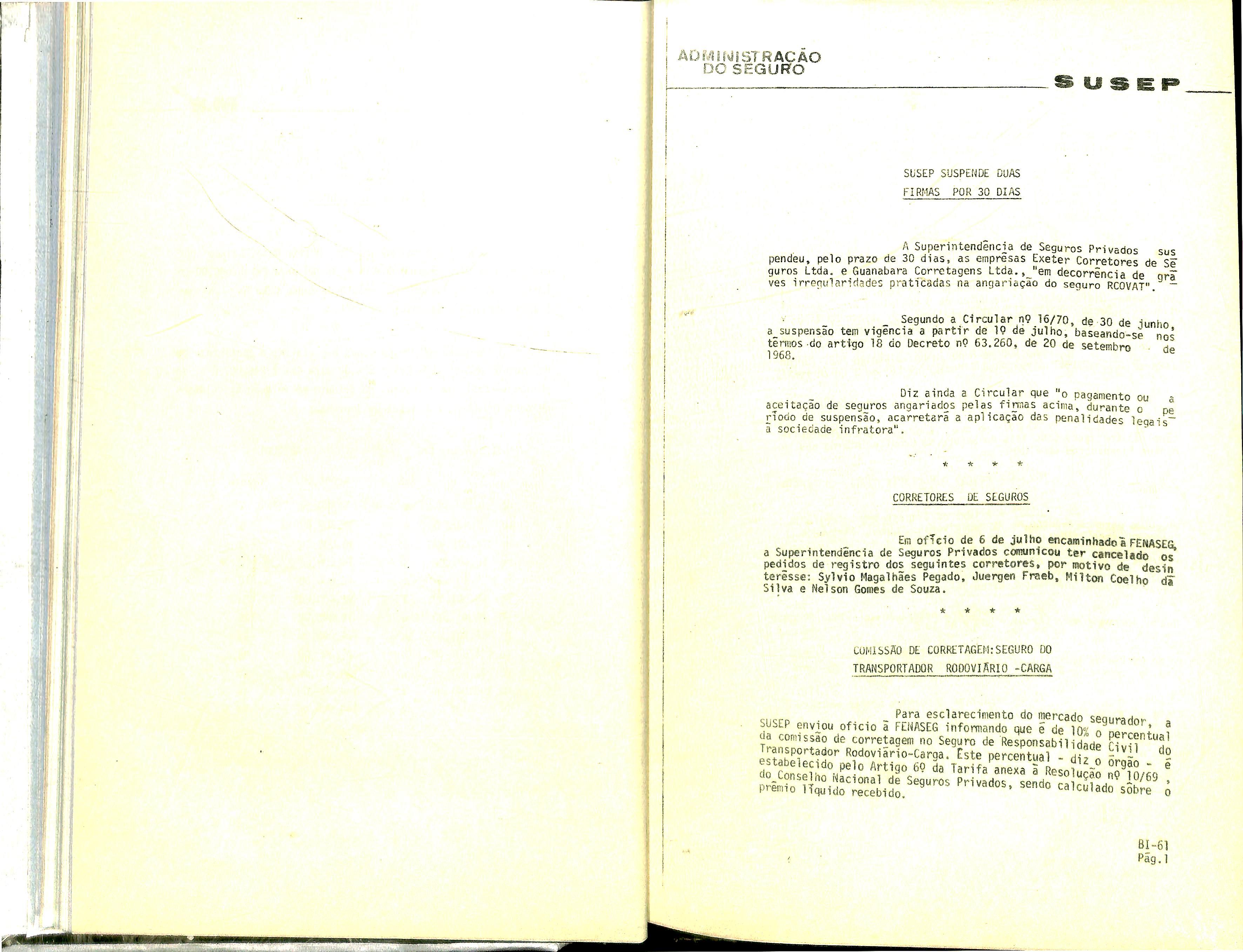 Os r esultados à e balanc o do mercado segurad or em J. 9 69, co nst it uiram-se em verd ad eira s urprêsa para us emp r esários e p a ra os ó rgãos do govê rno resp o ns á veis pelo setor Na ve rdacl i.: n ão h a via , a t é 31 óe d ezembw, <1 men or expec ta tiv a da s per_d as ocorr ida s e , pr üúc a mc.nie, general izad as Os re ultad o s p ositiv9S. d as aplicaç;<:ies mal deram pa ra çobrir os d.efcit s da operação, ta n to nas e m presas .: stra n gc irn s , como na s na~io na~S - Ent re es tas ~,, :::n~ }:· ~.:.is o.tmgidas, ex.-- Ámcn tc, a s grandes se gufaáoras. · D aí o pan o ra m a de 1970 , m arcado pe a pesq ui sa incess an te dos m otivos e ca usa s do ocorr ido.