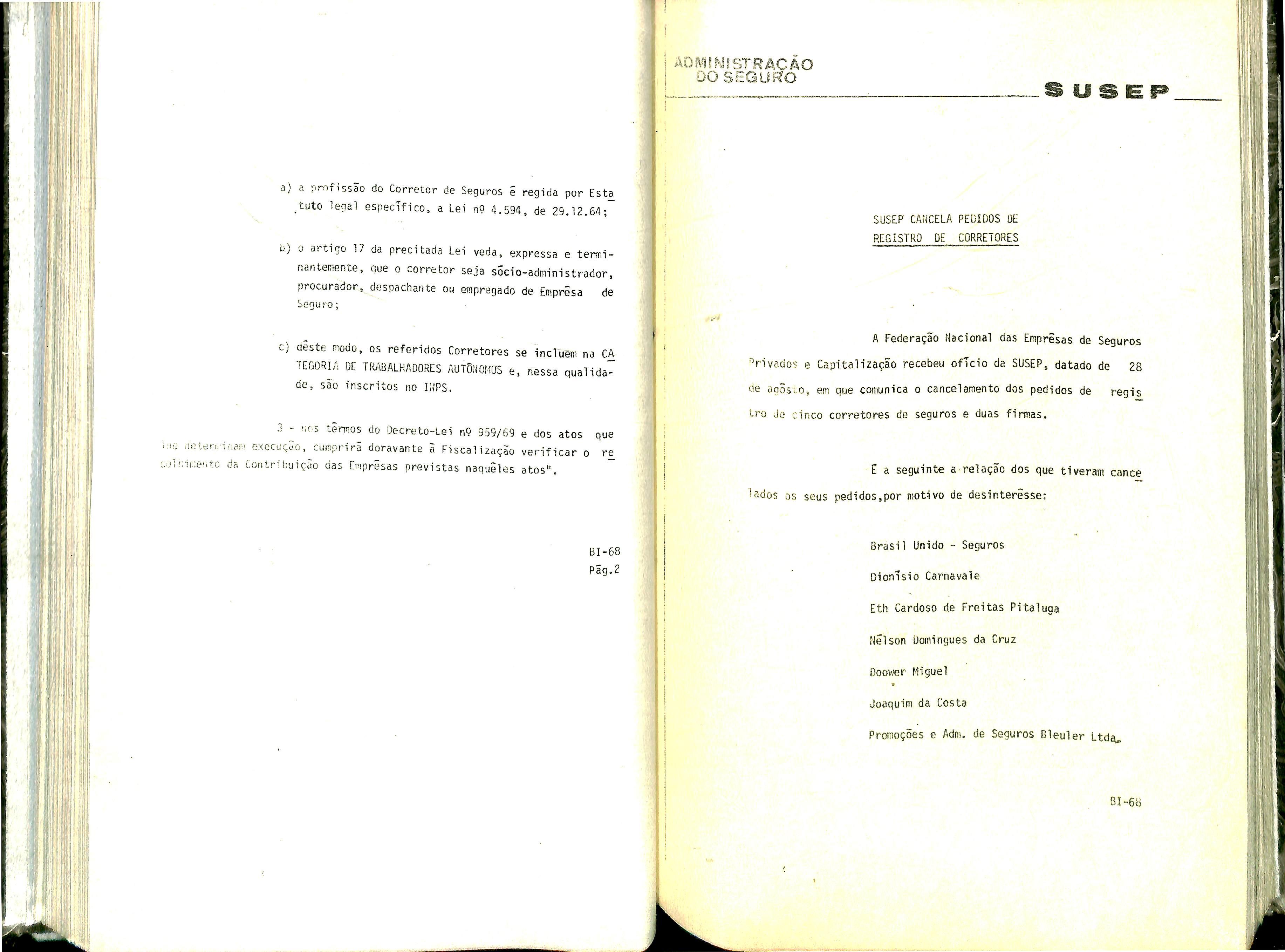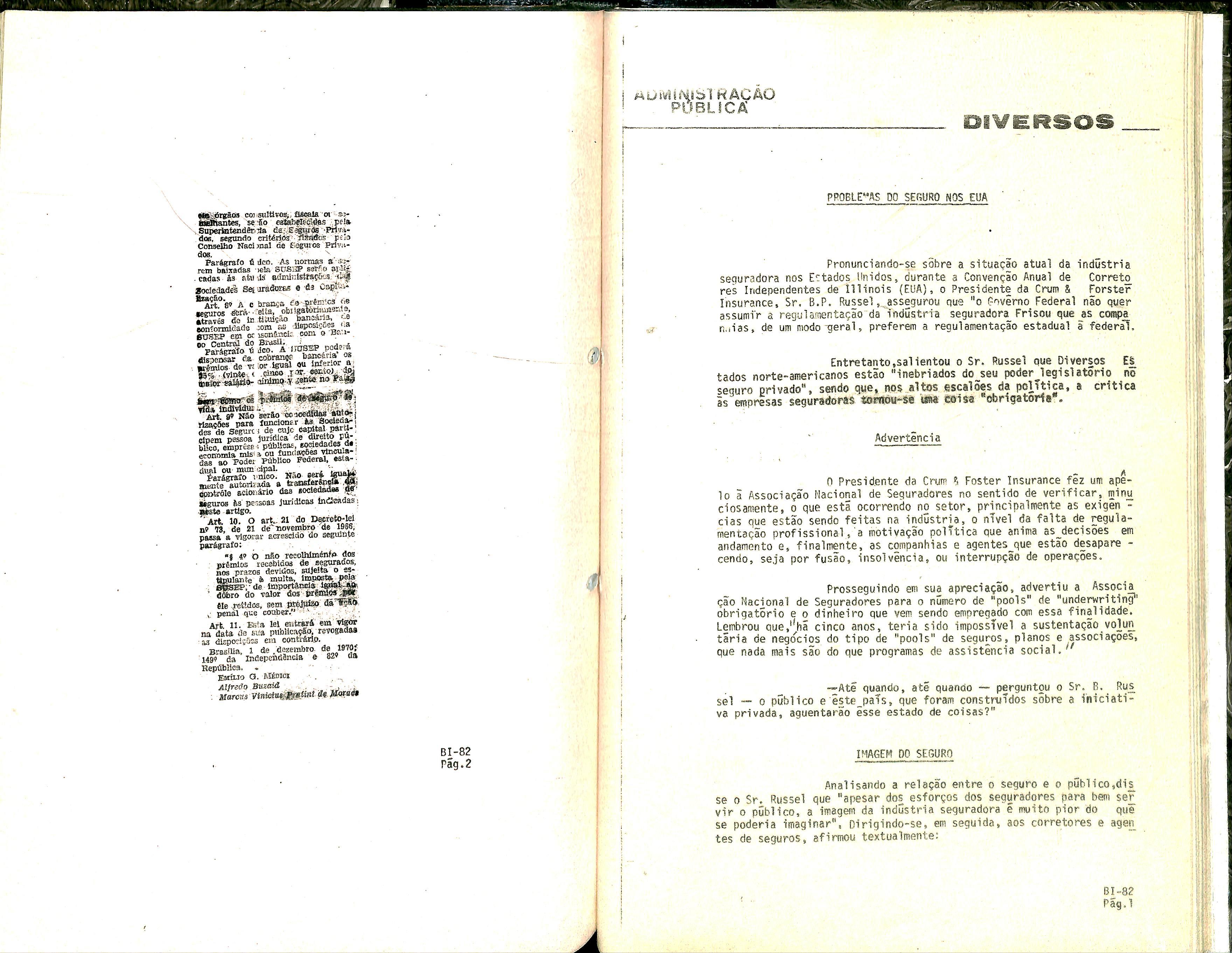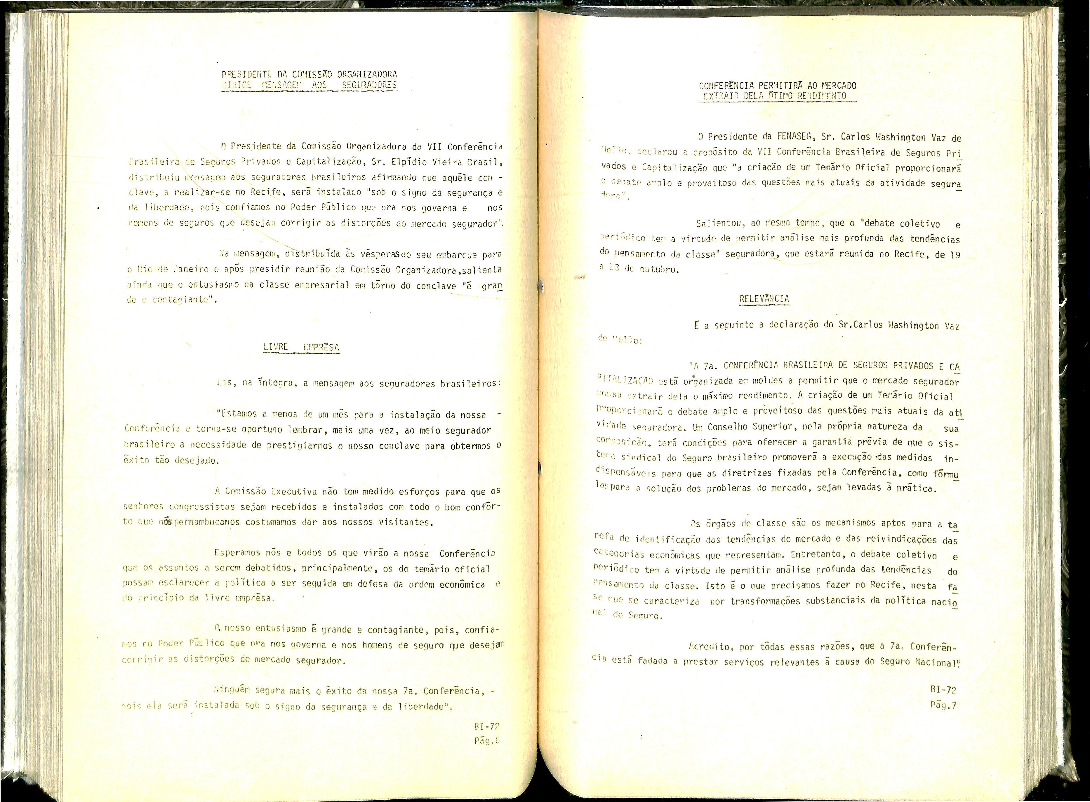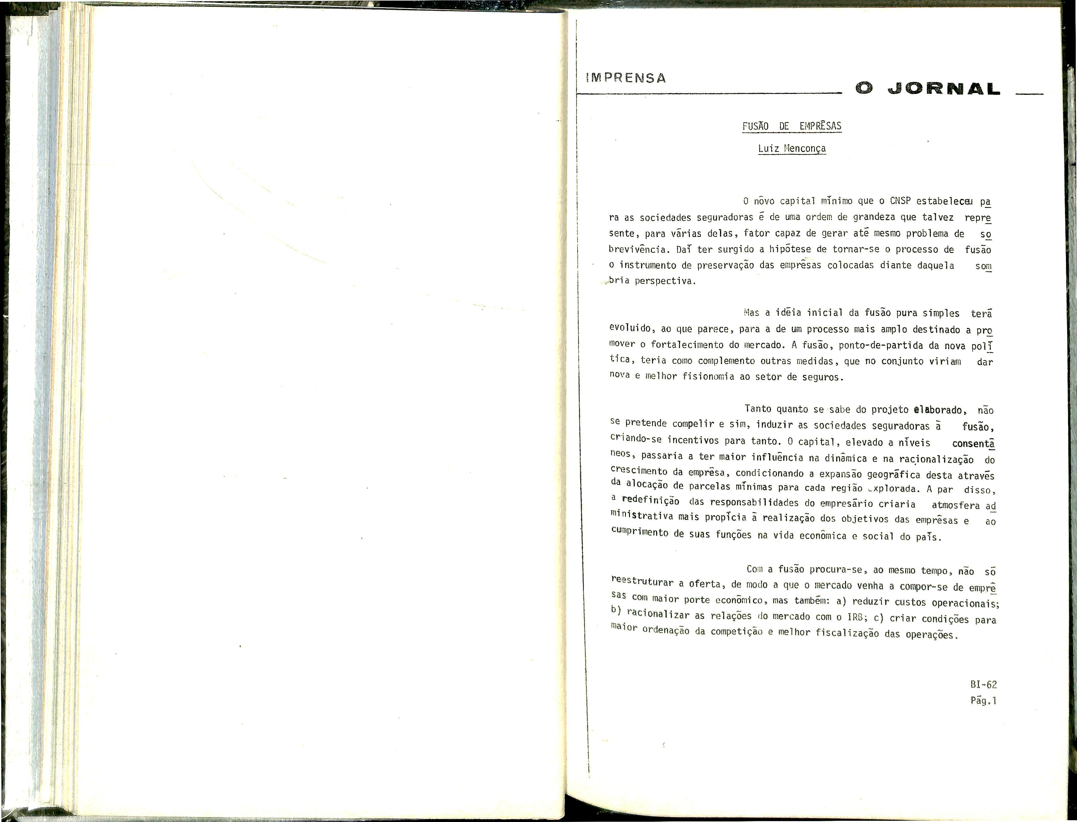 Marcus Vinic i.us A tnic1a•tlva. vfsav-a únic11. e exclusivamente t azer retorna r ao setor privado a c o nd u ção dos negócios de seguro A lei de estímulo ~s fusões não e coercitiva e, a.penas, f acilitou o dimensionamen to ecanômico do mercado. Existem hoje em o p eração no pai~ cêrca de 185 companhias ~tamos exam in a n d o 28 processos de f usao. m1cialmen t e de empr êsas perten ce n tes a um me.sm (, grupo Isto quer dizer que dentro de a! gnm tempo t erem os men.::s ct.r 100 con o a nh ia•s cguradora s no mercado, m a s ·,:arn cte r :z adas como emp!·êsRs s ól id as e inspira4!>ra~ da confümça pública