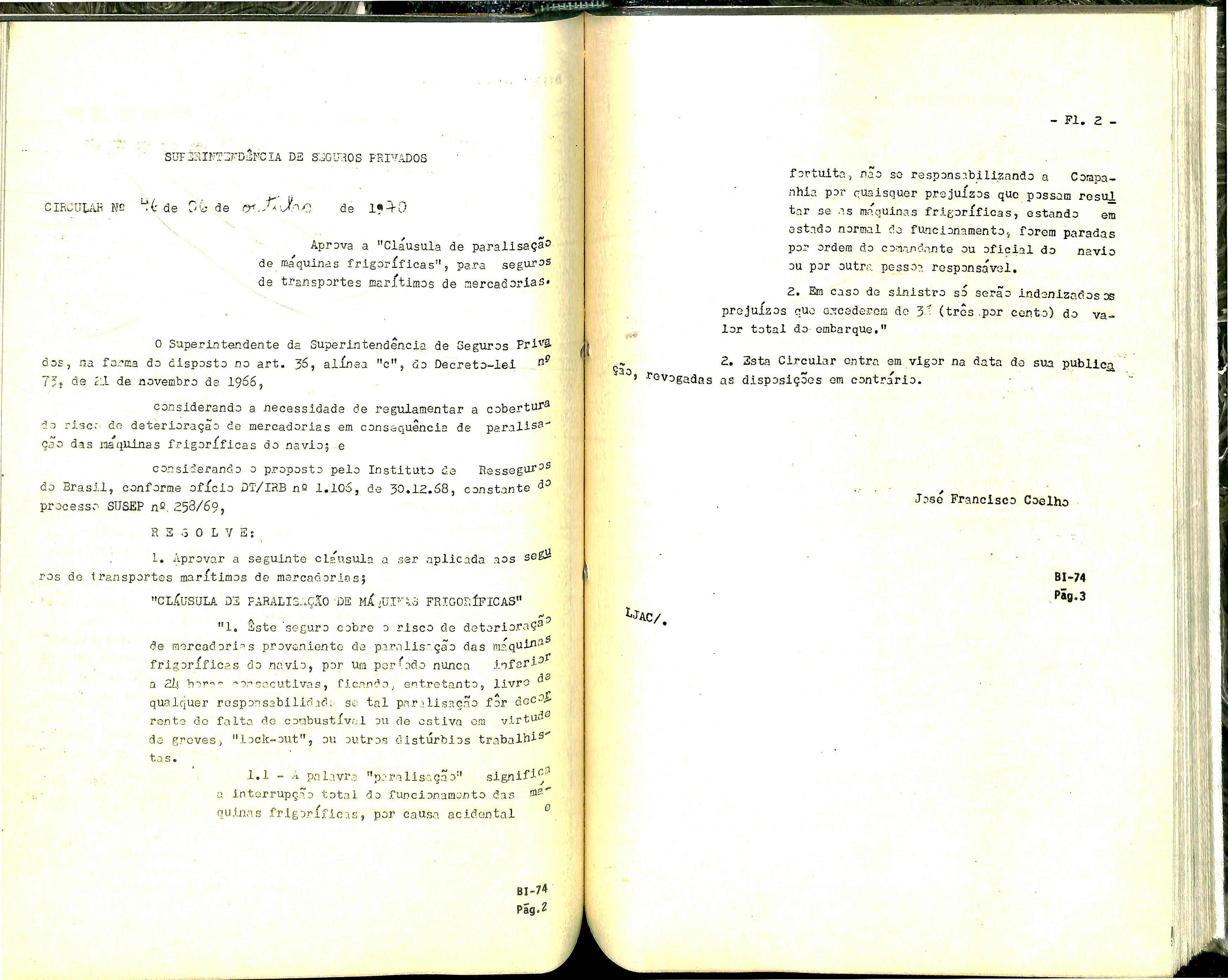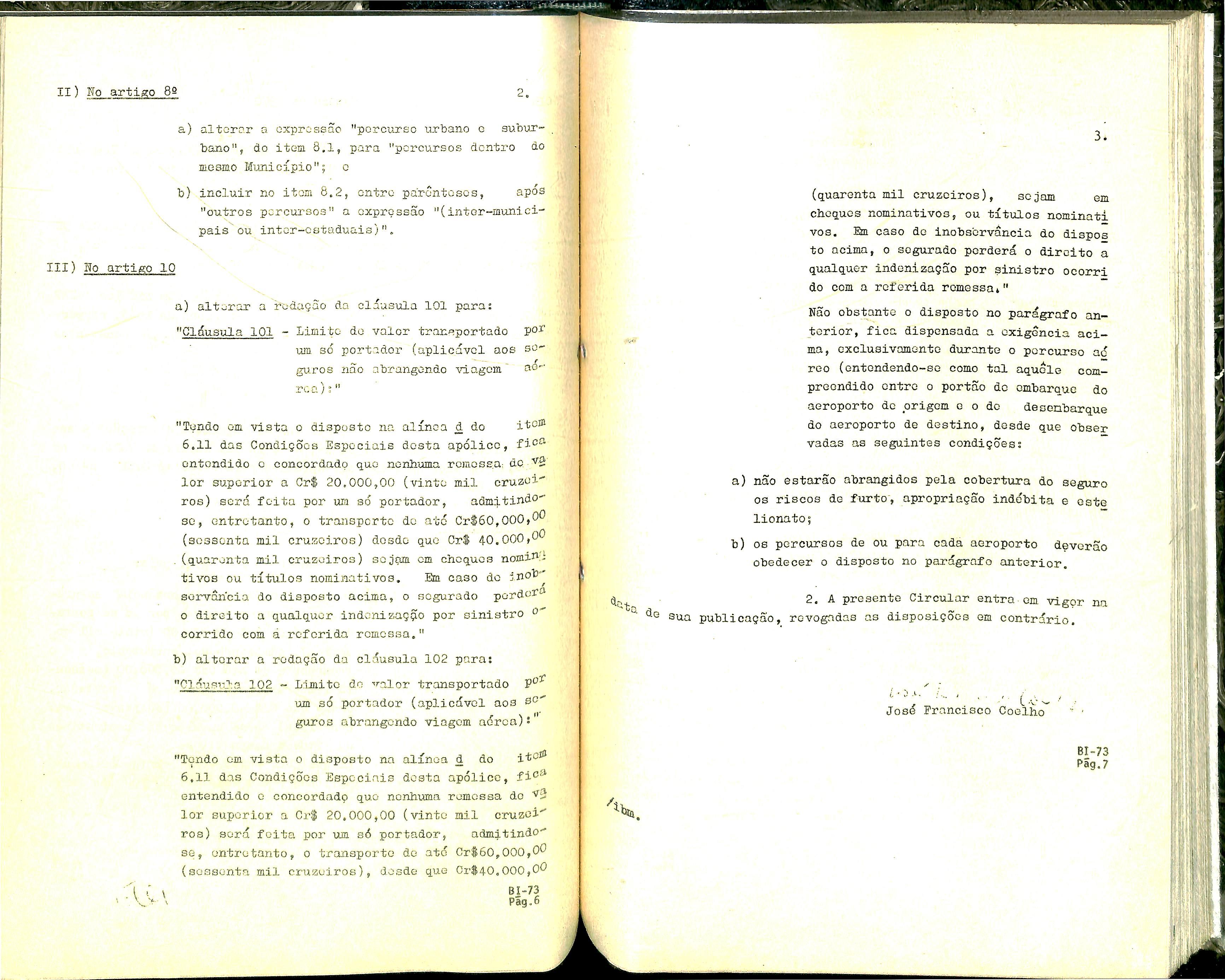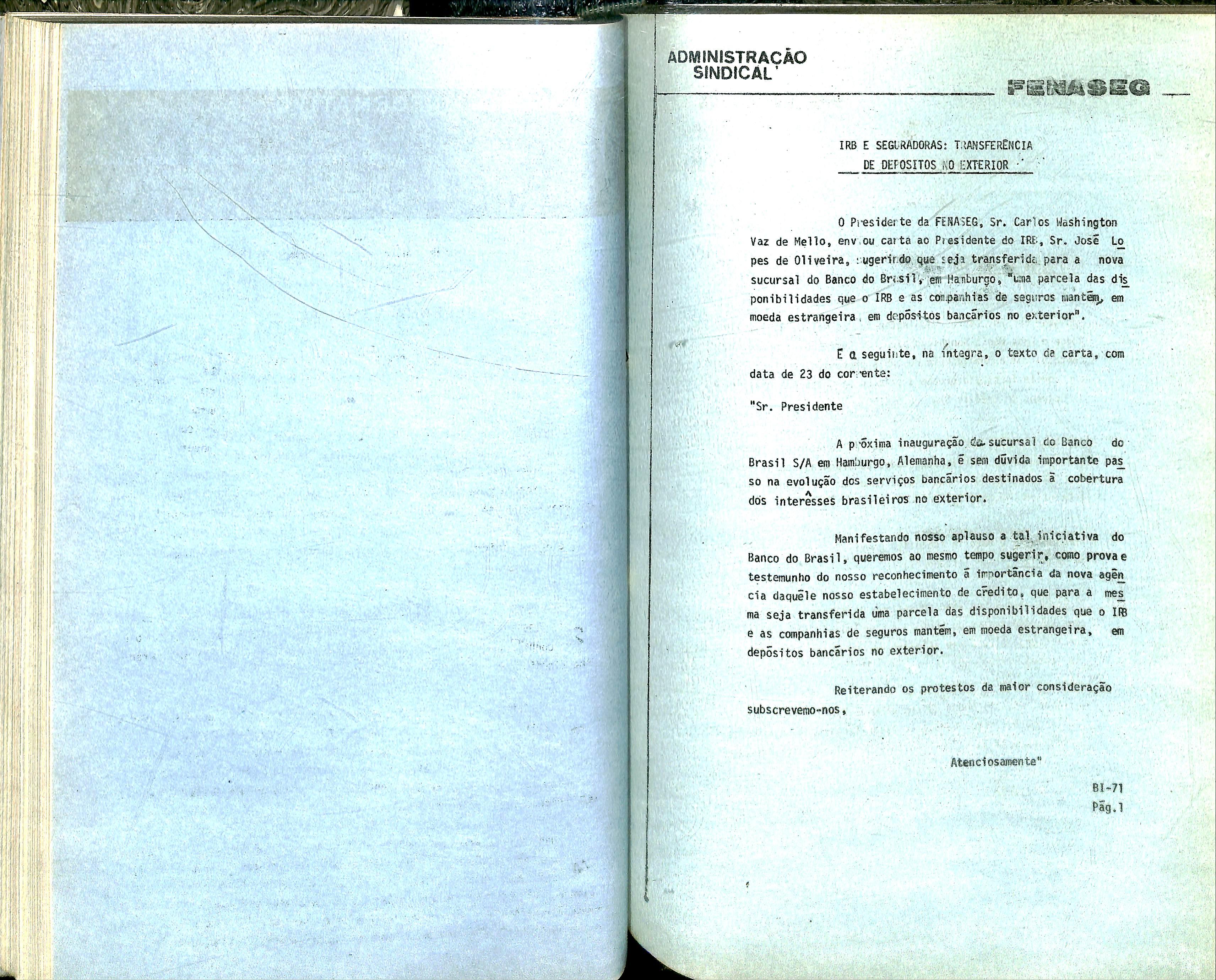 Será facu ltativo á s firmas faz er o s ef}uro em moeda estrn ng e ir a. Em caso de sua conveniência ou inte' rêssr nacional ( vi nda de •equip a m ento!- pr1 r a ,oristru ção da ponte RioN iterói, por exe mplo) o contrato porlerá ser fir mado n ó extE>rio r. sses casos ser5o estuda d os iso la dam e nte pelo IRB.