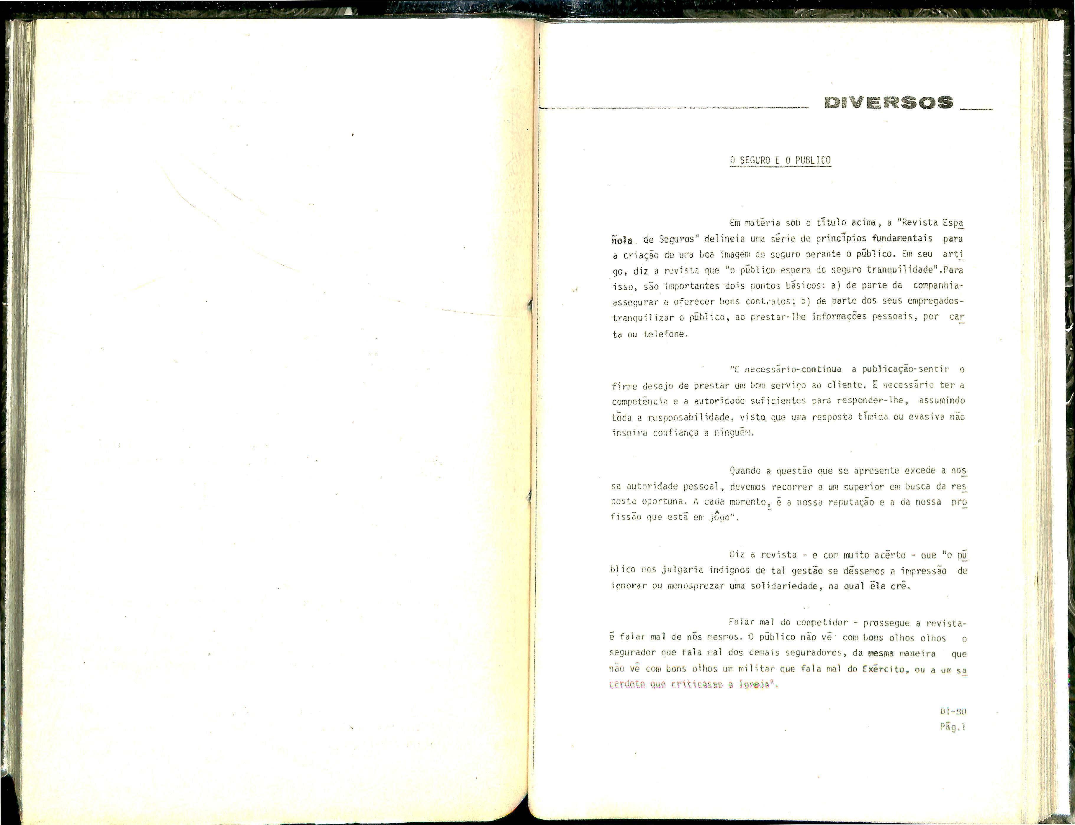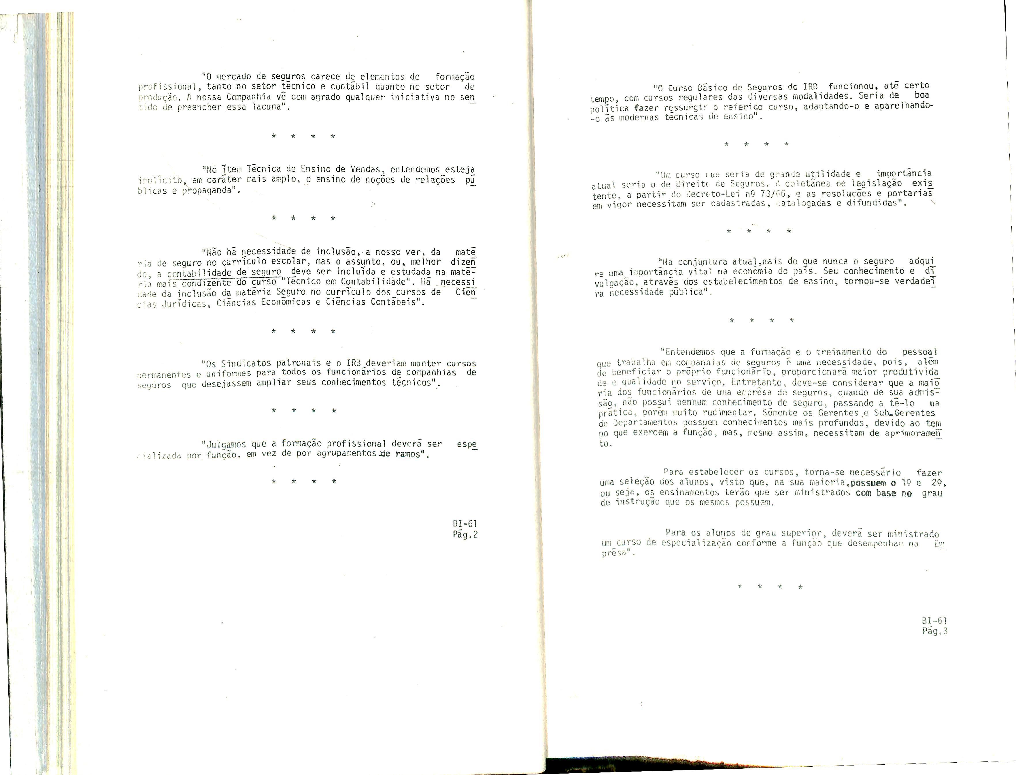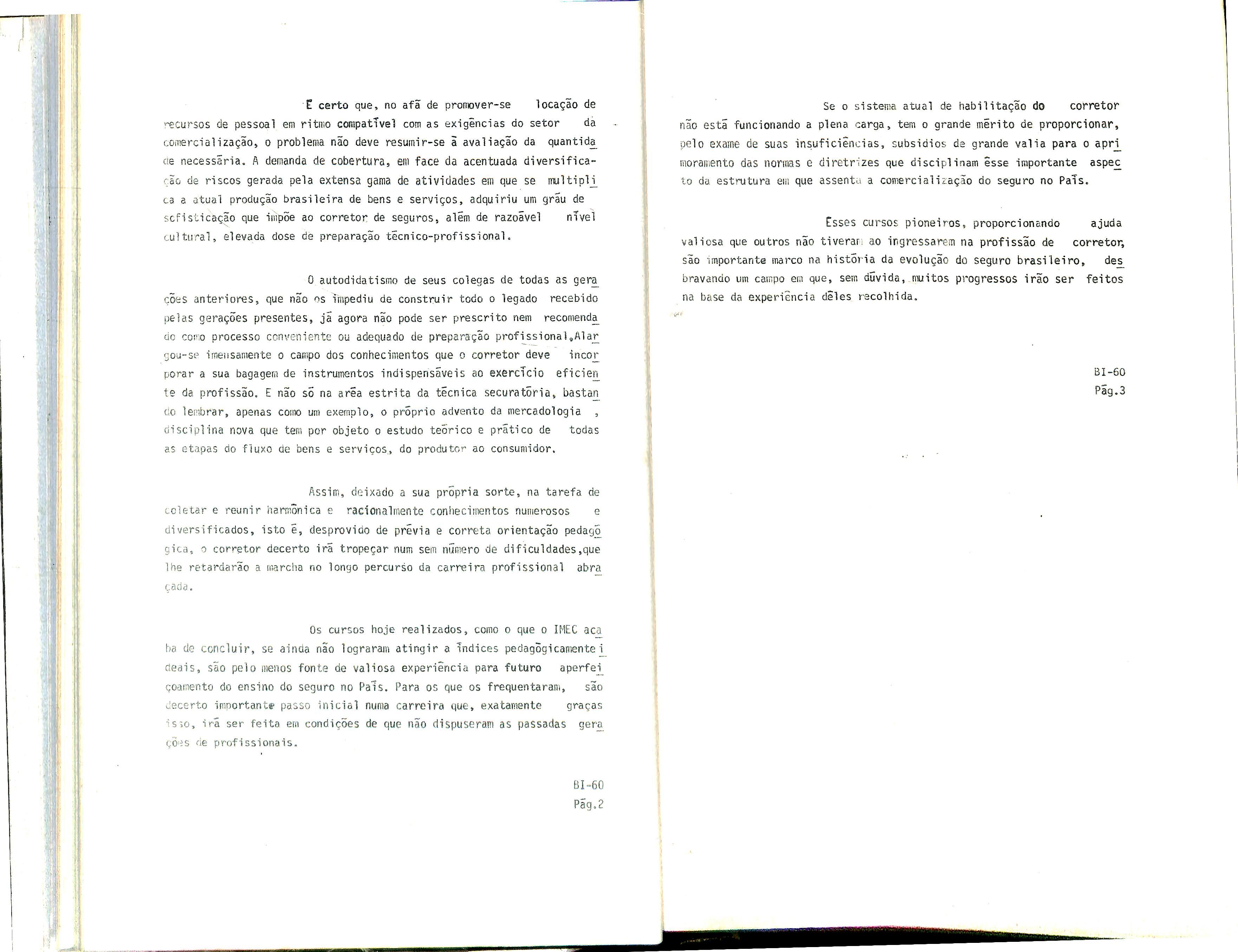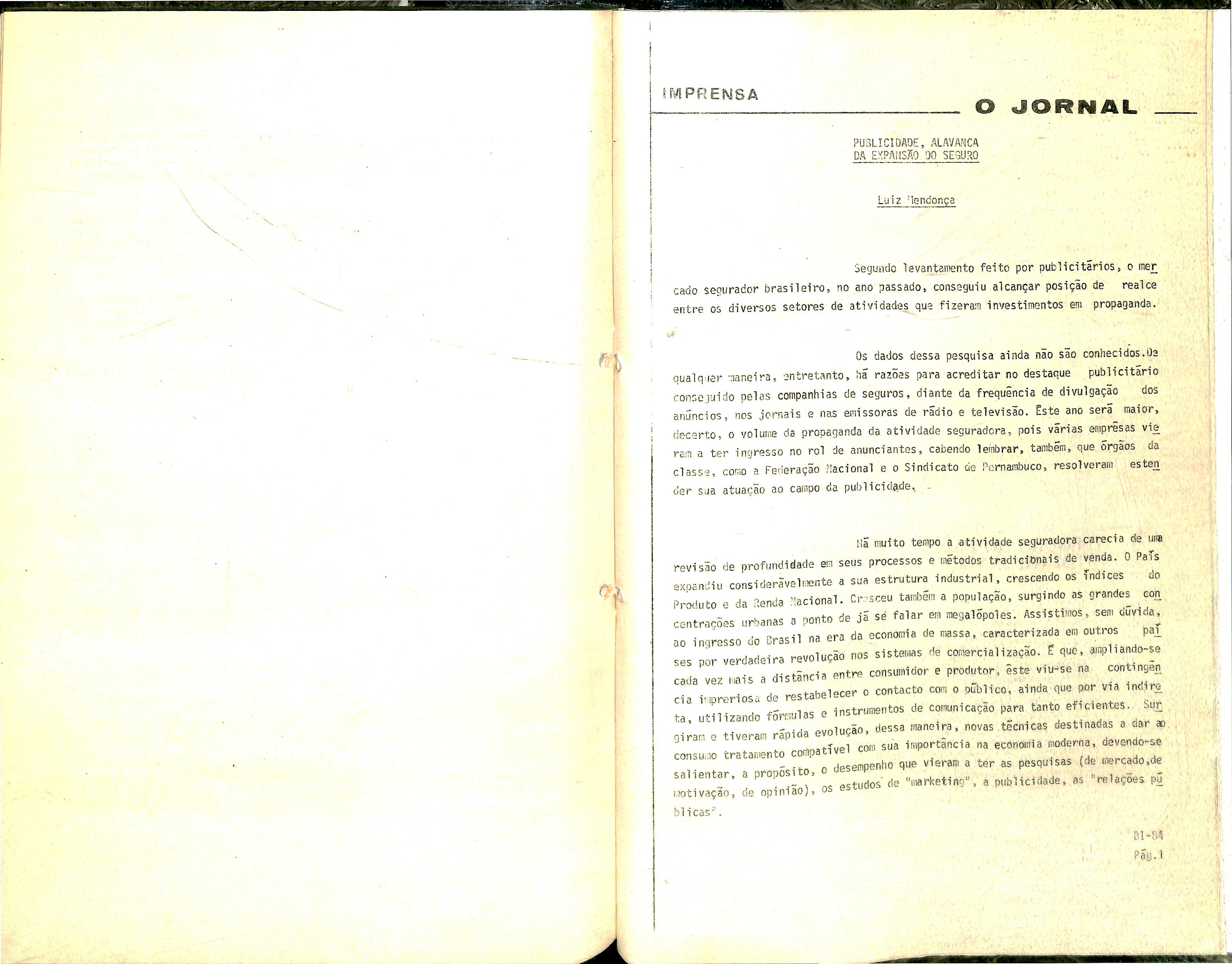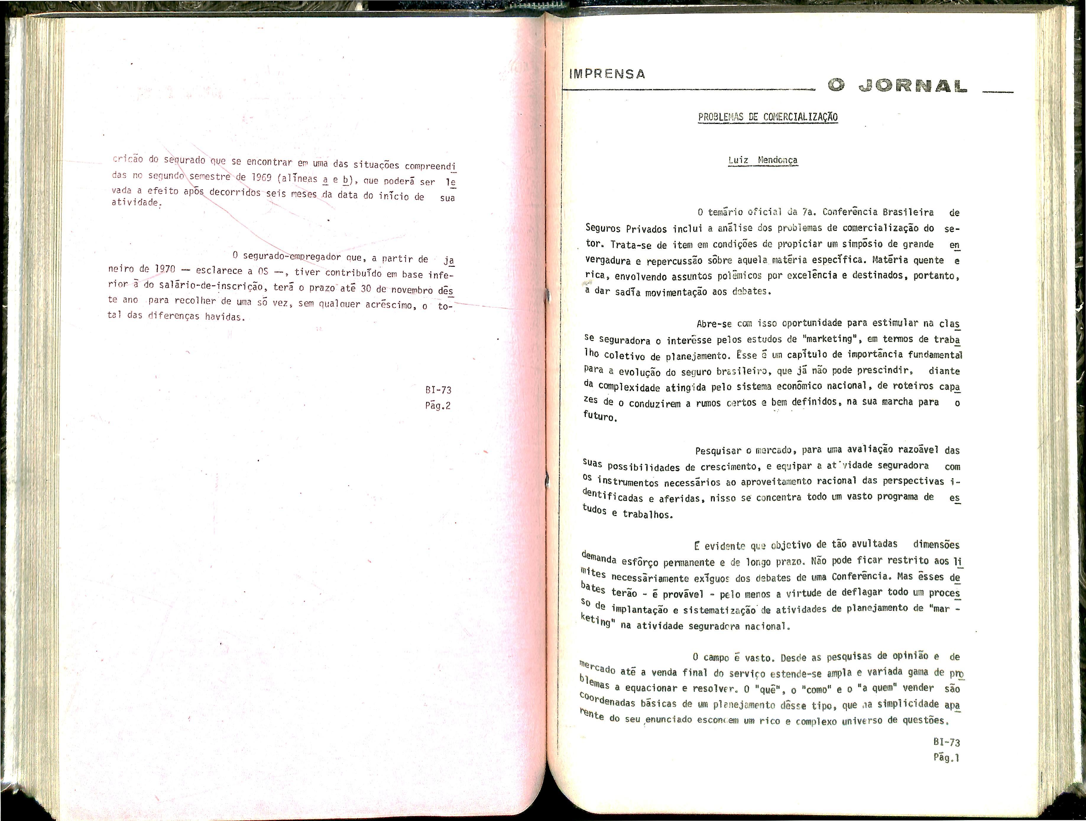 Hã muito tempo a atividade seguradora c are ci a de una r e visâo ci e profundidade em seus proc essos e m~todos tradicibnais de venda O Pafs eXf)â l1(~í u consi derãve l mer.te a sua estrut ura industrial, crescendo os índices do Pro d uto e d a 2e nda :'! acio na l. Ci-:,s ceu também a po pulação, surg in do as grandes co!!_ c 0 ntra çõe s ur banas a ponto de jã s é fala r em me galópoles Assisti mos , sem duvida, ao in gr es s o do crasil na era da e c onomia de massa, caracter i zada em ati,t ros paf ses por verdad e ira revolução nos sistemas de comercialização . t que, amp liando- se cada vez 11 ,a ; s a distância e ntre co nsumi dor e pr.odutor , ês te vi u~se na conti ngê!,1_ eia ; i,ipre rios c1 de restabelecer o contacto com o público, ainàa (J Ue po r via indir!?ta, utilizando fórr:iulas e instrumentos de comunica çã o para tanto efic;-ientes. Sur gir am e t iv er am râpida evoluçio, dessa maneira, novas ticnicas destinadas a dar~ con s u.,, o trata me nto comp atível com s u'a i mpo rtância na ec ón omi a mode ~·na, dev0ndo-·se salientar, a or o oõsito, 0 desem penh o qu e vi e ram a t er as pesquisas (d e mercado,de Q e· op·,·n,·-ao) , os estudo s· de '' mark et in g 11 a pub lici dade. a s "re l ações pQ uot i vac ã o, b1 i cas :, .
