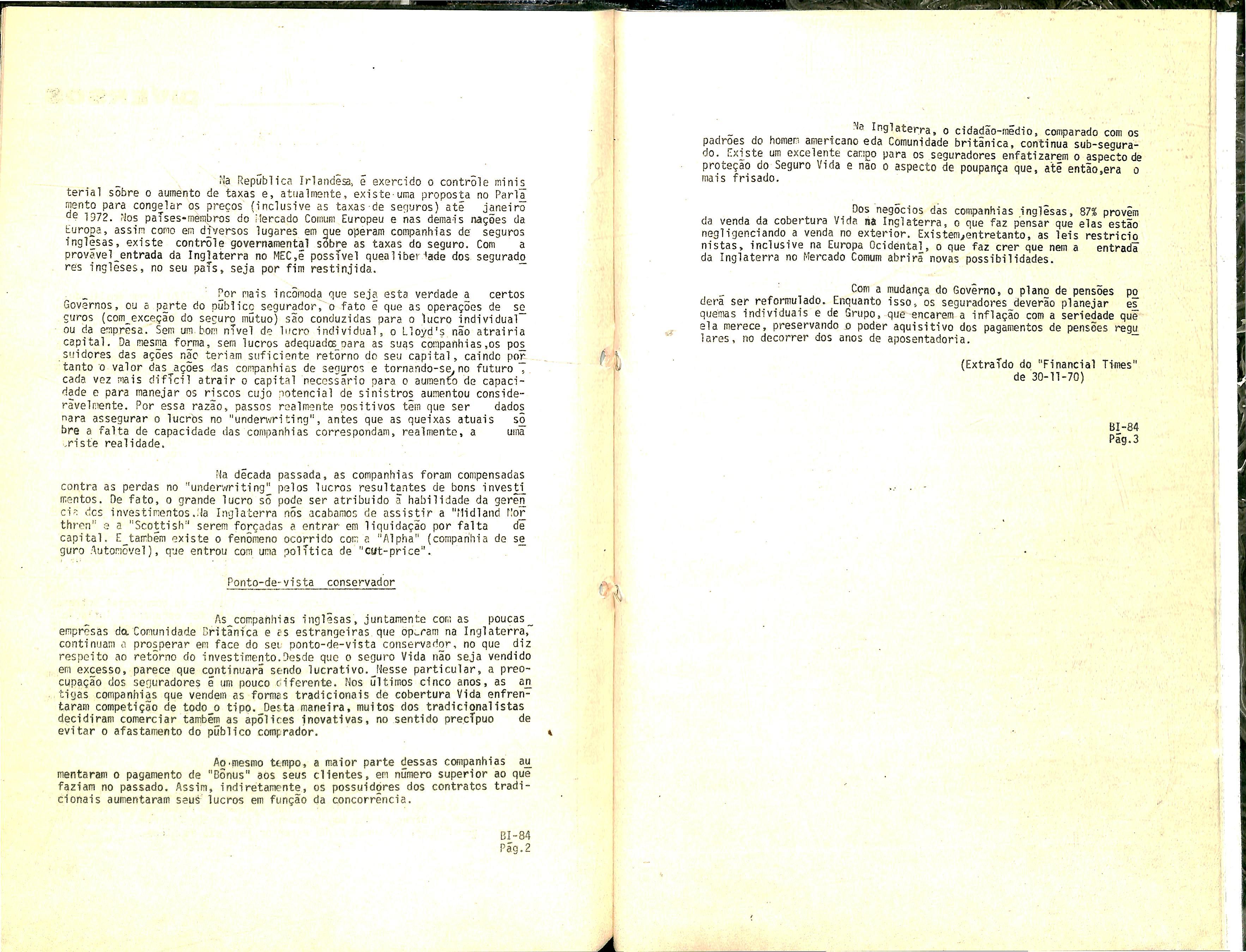Na Republica Irlandêsa, é exercido o contrôle minis terial sÕbre o aumento de taxas e, at 11almente , existe-uma proposta no Parla menta para congelar os pr eços· (inclusive as taxas·de ser,iuros) até janeiro d~ 1972. No s países• mempros do ;1er.cado Comum Europeu e nas dema-is nações da Europa, assim como em d.2''versos lugares em ~ue operam companhias de· seguros inglesas, existe controle governamental sobre as taxas do seguro Com a provâvel entrada da Inglaterra no MEC,ê possível quealiber·lade dos segurado res inglêses, no seu pais , seja por fim restinjida. -