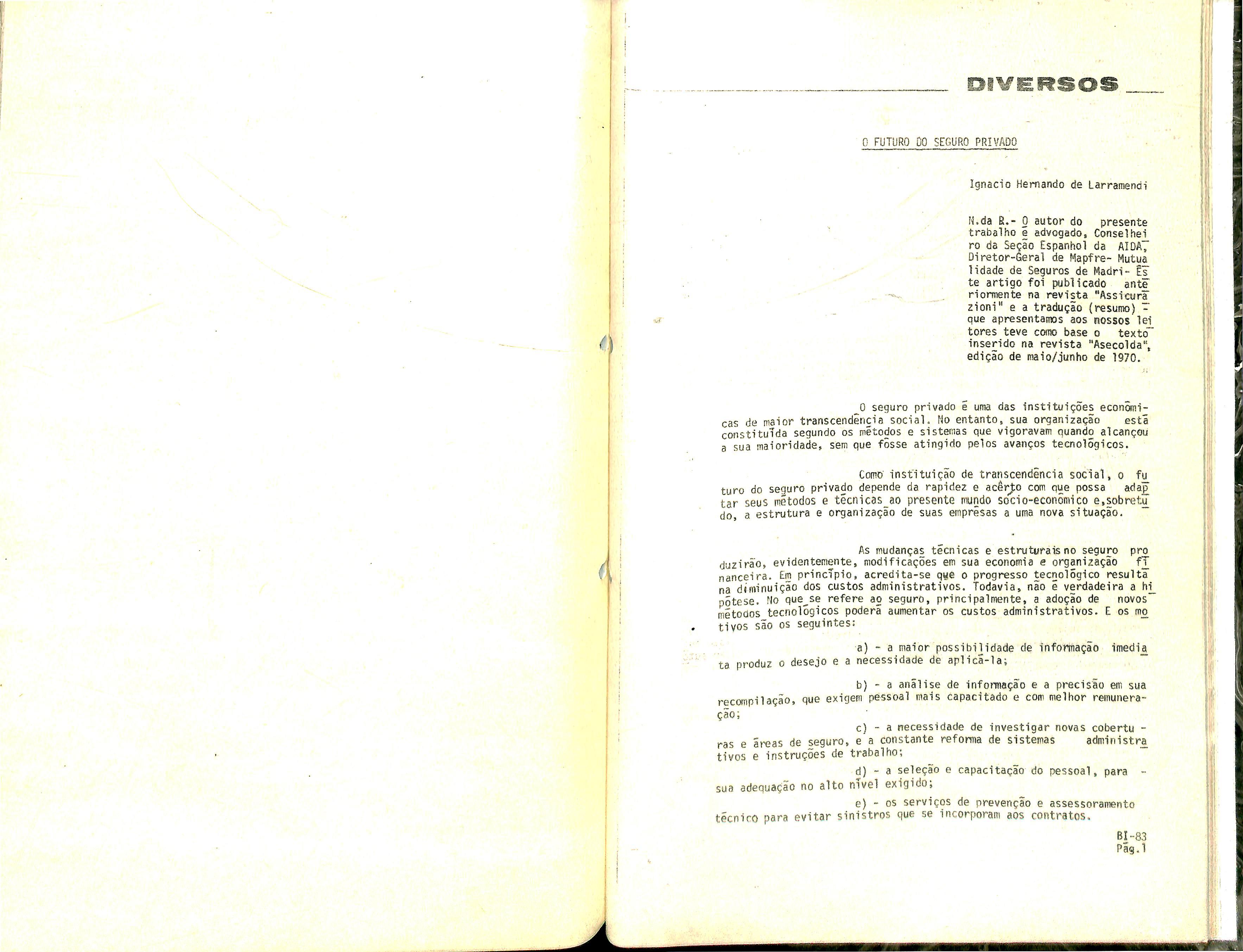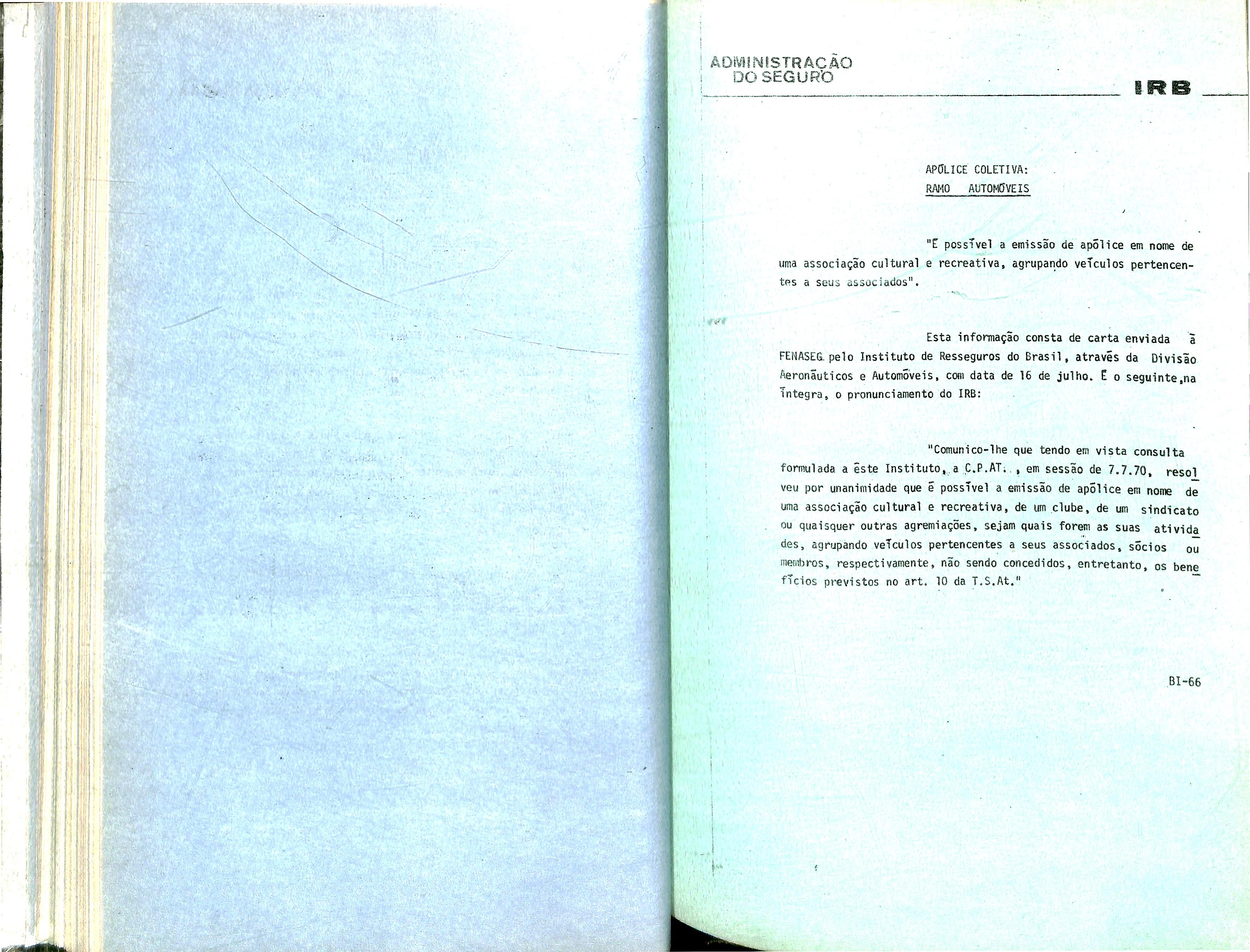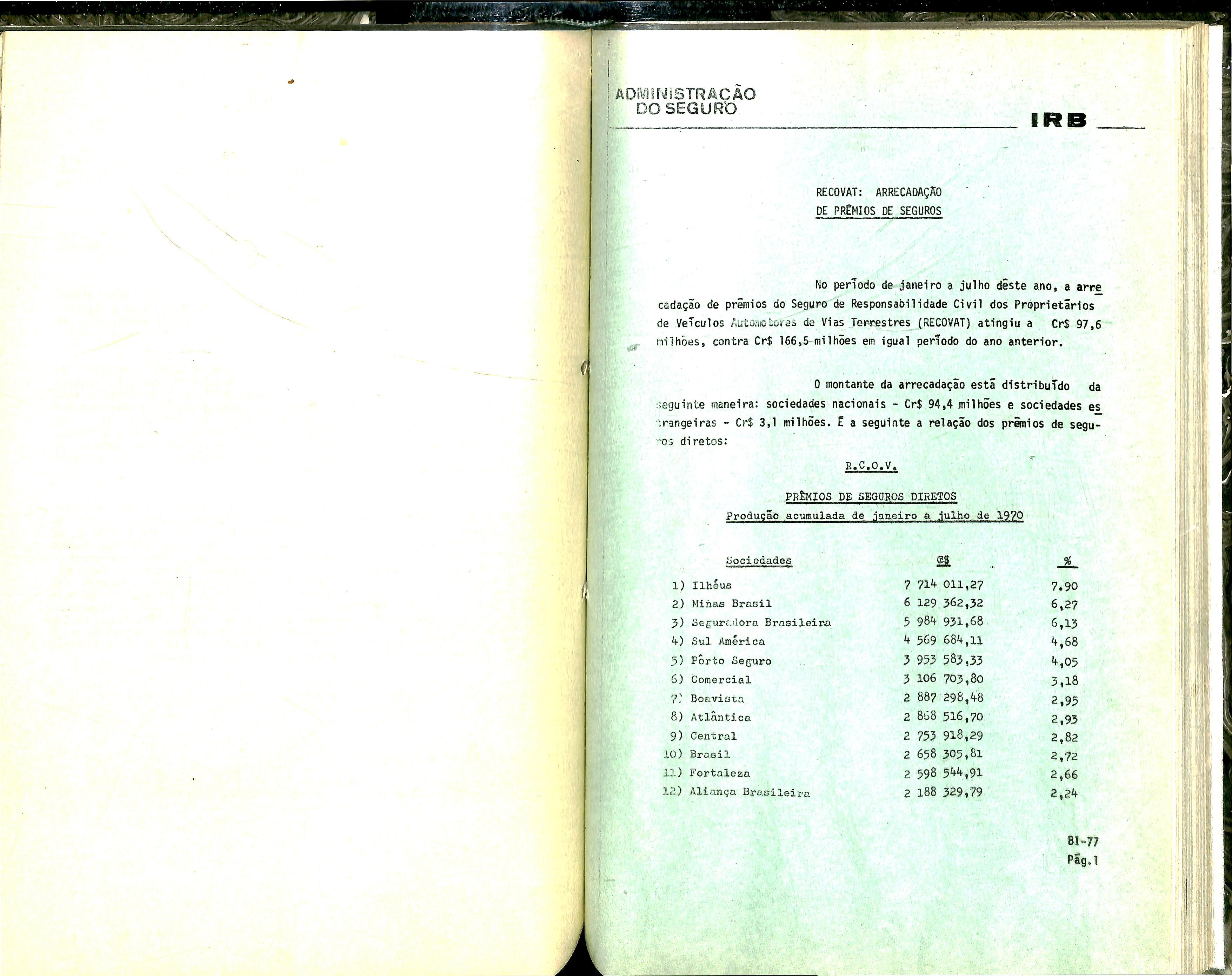gar am memoriais d o Rio e de Sio Paulo, con traditórios às vêzes, o que de mo nstrava a sur prêsa d o ocorr ido. E o g ovê rno, êle p róprio , reagiu co m a elaboração de sua poiítica globa i de seguros ( R evista do IRB - outu bro de J 970 ) Diga- se que é a p·rimeira vez q ue existe uma p ol íli ca definida p a ra o sét o r, o que , sem d úvida , é alt amente positivo. E , também pe la prime ir a ve z, o mcrc a<lo, solici tado p elo ministro, enc a rre gou um a em p rêsa especial izada d e el aborar um estud o comple to da situ aç ã o. Com êsse q u ad ro é de p e r gunt a rse quai a perspectiva do exe r cíc io cm vé spera <le t e rm in a r'? Ao que parece uma ligeira m e lhor ia notada no ú lt imo t ri mes tre, ate nuar á um c omp o r t a, me nte que se esperava m u to pról(imo daque le de 19 ~ QU , talvez pio r e c erto, p or tanto• qu~ as causas que es tão sen do pesquis~d~s continuaDJ. a t uan tes e os resulta d os de algumlls medidas já tomadas não produziram, ainda , o efeito de.sei"°· ~,,• .