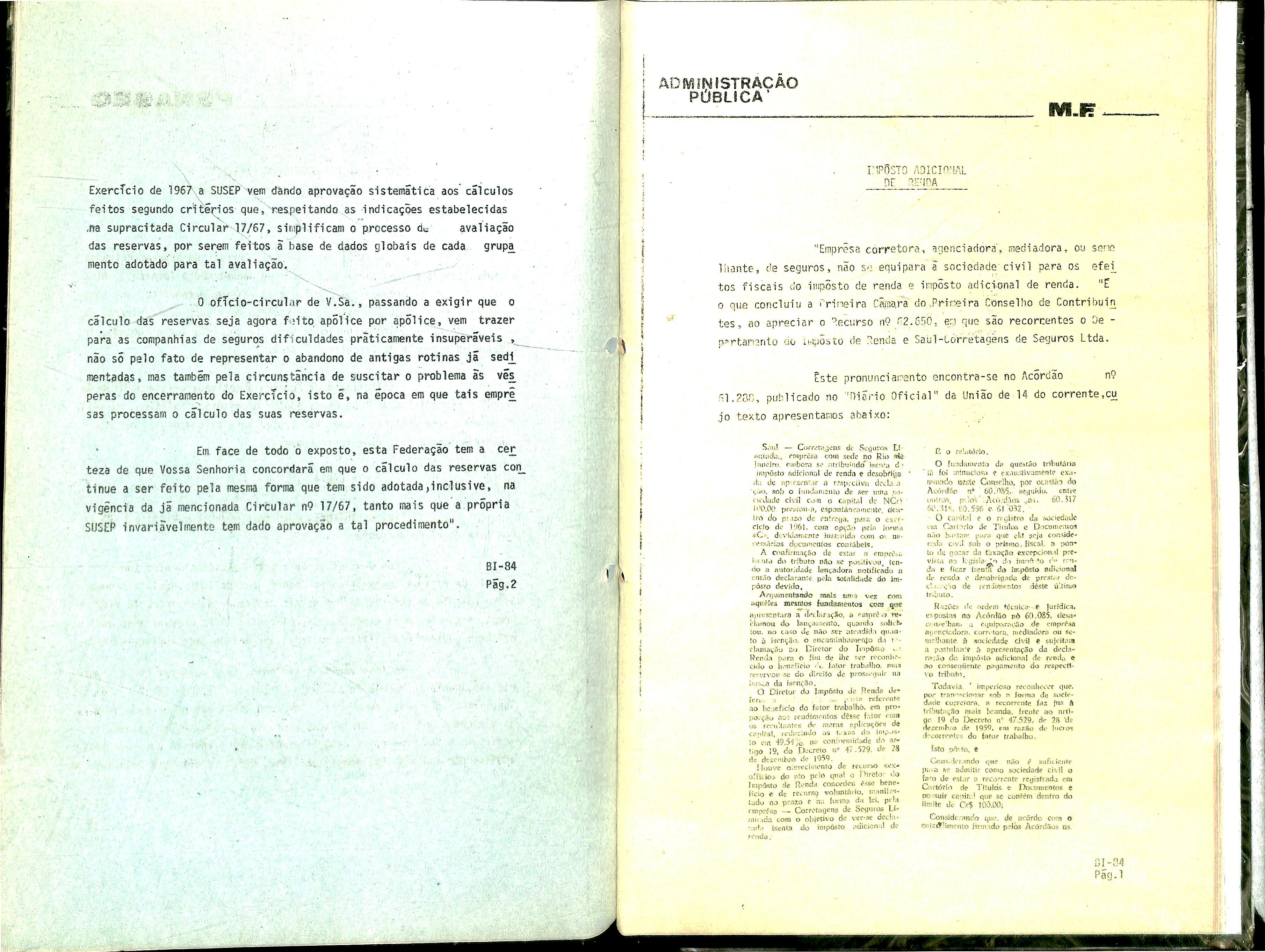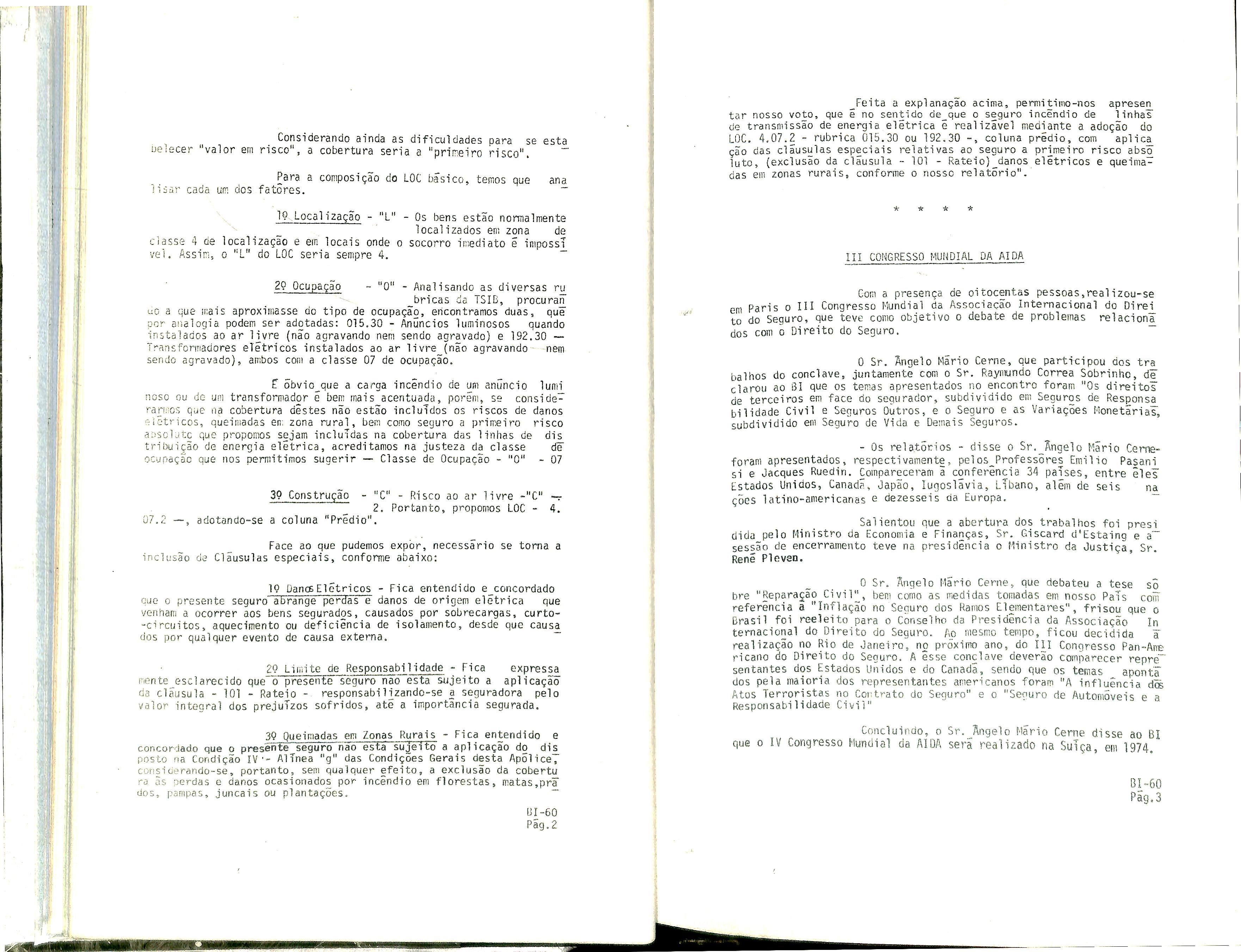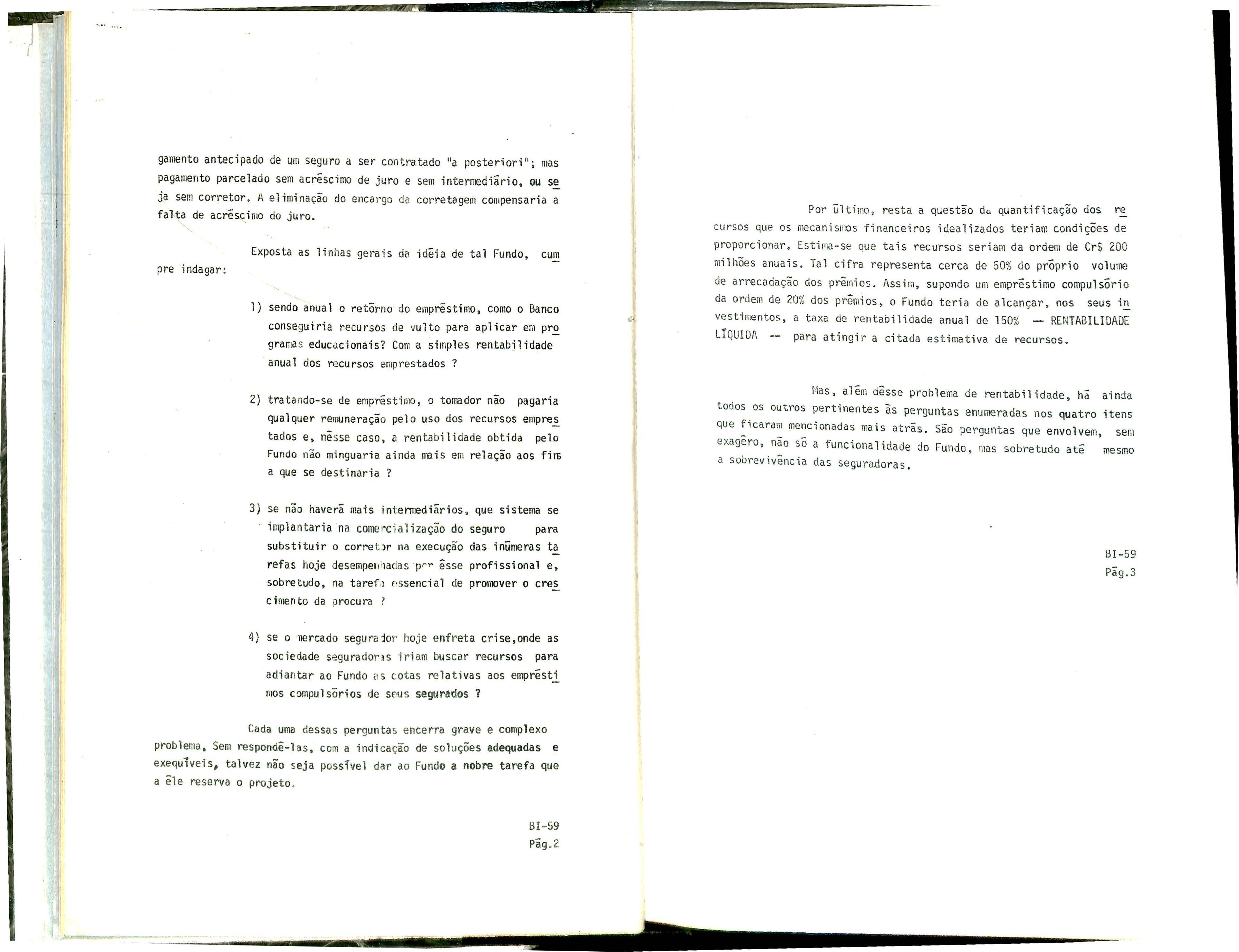 gar am memoriais d o Rio e de Sio Paulo, con traditórios às vêzes, o que de mo nstrava a sur prêsa d o ocorr ido. E o g ovê rno, êle p róprio , reagiu co m a elaboração de sua poiítica globa i de seguros ( R evista do IRB - outu bro de J 970 ) Diga- se que é a p·rimeira vez q ue existe uma p ol íli ca definida p a ra o sét o r, o que , sem d úvida , é alt amente positivo. E , também pe la prime ir a ve z, o mcrc a<lo, solici tado p elo ministro, enc a rre gou um a em p rêsa especial izada d e el aborar um estud o comple to da situ aç ã o. Com êsse q u ad ro é de p e r gunt a rse quai a perspectiva do exe r cíc io cm vé spera <le t e rm in a r'? Ao que parece uma ligeira m e lhor ia notada no ú lt imo t ri mes tre, ate nuar á um c omp o r t a, me nte que se esperava m u to pról(imo daque le de 19 ~ QU , talvez pio r e c erto, p or tanto• qu~ as causas que es tão sen do pesquis~d~s continuaDJ. a t uan tes e os resulta d os de algumlls medidas já tomadas não produziram, ainda , o efeito de.sei"°· ~,,• .