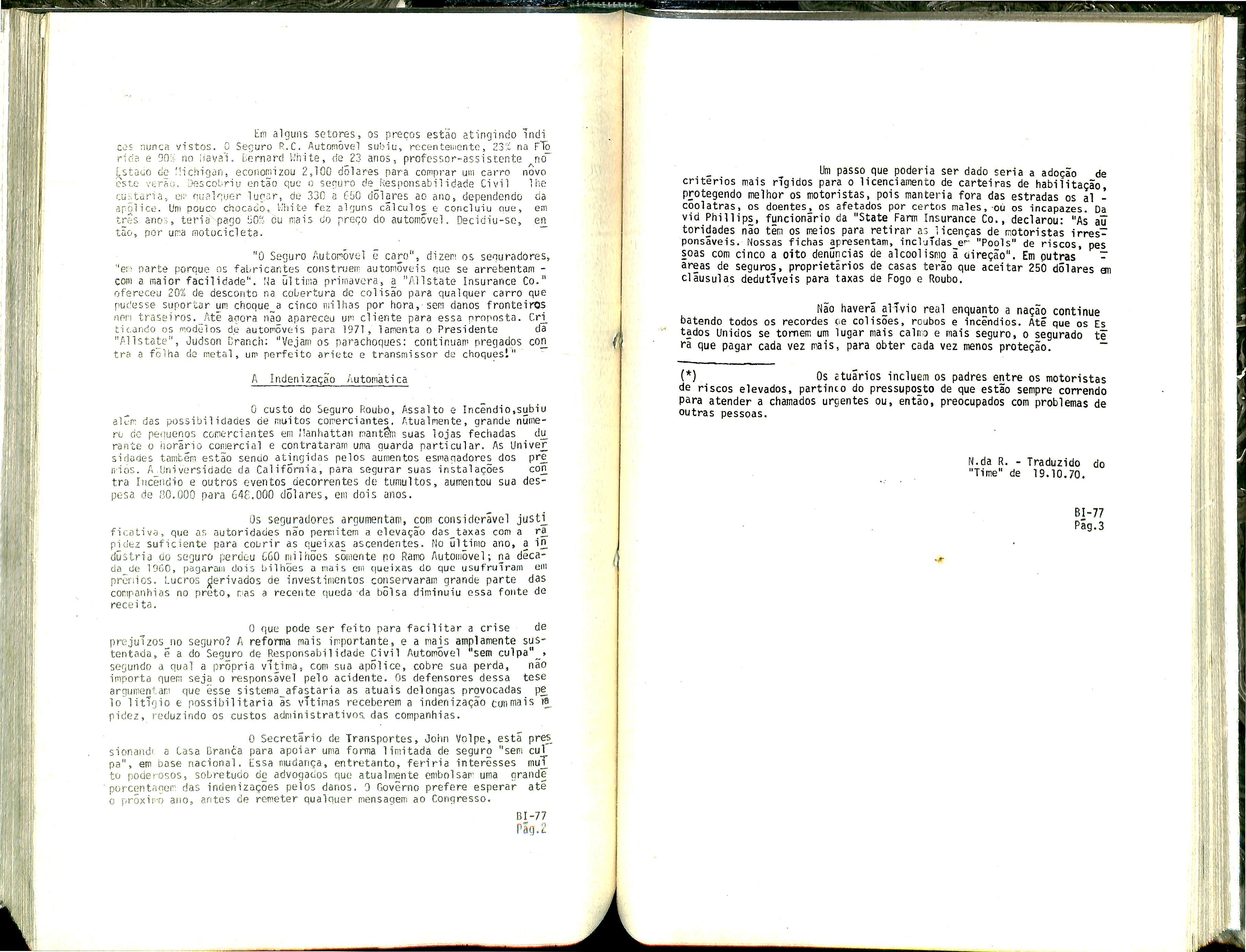 _ ... . Os balancetes das c ompa.nhias não foram, em med ia, prop1c10s, enguanto a i nflação continua suà obra devastadora . Embora a r Emda de premios tenha afluido den s a e rap idamente (com a l guns segu r adore~. aumen tando as taxas do ramo Automõvei s du às vêzes ao ano), talve2 sejél ta rde demais para influ ir· fa vorãvelmente ; nos resu lt ados • de 1970