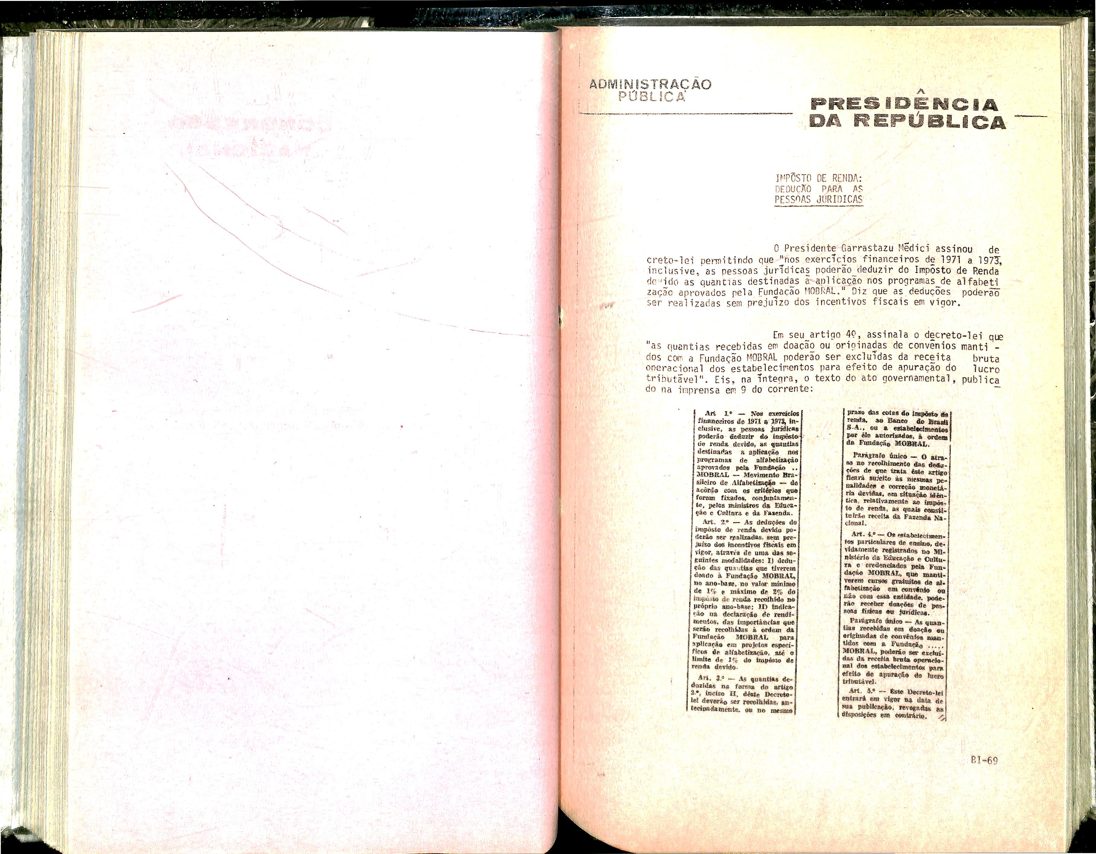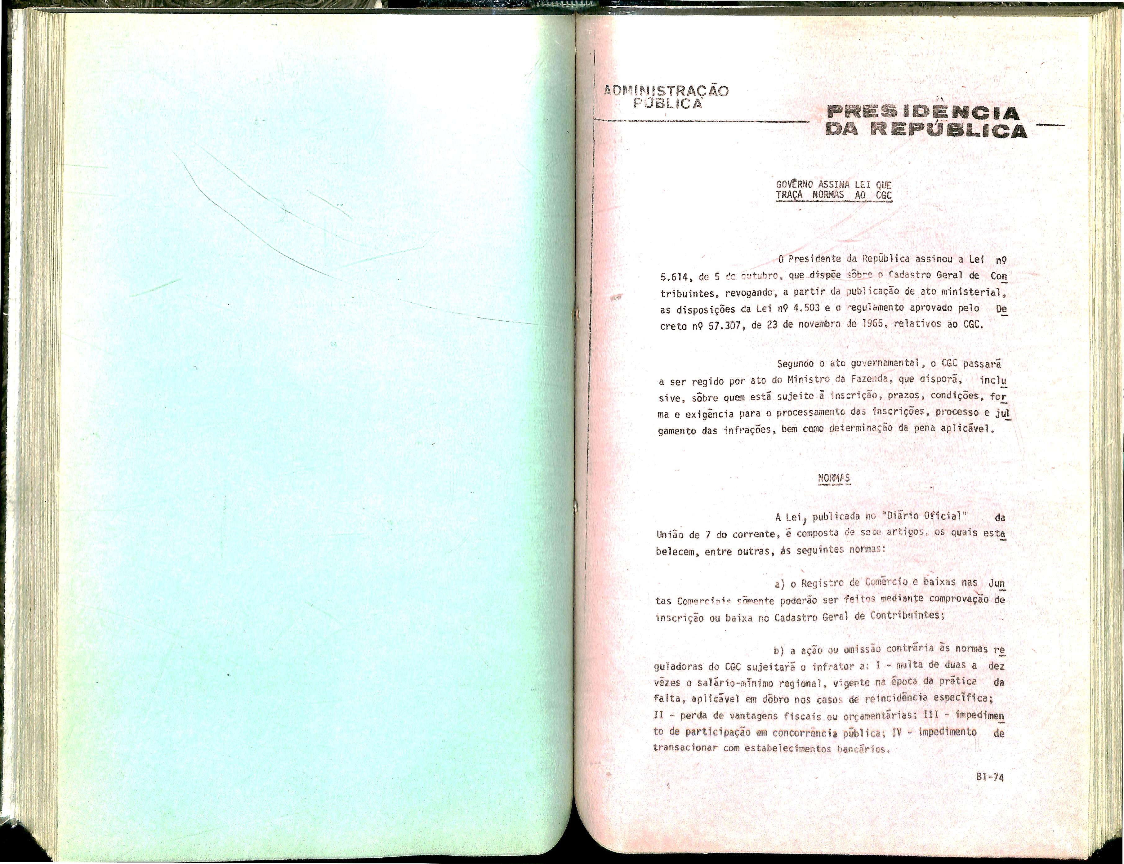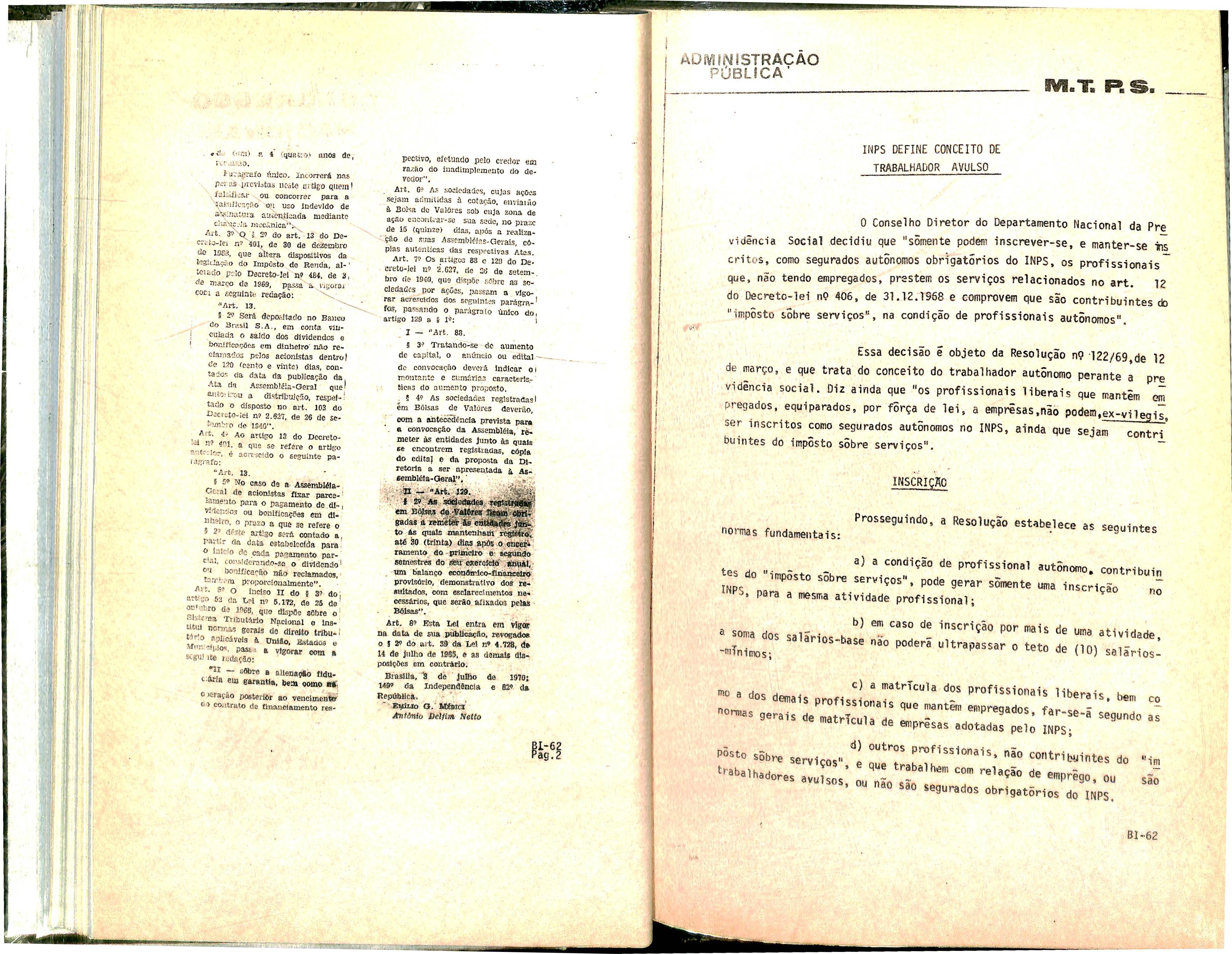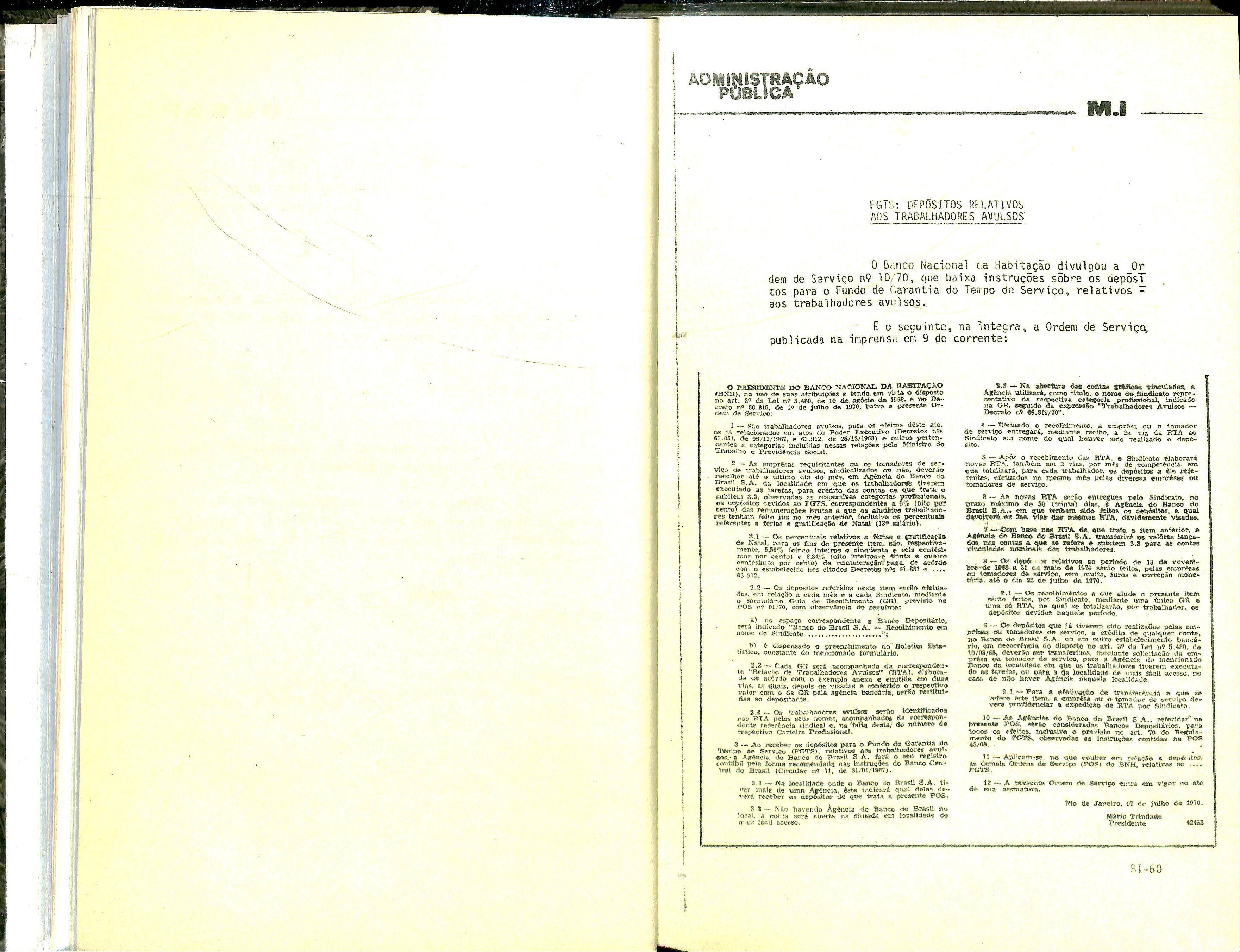 O Presidente da Republica assinou decreto, segundo o qua1 as emprêsas qlE 3 tenham contrato com trabalhadores para serviços avu 1sos es!:ão obrigadas a recol her ao Banco do Brasil, no prazo de 20 dias, os va,ores correspo~ dentes aos depõsitos devidos ao Fundo de Garantia por Tempo de Serviço De acor qo c om o ato presidencial, o recolhimento abrange o per,odo de 13 de dezembrode 1968 a tê o -Último mês vencido. 4