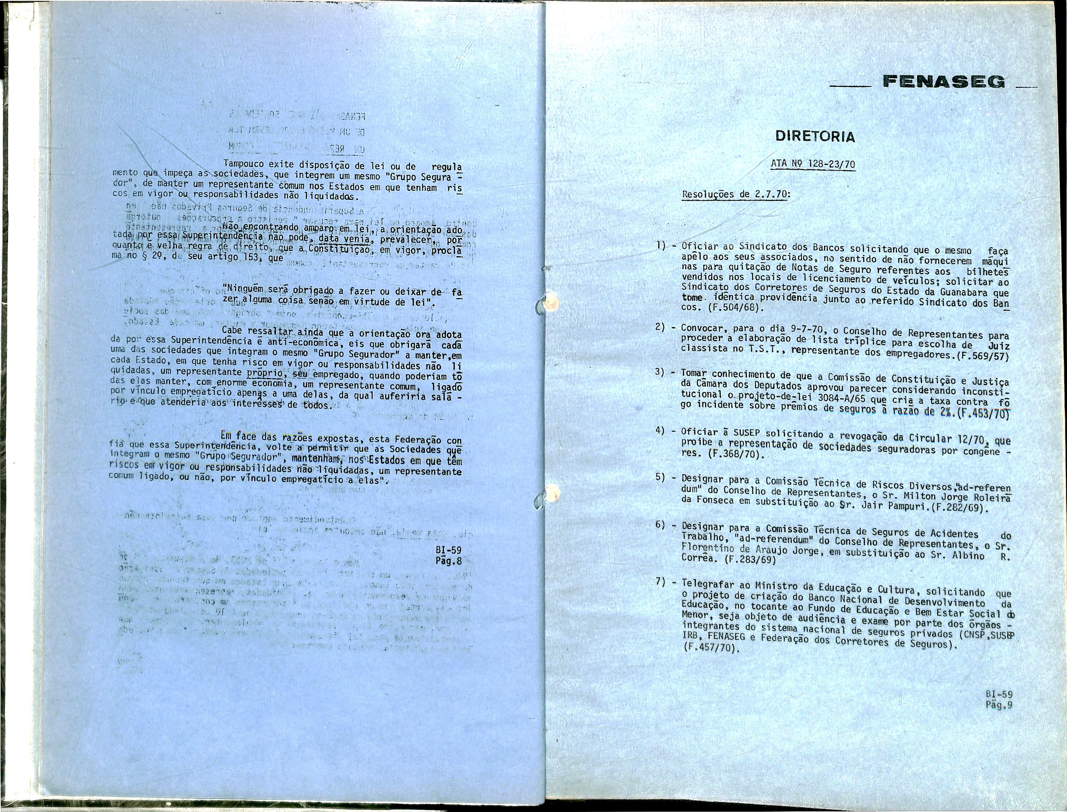 7.) - Sugerir ~ Oi retoria a'·..a ção cç, r j unta da FENASEG e Si,.,dicato do Corretor--es no se nt i ~o de -~ue ! )l~!'~ ~v~~ a r -se a !'epeti ção tifl deturpaçoes...f ó.p"~oces-ic -de an-gariação de seguro RECOVATttas proximidad es de rfpartições púb l icas, seja s~ licitado um apêlo do Sindicat~ dos ~ancas aos seus ass9cia dos, a fim de que -êste~ não fcrneça~ mâquinas para a qui •" ,# fltação de notas de segur'O----ogs l)cais de venda dos bilhetes. (F. 504/68).