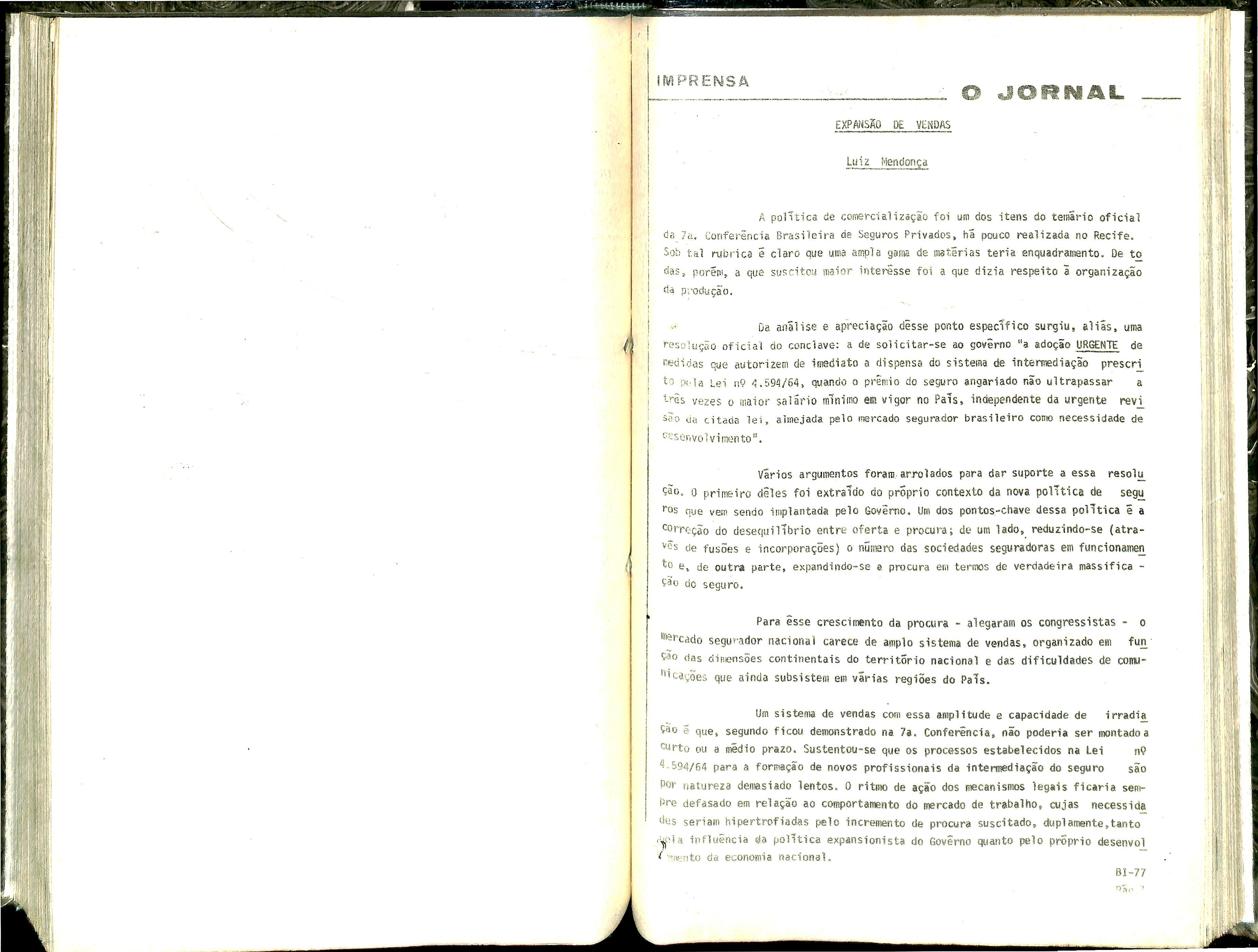 Os dados dessa pesquisa ainda não são conhecidos.O~ qu a1q 12r "':lanefra, ?ntret<'lnto, :,-ã razoes para acreditar no destaque publicitãrio c onsc J Ji do pe l Ds companhias de seguros, diante da frequincia de divulgação dos anGncios , nos jo r nais e nas em issoras de rãdio e te levisão. tste ano seri maior, d0c ,? r to, o volu rne d a propaganda da at ivi dade seguradora, poi s vãrias emprêsas vi~ ra :TI a t er i n9resso no rol de anunciante s, caben do leinbrar, também, que órgãos eia clas s ·~, c or:m a Fe ci eração ~!aciona l e o Sindicato ci e Pe rnambuco, resolveram esten cie r sua atua ç ão ao campo ela publicid~.de -