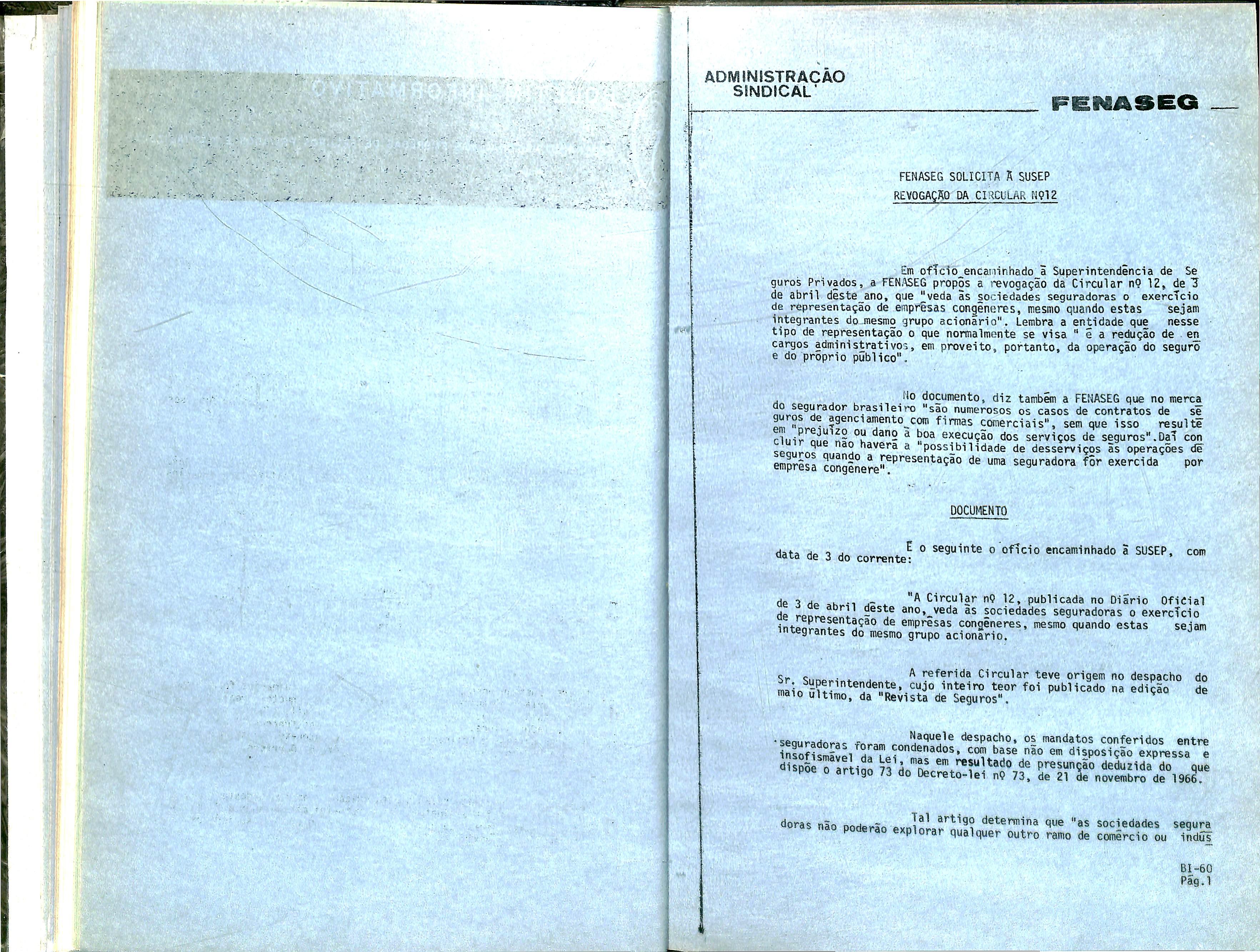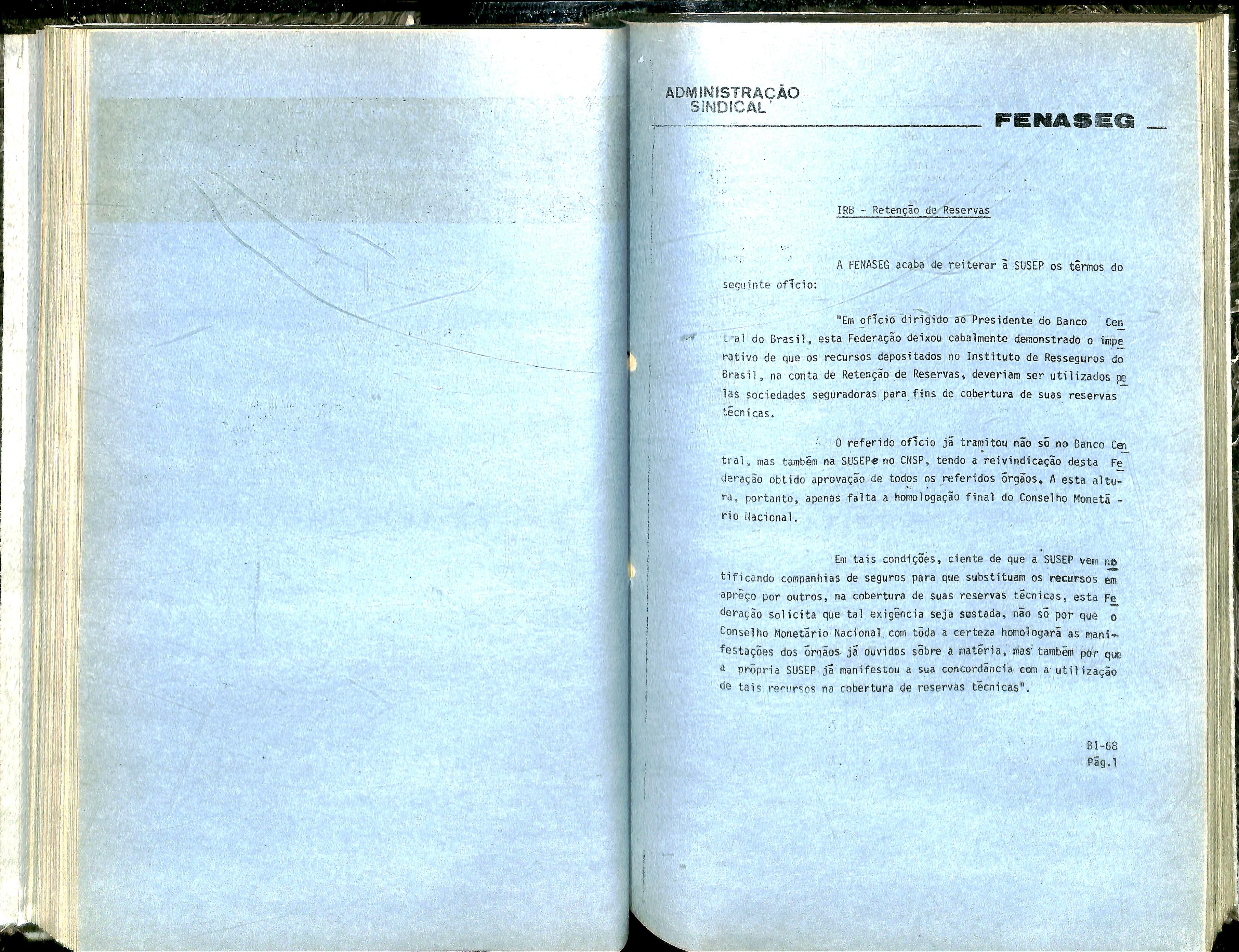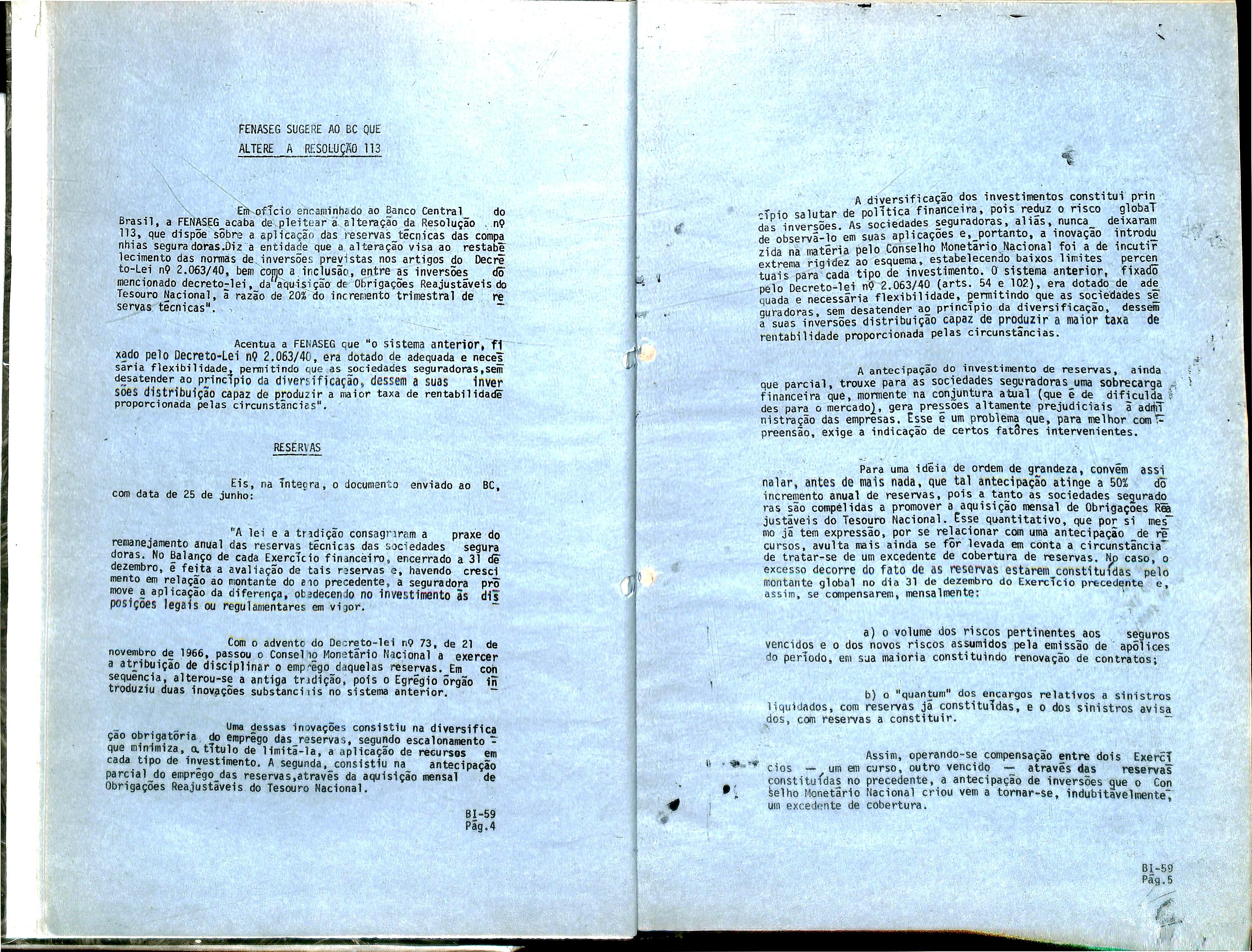 2 A FENASEG enviou:docuÕ1ento ao fianco Central, so~icitando a alteração da Resol~ção nQ 113, que dispõe sôbre a aplicação das reservas técnica, . _das empresas seguradoras. Segundo afinna a entidade, "a antecipação do inve stimento de reservas, ainda que parcial, trouxe para as sociedades segura do r as uma sobrecarga financeira" (ver rnatêri~ neste niinero).