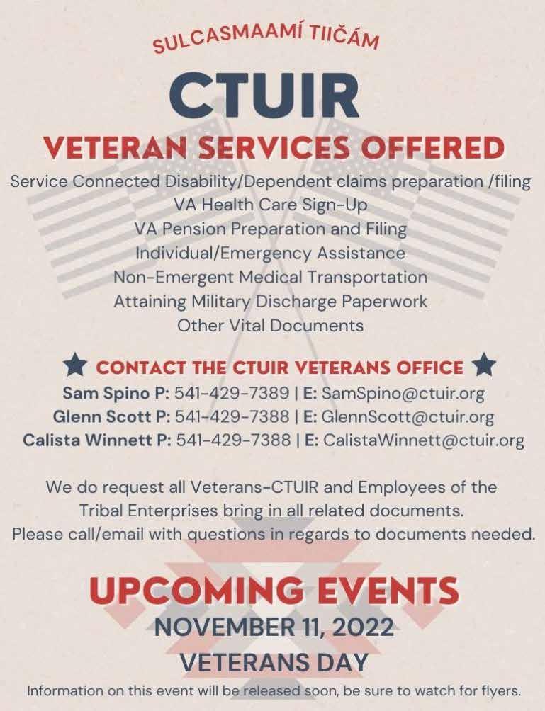 WHEREAS, the Tribal members of the Confederated Tribes of the Umatilla Indian Reservation of Oregon; have a great admiration and the utmost gratitude for Native American men and women, as well as all veterans , who have selflessly served their country and this com munity in the armed forces; and