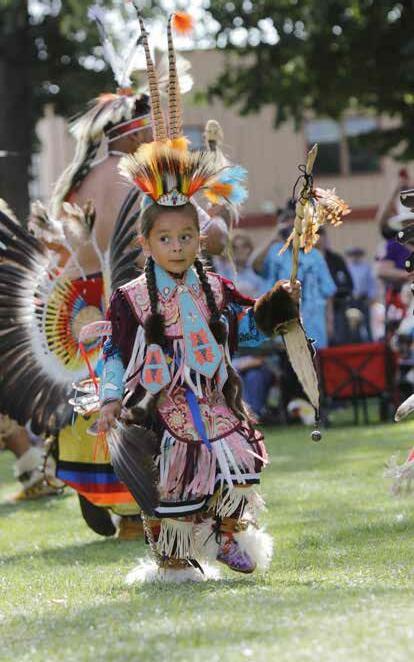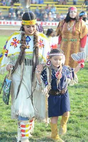 Ashlianne Moffett, holds daughter Mona Moffett’s, right, hand while they dance together during the arena portion of the Pendleton Round-Up Sept. 16. Ashlianne was awarded best dressed during one day of the 2019 event when she had Mona in her baby board held on her back. The arena has first through third awards for best men’s dancer and a daily best-dressed winner for women. They are awarded at the end of the event daily.