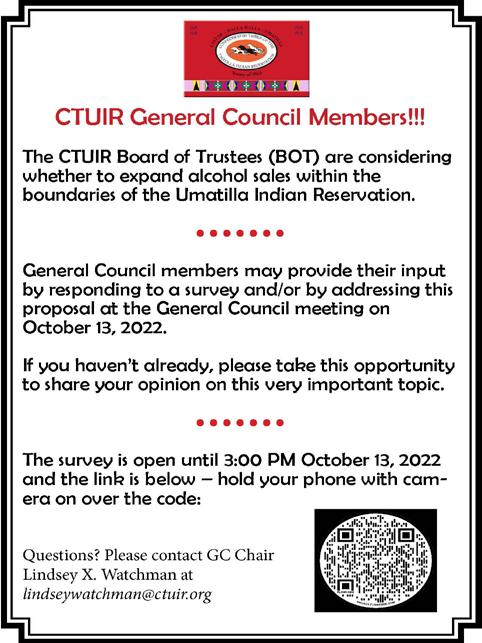 The decision came after a public outcry for inclusion of the Tribes’ mem bership, according the General Council Chair Lindsey Watchman. Watchman said after the Board’s plan to vote on le galizing alcohol sales at Mission Market and Arrowhead Travel Plaza (Arrow head) was printed on the front page of the September Confederated Umatilla Journal , Tribal members started making phone calls and writing emails to express their concerns.