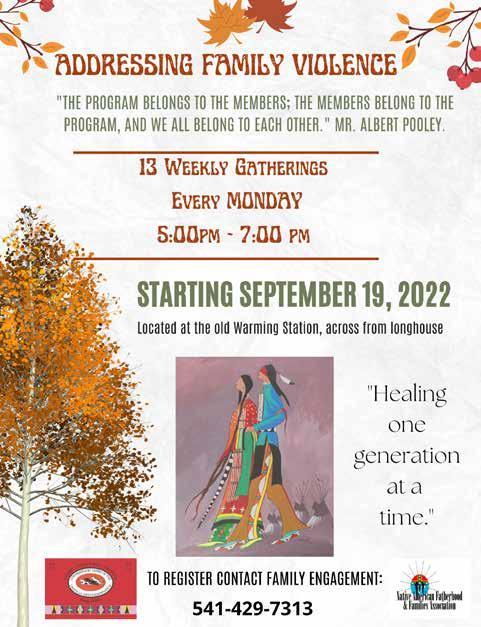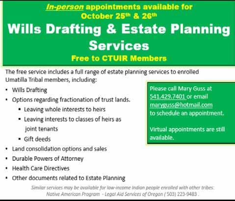 The meeting is changed from its reg ular first Friday time slot due to seniors scheduled to be on travel back to Mission from the Coeur d’Alene Elders dinner. CTUIR elders over the age of 60 by Octo ber 1 will be sent a one-time payment of $211.25 to assist them with winter energy expenses. The assistance checks will be mailed by Oct. 10.