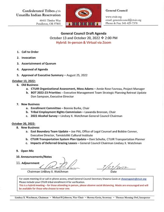 OFFICIAL TRIBAL ADDRESS AND TELEPHONE NUMBER: Confederated Tribes of the Umatilla Indian Reservation, 46411 Timíne Way, Pendleton, Oregon 97801, (541) 2763165 and Facsimile (541) 276-3095. MOTION: Sally Kosey moves to adopt Resolution 22-081 as amended. Sandra Sampson seconds. Discussion: correct amount to $30,000 in second Resolved and that dues to paid from Contingency Fund. Question. Motion carries 7-0-0. Other Board Action Items: None.