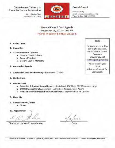 MISSION – The 2023 budget for the Confederated Tribes of the Uma tilla Indian Reserva tion (CTUIR) was approved unani mously by the Board at the November 7 Board meeting.