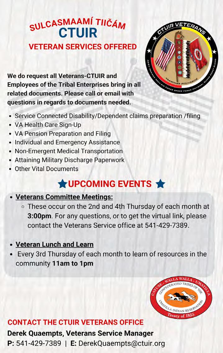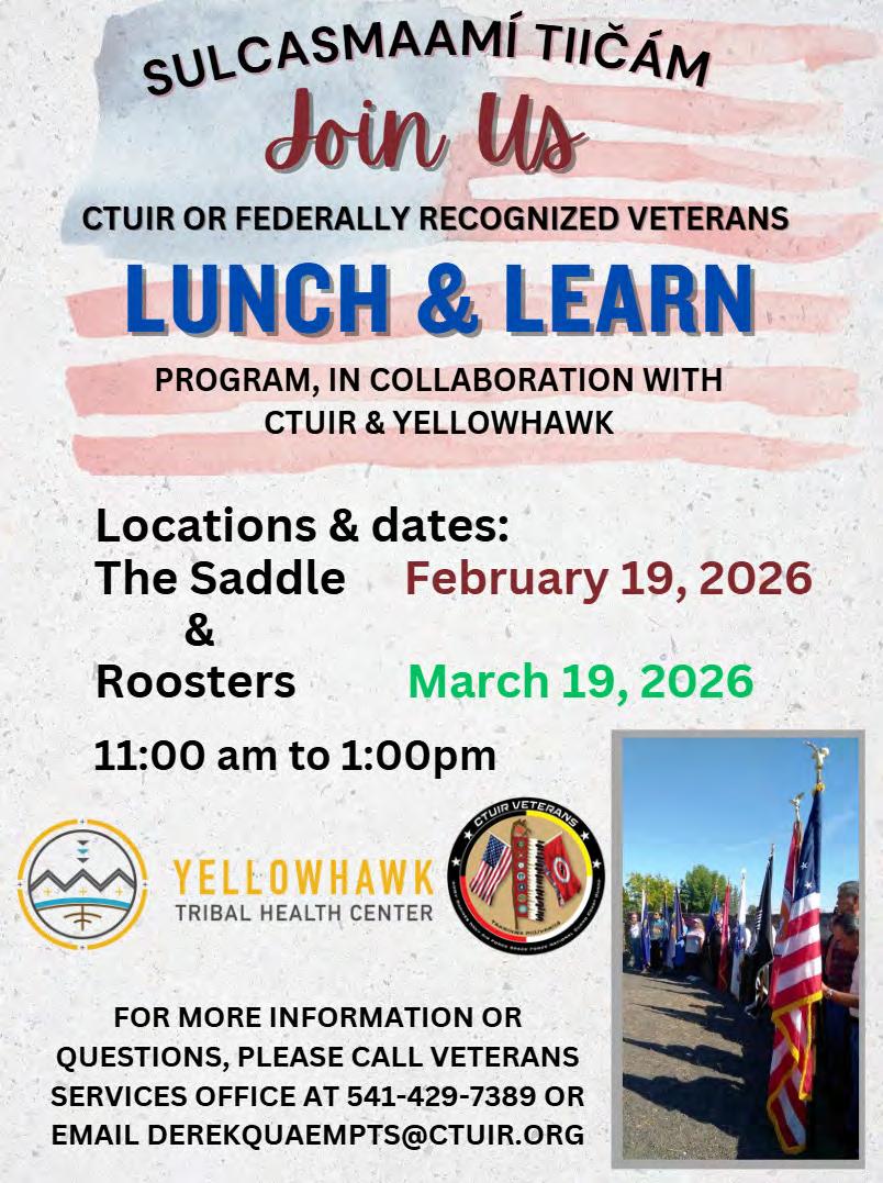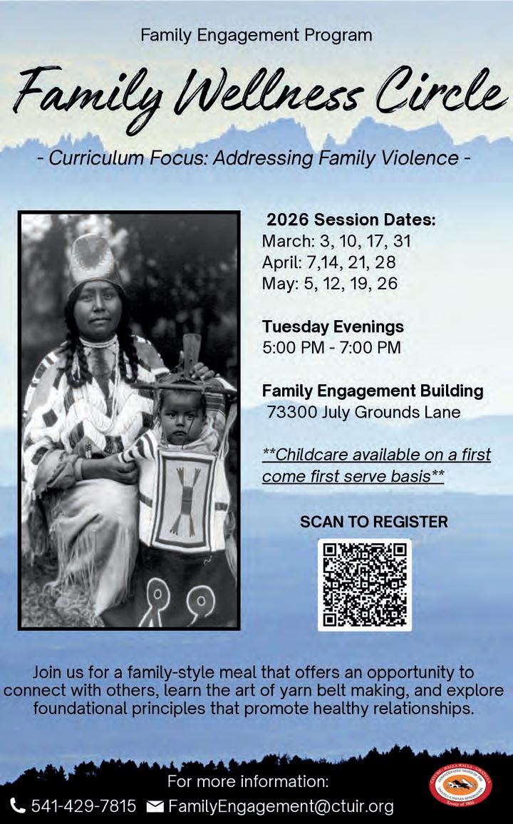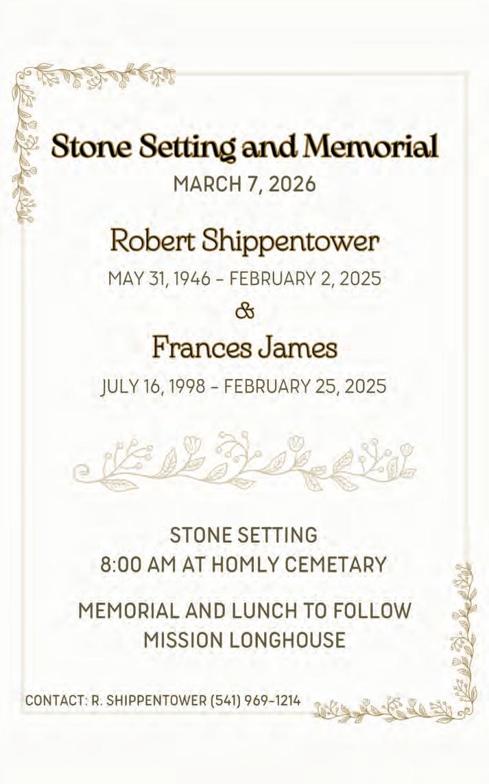 SUBSCRIBE: The CUJ is free to pick up at tribal entities and area businesses. However, a mailed subscription can be purchased for the price of shipping and handling by contacting the CTUIR Finance Department. Call 541-429-7150 or visit the Finance Department in person at Nixyáawii Governance Center, 46411 Timíne Way, Pendleton. One Year: $15 Two Years: $28