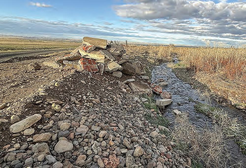 On the dump site Jan. 8, 2026, piles of debris, including concrete, dirt, logs and paper, stretch about a quarter mile along South Coyote Creek near the end of South Market Road on the Umatilla Reservation in Mission. (Yasser Marte/The CUJ)