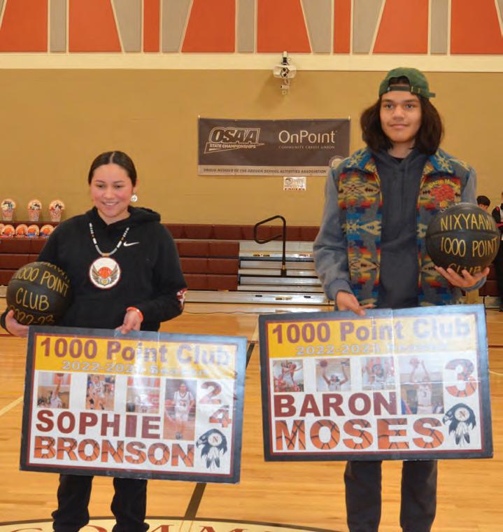 Nixyáawii Community School Seniors Sophie Bronson and Baron Moses were inducted into the 1000-point club, for scoring, on February 17, 2023.