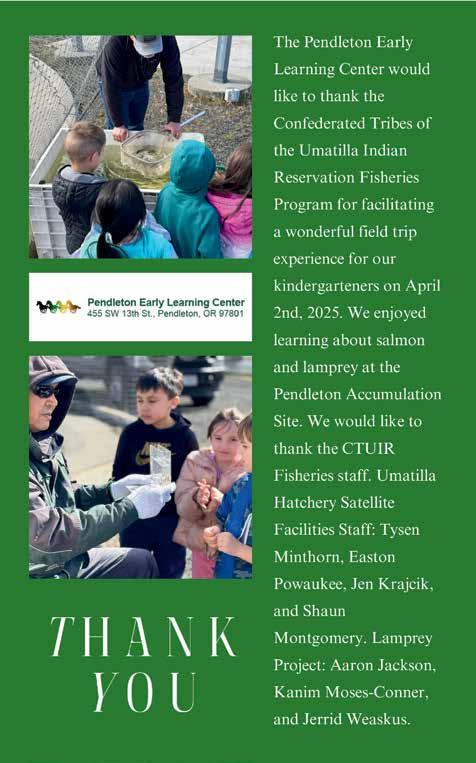 must ensure there are enough fish for ceremonial purposes throughout the year. With the 2025 spring Chinook run estimated at only 122,500, the CTUIR’s portion is approximately 1,500 after sharing the allowable harvest with the Confederated Tribes and Bands of the Yakama Nation, Confederated Tribes of Warm Springs and the Nez Perce Tribe.
