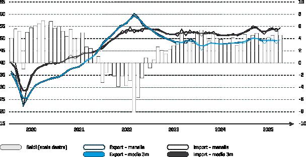 Flussi commerciali con l’estero Gennaio 2020 – Settembre 2025, dati mensili e medie mobili a tre mesi, dati destagionalizzati e saldi in miliardi di euro