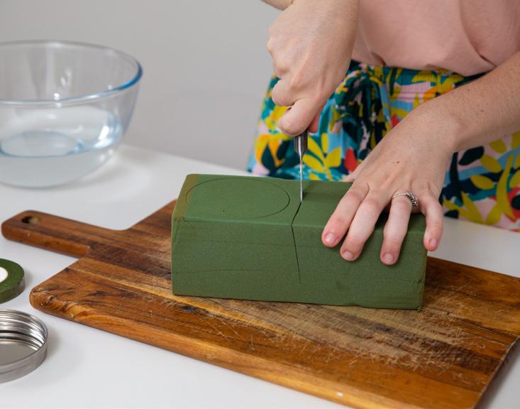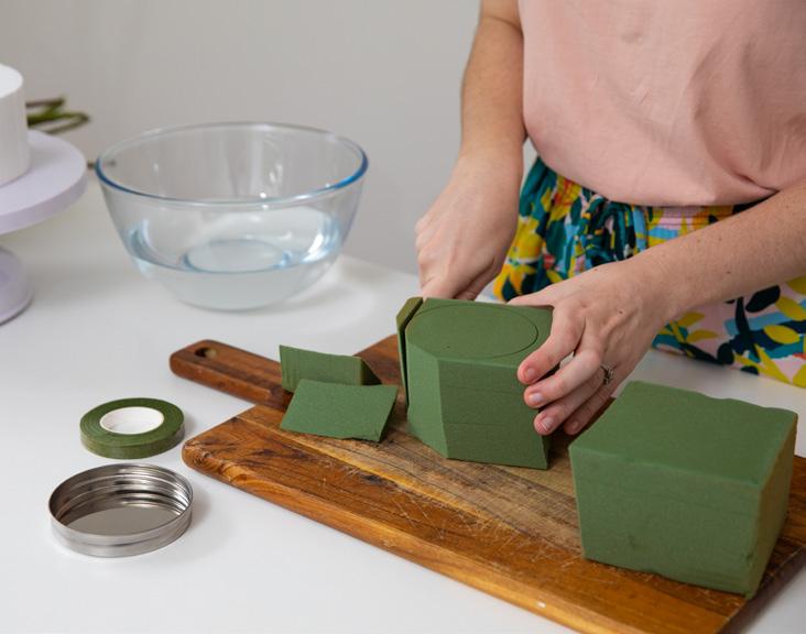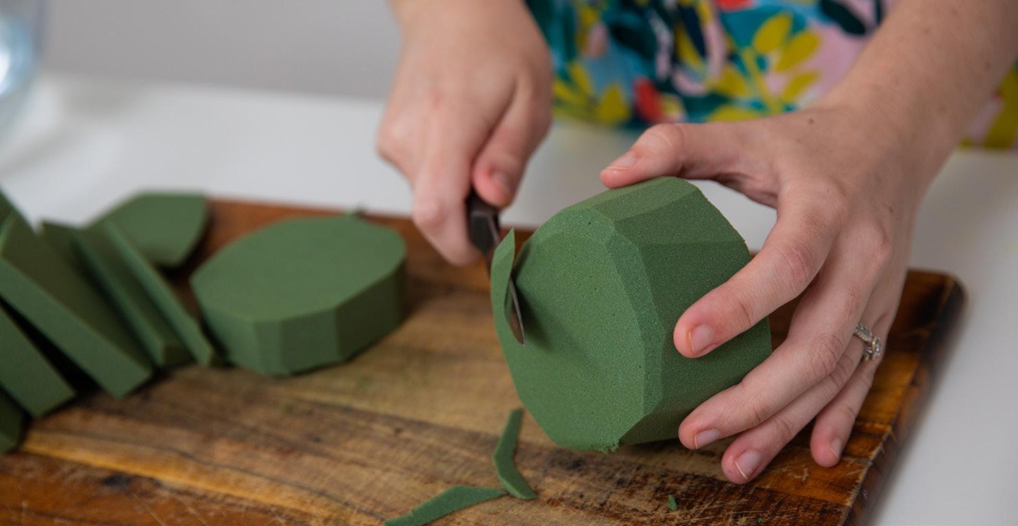 We also want the top of our foam to sit more curved and rounded to make it easier for us to place our flowers. Cut around the top edge of your foam (getting rid of those sharp sides) until it has that rounded edge. 2