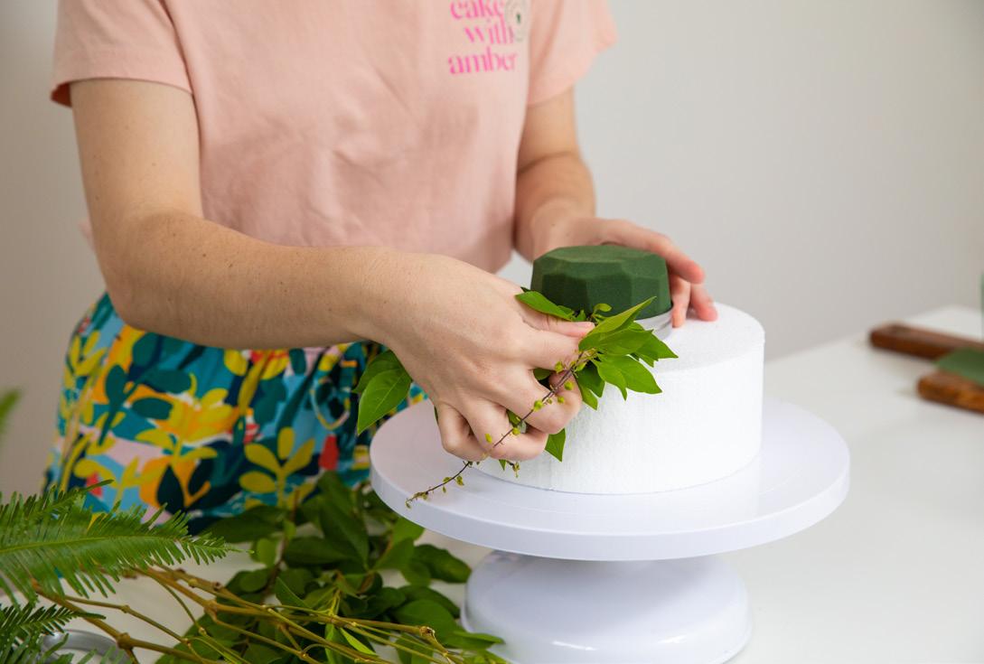 Once you’ve established the bottom edge with greenery, it’s time to add in your feature flowers. These can be positioned anywhere on your topper to draw your eye! Feel free to stagger these flowers and use odd numbers for something more natural and freeform.