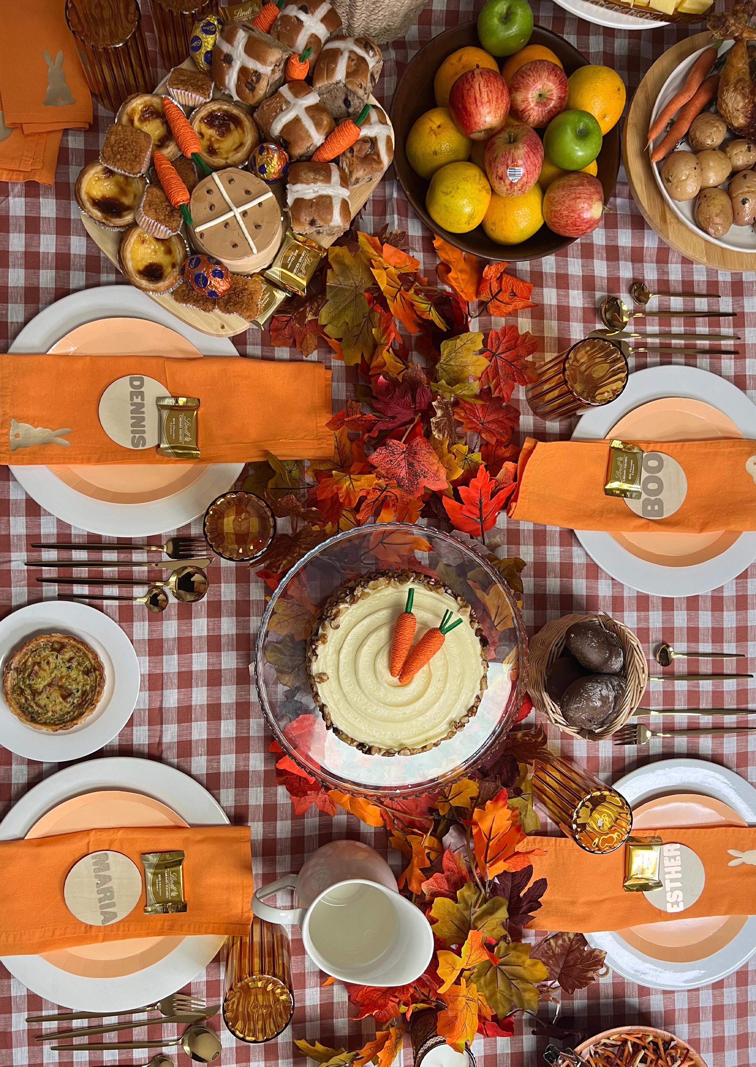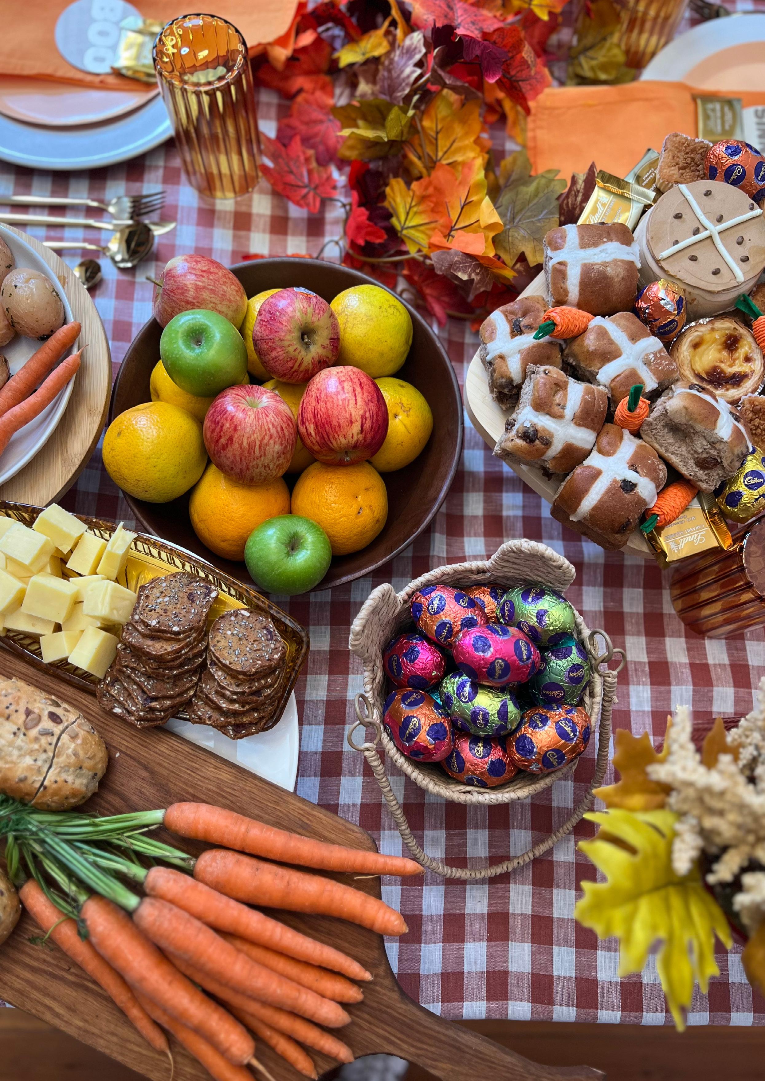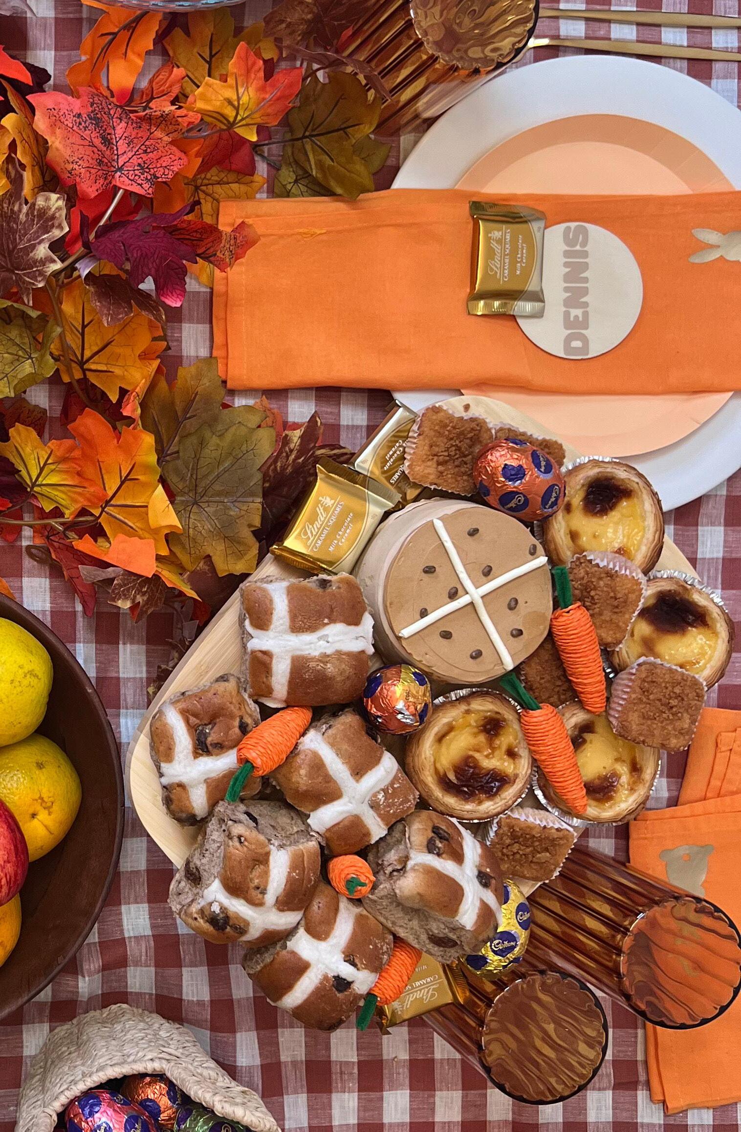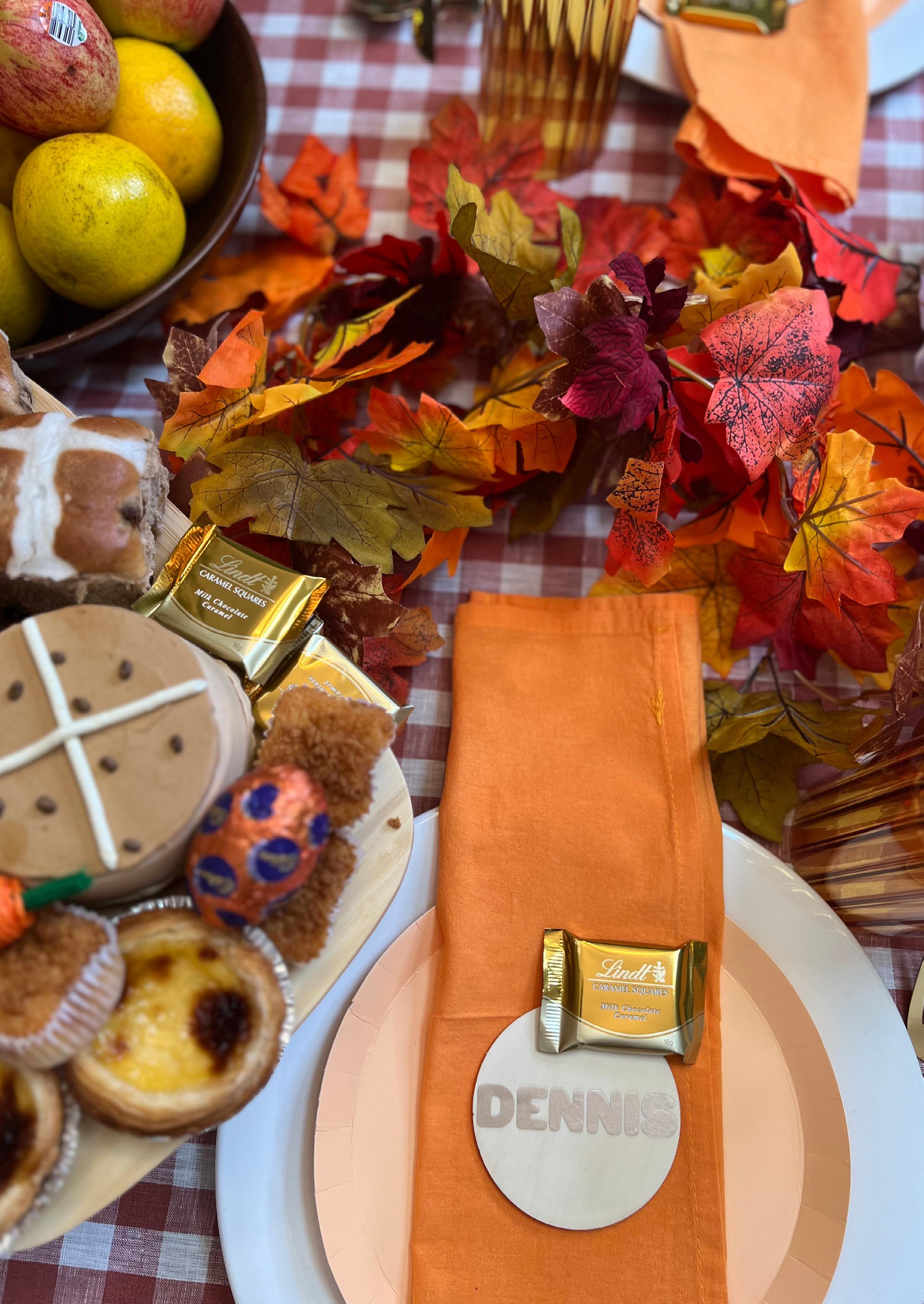 We started with white and peach plates, gold cutlery and on-trend orange glasses. Autumn leaves embellished the table which was then laden with a delicious roast, earthy veggies, a rustic grazing platter, fresh fruit and a sweets display featuring hot cross buns, tarts and more.