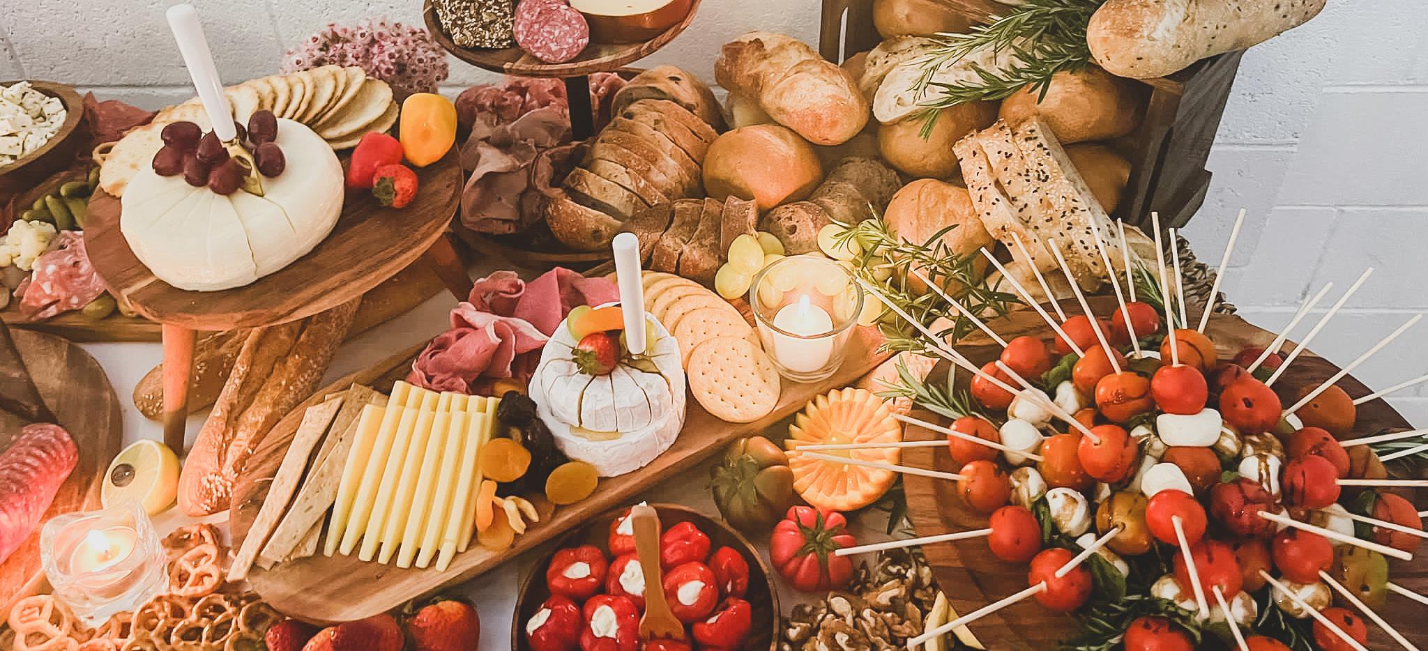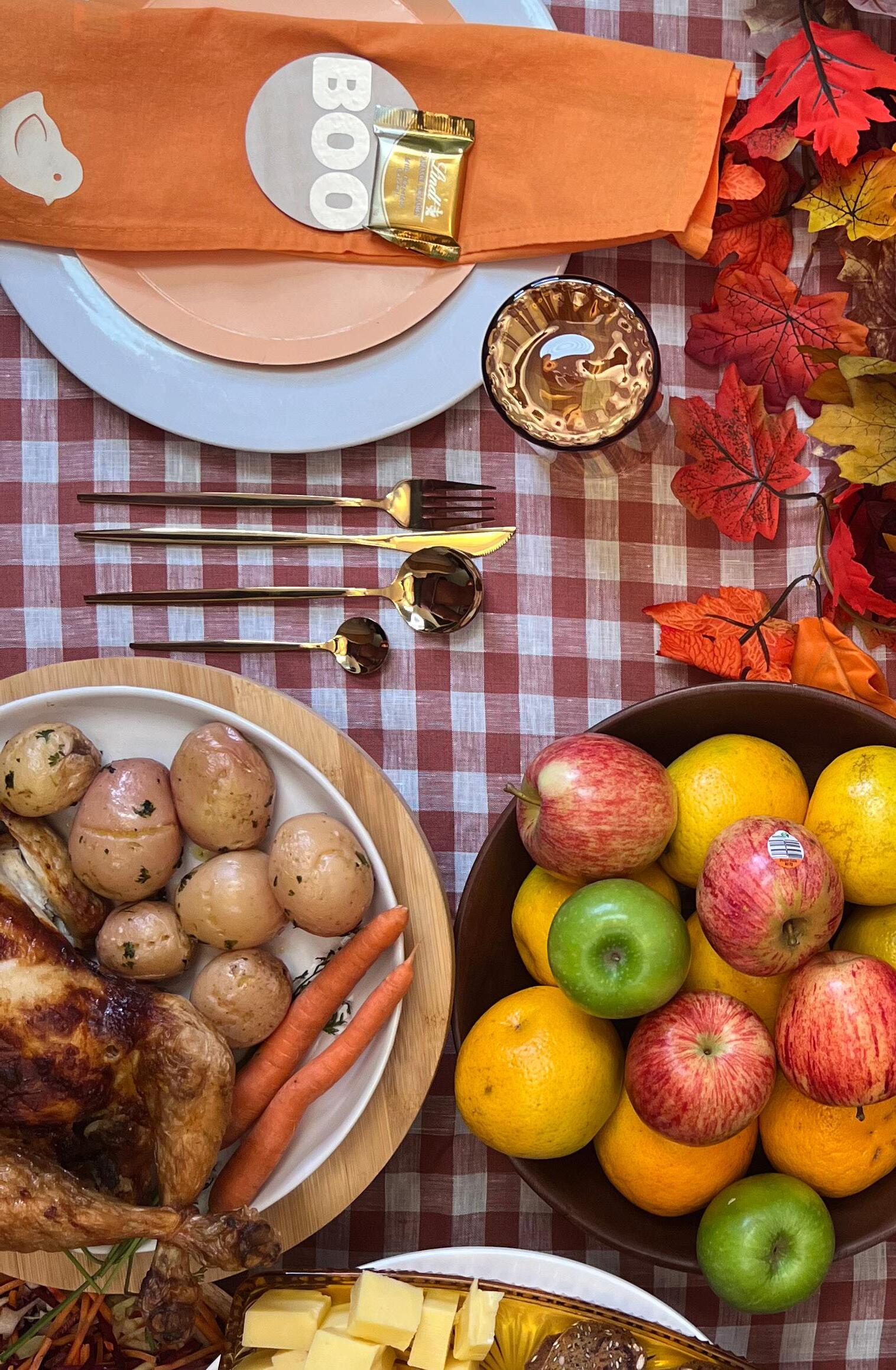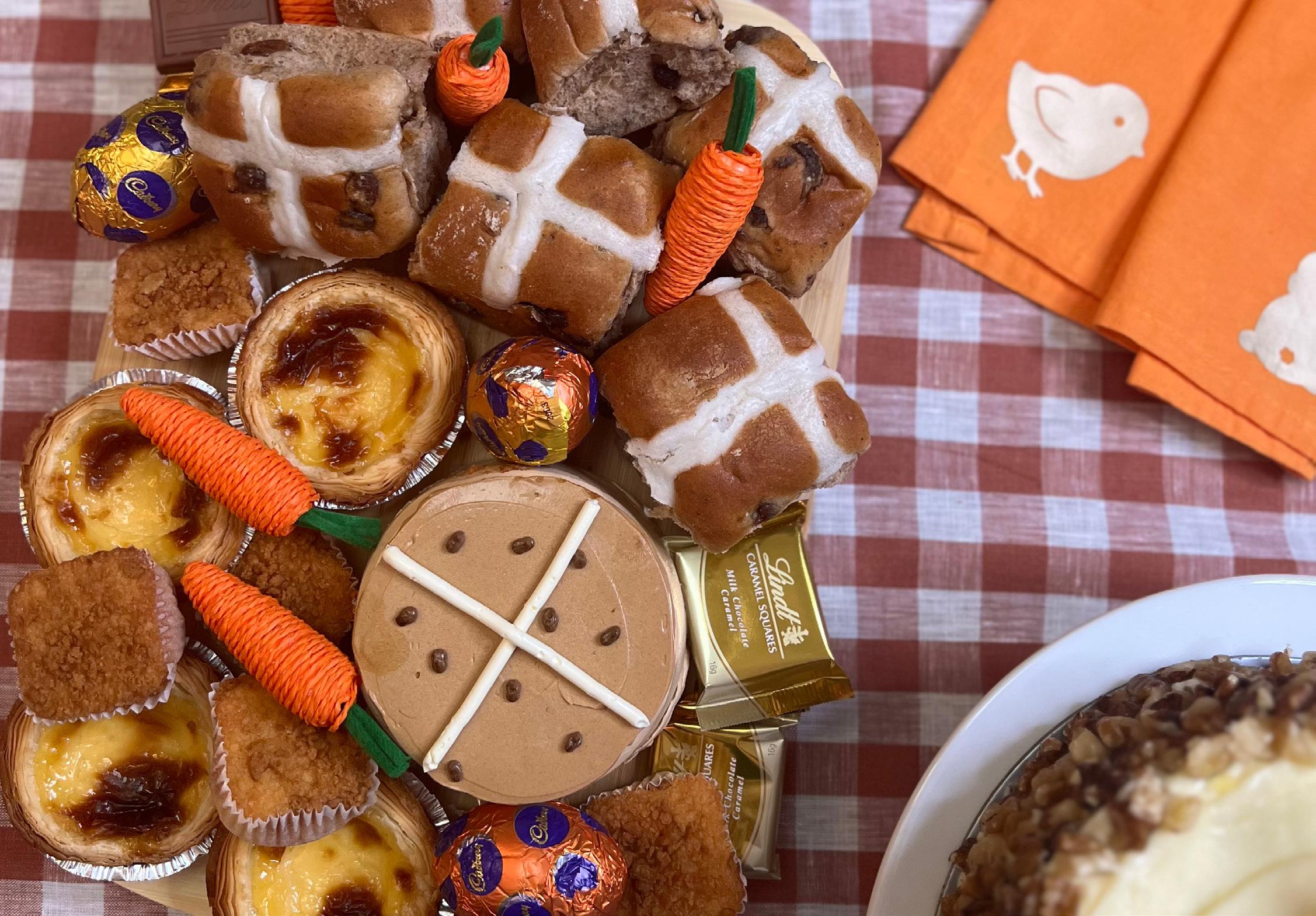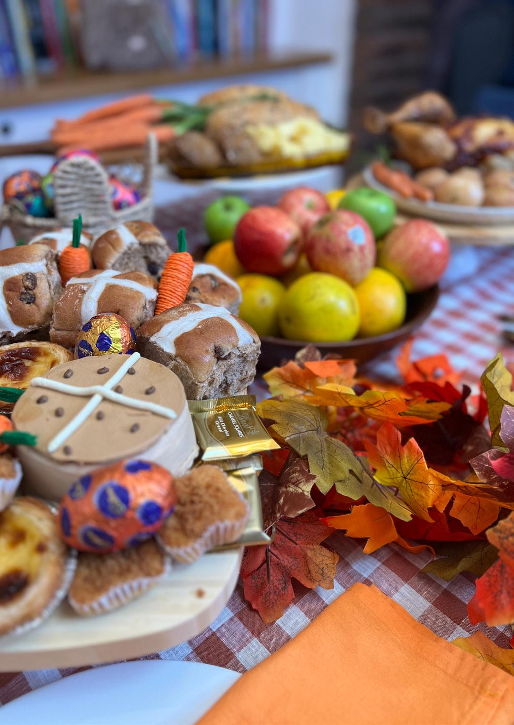 We started with white and peach plates, gold cutlery and on-trend orange glasses. Autumn leaves embellished the table which was then laden with a delicious roast, earthy veggies, a rustic grazing platter, fresh fruit and a sweets display featuring hot cross buns, tarts and more.