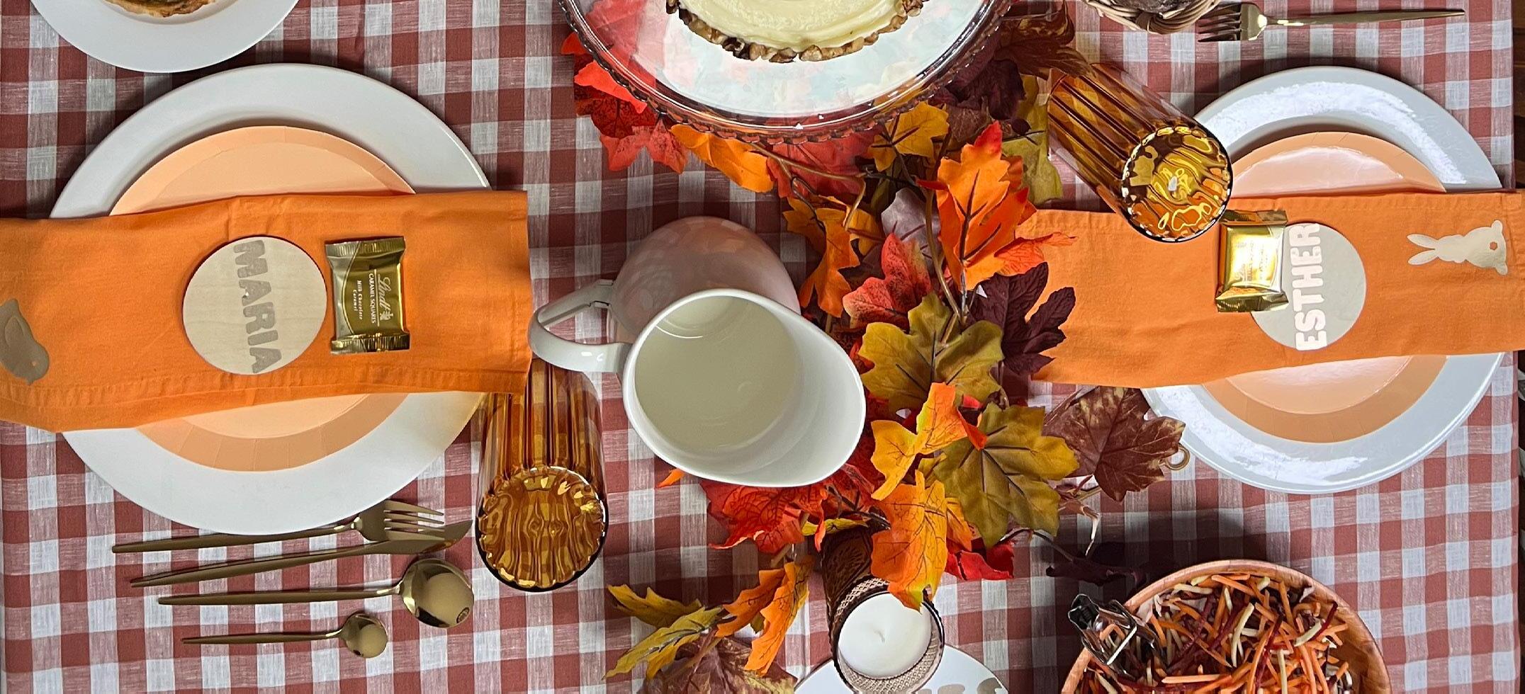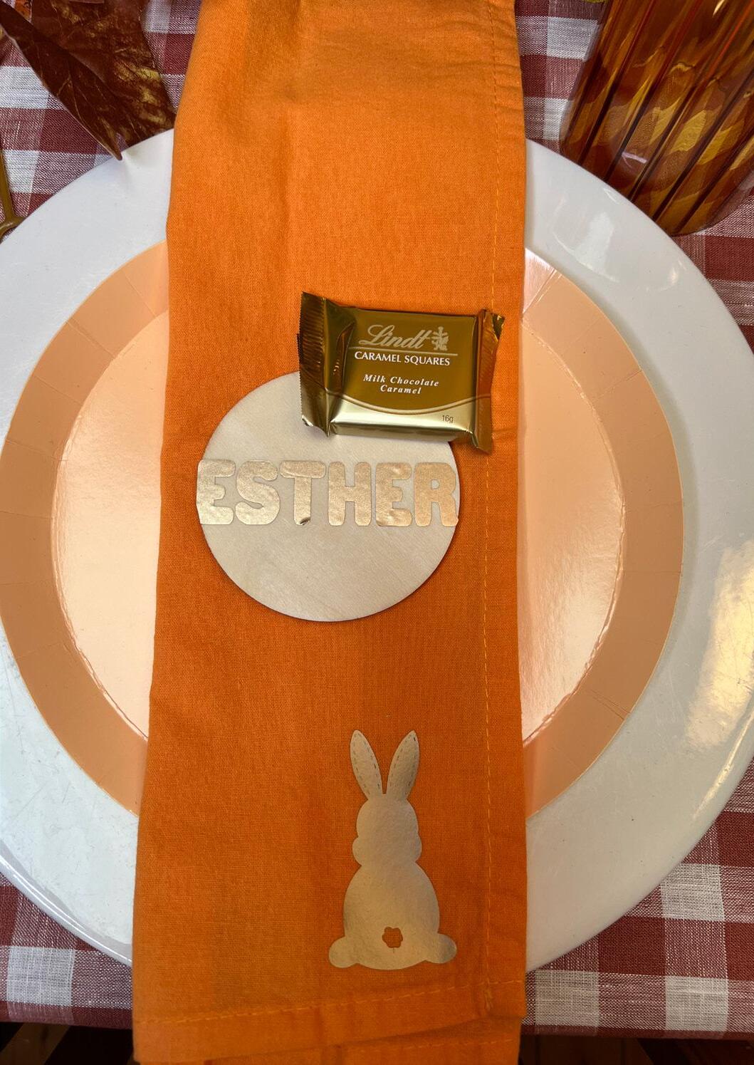 On trend gingham set the base for the table, in a stunning amber shade. The table was topped with tangerine bright cloth napkins, customised with cute bunny and chick silhouettes in gold using our Cricut Maker and Heatpress.