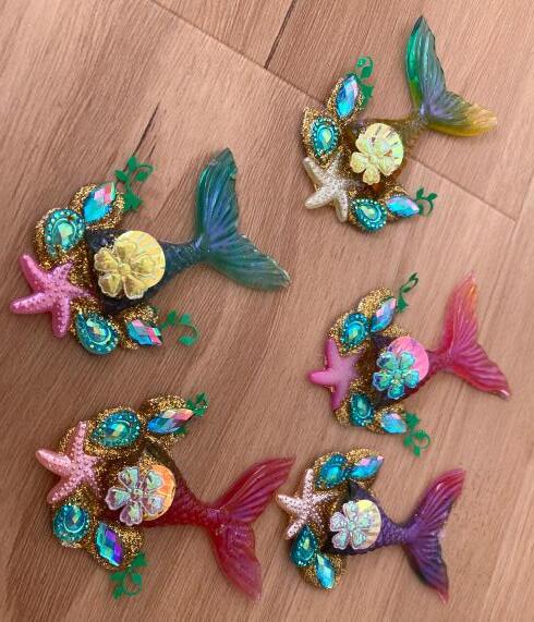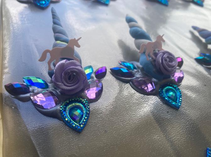 I go beyond the face jewels and create by hand a variety of bling. My most popular is the 3D unicorn horns which I create using silk clay. Once dried, they are added together with other gems and items using tulip fabric paint. It is best to use plastic sleeves or wax baking paper as when they dry, the bling peels off easily meaning that you can reuse the sleeve or paper.