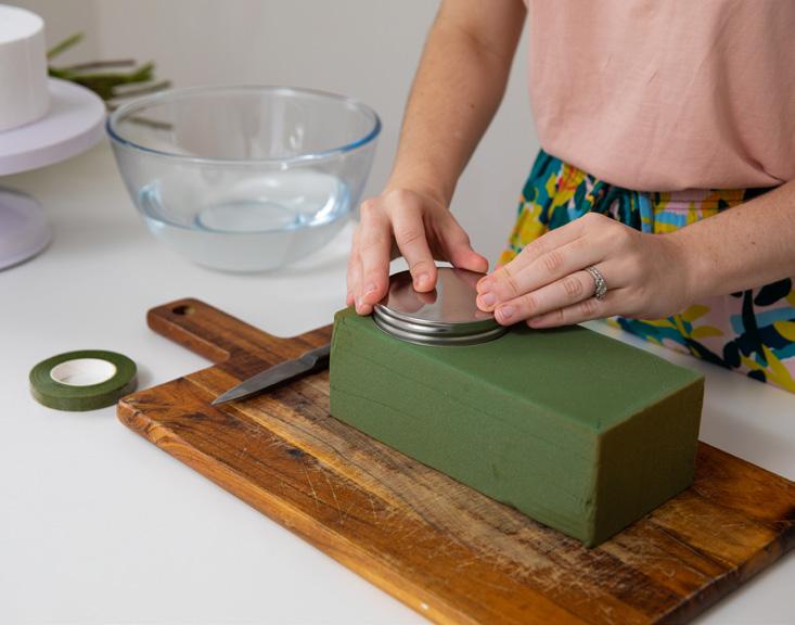 We’re going to start our flower cake topper by creating the base for our flowers to sit in. This will involve using our jar lid and floral foam - the jar lid will sit on our cake and hold the floral foam in place, which is where our flowers will be inserted.
