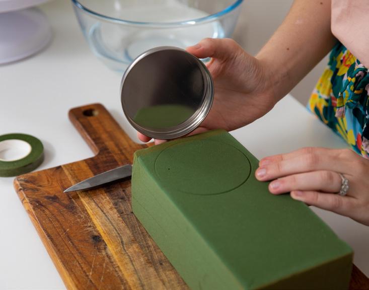 We want to start by cutting our floral foam to the size and shape of the jar lid. Press your jar lid lightly into the foam to create an impression. Using your knife, and the impression as a guide, cut your foam to size. We want the foam to fit nice and snug in that jar lid!