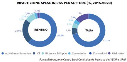 I settori ICT, elettronica, alimentare, meccanica e tessile registrano incidenze superiori alla media italiana, a conferma del ruolo guida dell’industria nel sistema innovativo trentino.