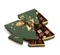 Five assorted Christmas trees made from exquisite chocolate presented in a gift set.