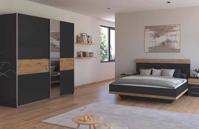CHAMBRE OPERA. Coloris gris métal/chêne artisan. Armoire 2 portes coulissantes, L 218 cm. Code 0300139. 799,50€ 399,75€ Lit pour couchage 160x200 cm (hors literie) avec éclairage et 2 chevets inclus. Code 0300140. 699,50€ 349,75€
