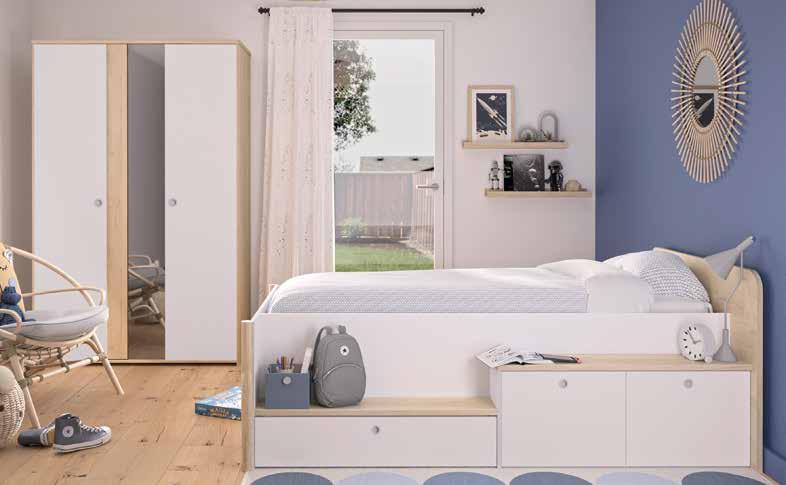 CHAMBRE MATIS. Coloris chataigner naturel et blanc. Armoire 2 portes. 129,4x201,6x59,8 cm. Code 04001027. 529,50€ 370,65€ Lit compact pour couchage 90x200 cm (sans literie). Avec tiroirs de rangement. 124,7x207,6x59,9/80 cm. Code 04001028. 399,99€ 279,99€ Bureau. 135,8x56x75 cm. Code 04001029. 269,99€ 188,99€ Chevet 1 porte.