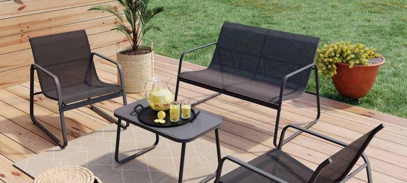 01 SALON DE JARDIN RIVA. Coloris anthracite. Métal et textilène. Ensemble 4 pièces : canapé+table basse+2 fauteuils. Canapé. 114x75,5x76,5 cm. Table basse. 75x41x44,5 cm. Fauteuil. 61x75,5x76,5 cm. Code 747170. 02 SALON DE JARDIN SAIGNON Coussins 100% polyester. Matière métal. Table basse avec plateau en verre. 71x41x40 cm. Canapé 2 places 2 fauteuils. Code 766813. 03 SALON DE JARDIN BELEM Structure en métal, assise et dossier en tissu 100% polyester. Code 766755. 04 BAIN DE SOLEIL YUCA Relax coloris gris. Acier, métal et textilène. 148x85x63 cm. Code 746216. 05 BAIN DE SOLEIL RIMINI Bois hêtre et tissu gris 100% polyester. Pliant. 102x77,5x57 cm. Code 766523.