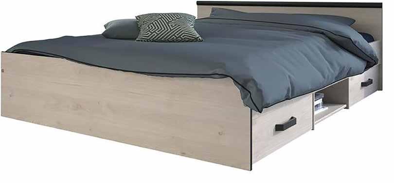 Des nuits paisibles À PRIX BRADERIE LIT NASHVILLE. Panneaux de particules 15+22 mm, chêne Jackson/black. Pour couchage 140x200 cm (sans literie).146x59x193 cm. Avec tiroirs équipés d’un système de coulisse à billes. 2 tiroirs amovibles 66x33 cm. Code 40060. -50% 29999€ 14999€ Tiroirs amovibles inclus 10