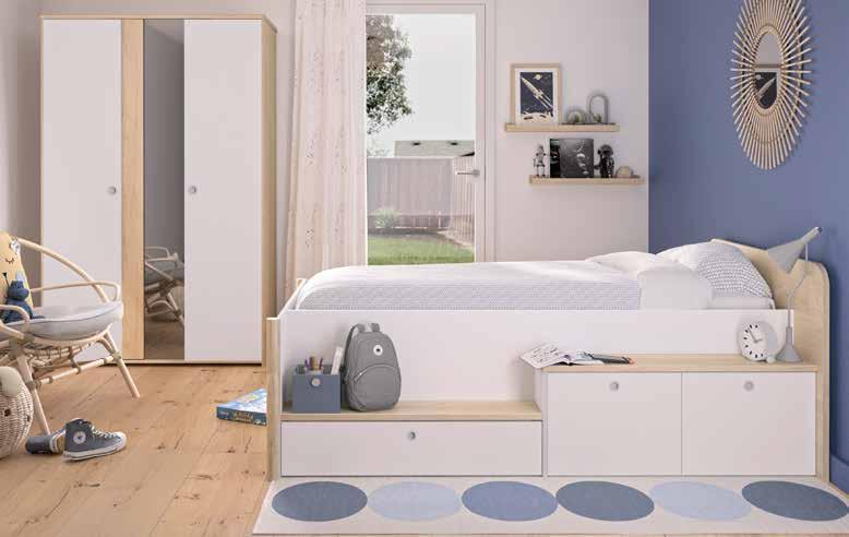 CHAMBRE ESCALE. Armoire 3 portes. 185x203x52 cm. 529,50€ 397,13€ Lit pour couchage 140x200 cm (sans literie), avec tête de lit et tablettes. 202,8x216,8x98,2 cm. Code 04001012. 365,50€ 274,13€ Lot de 2 tiroirs-lit. 199x22x51 cm. Code 04001013. 79,50€ 59,63€ Lit pour couchage 90x200 cm (sans literie). 122x89x217 cm. Code 04001014. 265,50€ 199,13€ Bureau avec 1 tiroir, 1 niche. 138x74,2x49,8 cm. Code 04001016. 259,99€ 194,99€ Commode 1 porte, 3 tiroirs. 110x77x50 cm. Code 04001015. 229,99€ 172,49€