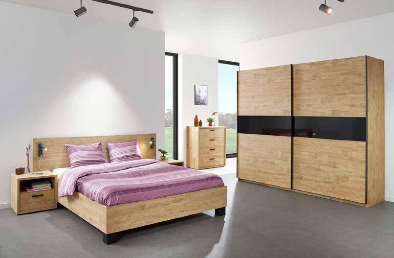 CHAMBRE SAJO. Décor champagne/chêne artisan. Armoire 2 portes coulissantes. 218x210x59 cm + Lit pour couchage 160x200 cm (sans literie) + chevets 245x102x207 cm. Code 300151. Commode 4 tiroirs+1 porte. 93x81x42 cm. Code 300152. 459,99€