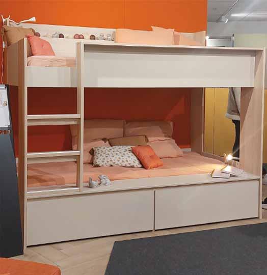 LITS SUPERPOSÉS CLARK. Coloris sable&hélia. Lit pour couchage 90x200 cm (sans matelas), inclus 2 panneaux sommiers. 2 tablettes pour fonction chevet, 2 tiroirs, 4 roulettes. 207x174x123 cm. Code 400153.
