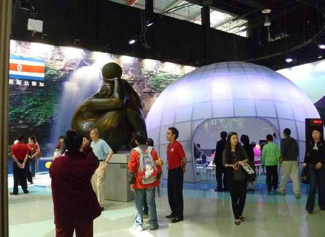 El protagonismo del pabellón recayó, sin lugar a dudas, en las esferas de piedra precolombinas. Estos símbolos, que con su simpleza abstracta re ejan la capacidad de sus creadores para considerar la esfera como algo bello, así como su gran potencial técnico, fueron representados por tres piezas del aclamado escultor costarricense Jorge Jiménez Deredia en el marco de su proyecto “La ruta de la Paz”, que tiene como objetivo reinventar los símbolos precolombinos americanos. Al momento del cierre de la Expo, estas piezas se encontraban en negociación para quedarse en la ciudad de Shanghai.