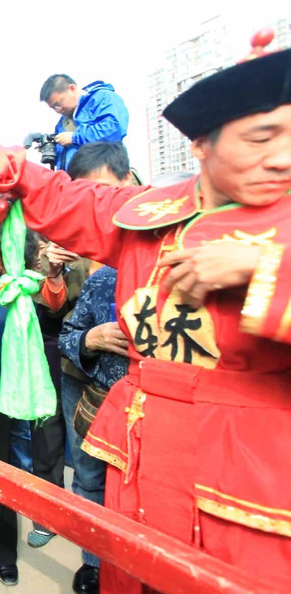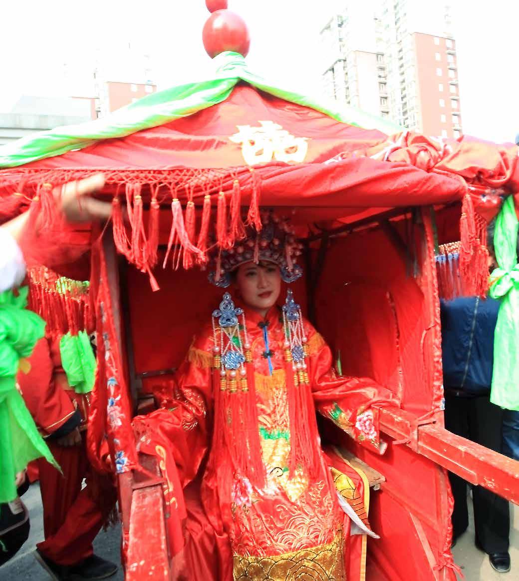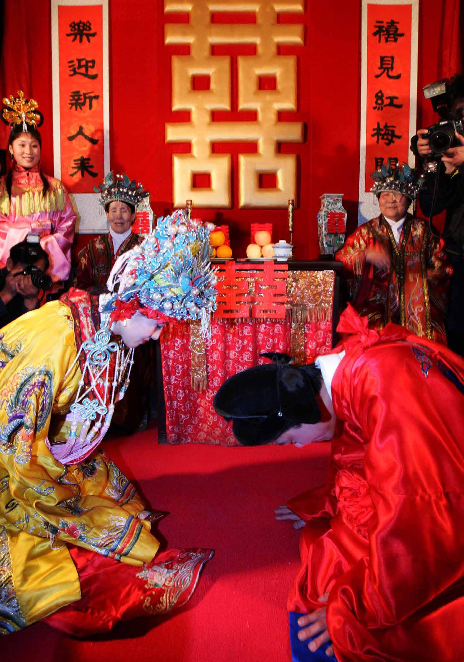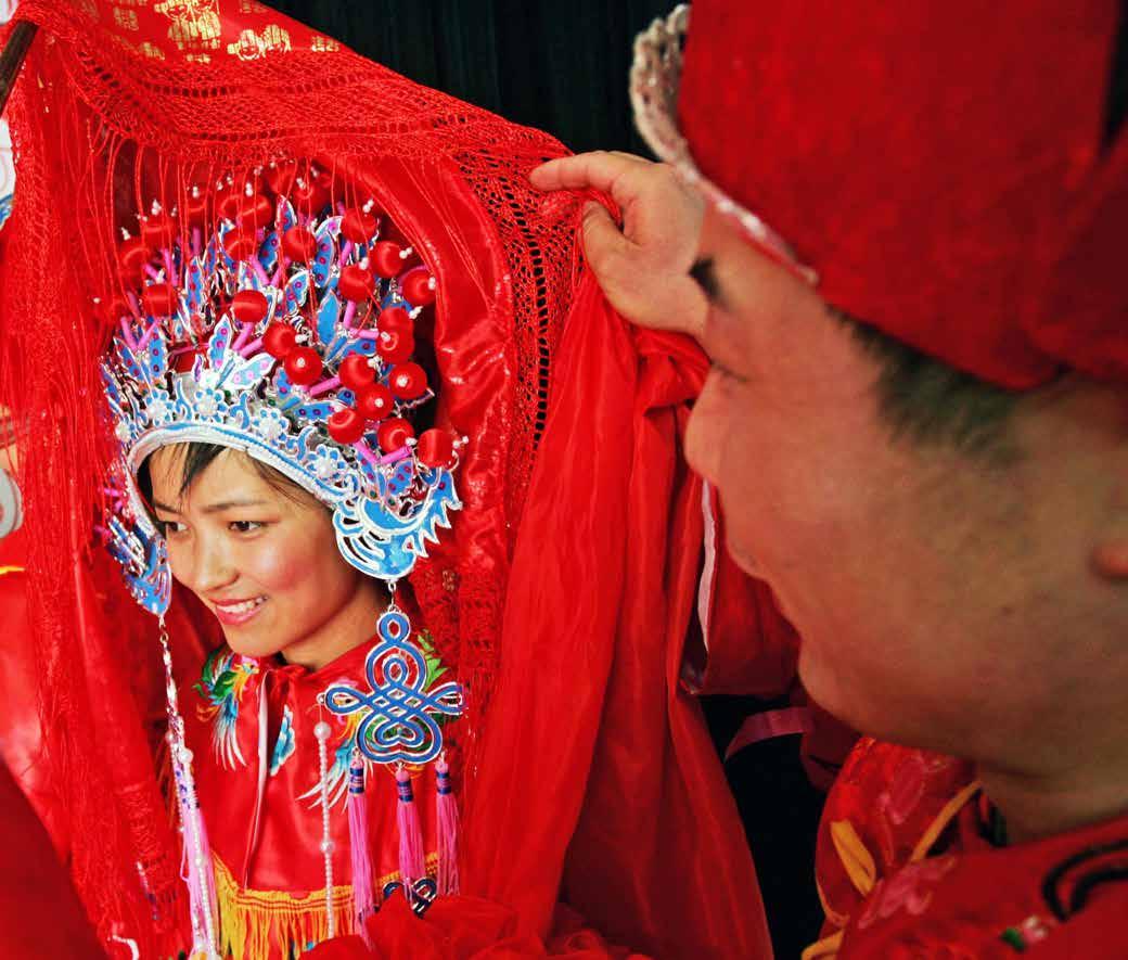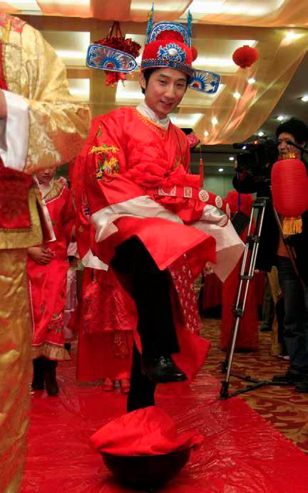 Es difícil comprender las formalidades y el protocolo a seguir durante una boda tradicional china: palanquín nupcial de un rojo intenso, un numeroso des le para arropar a la novia en su camino, disparos de flechas de buena suerte, saltos por encima de un brasero –que simbolizan llevar una vida próspera-, cabalgar sobre el lomo de un caballo –para mostrar un matrimonio sin contratiempos-, descubrir el velo de la novia –para mostrar el amor corres- pondido-, rendir culto al Cielo y a la Tierra, postrarse ante los padres para servirles té, etc.